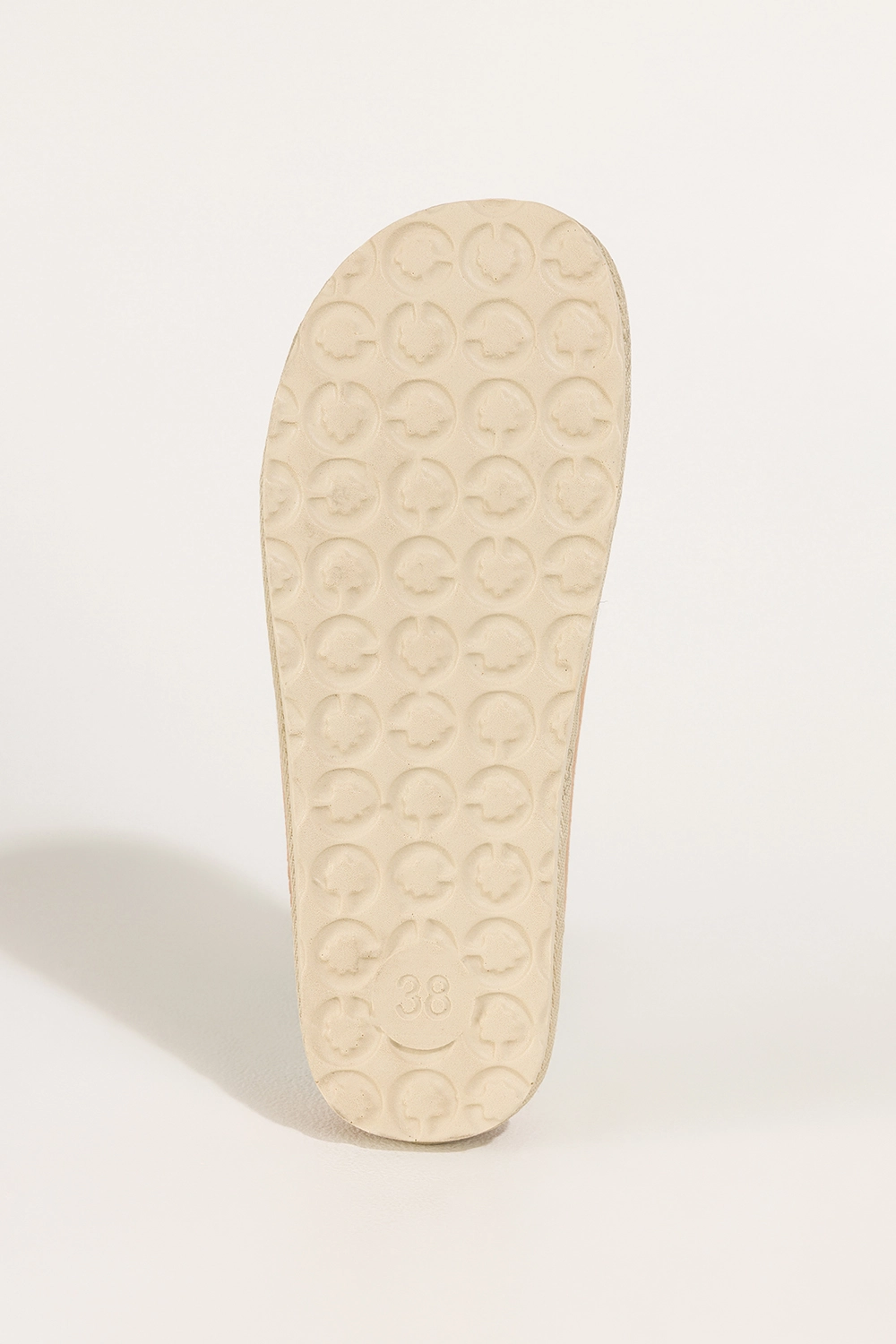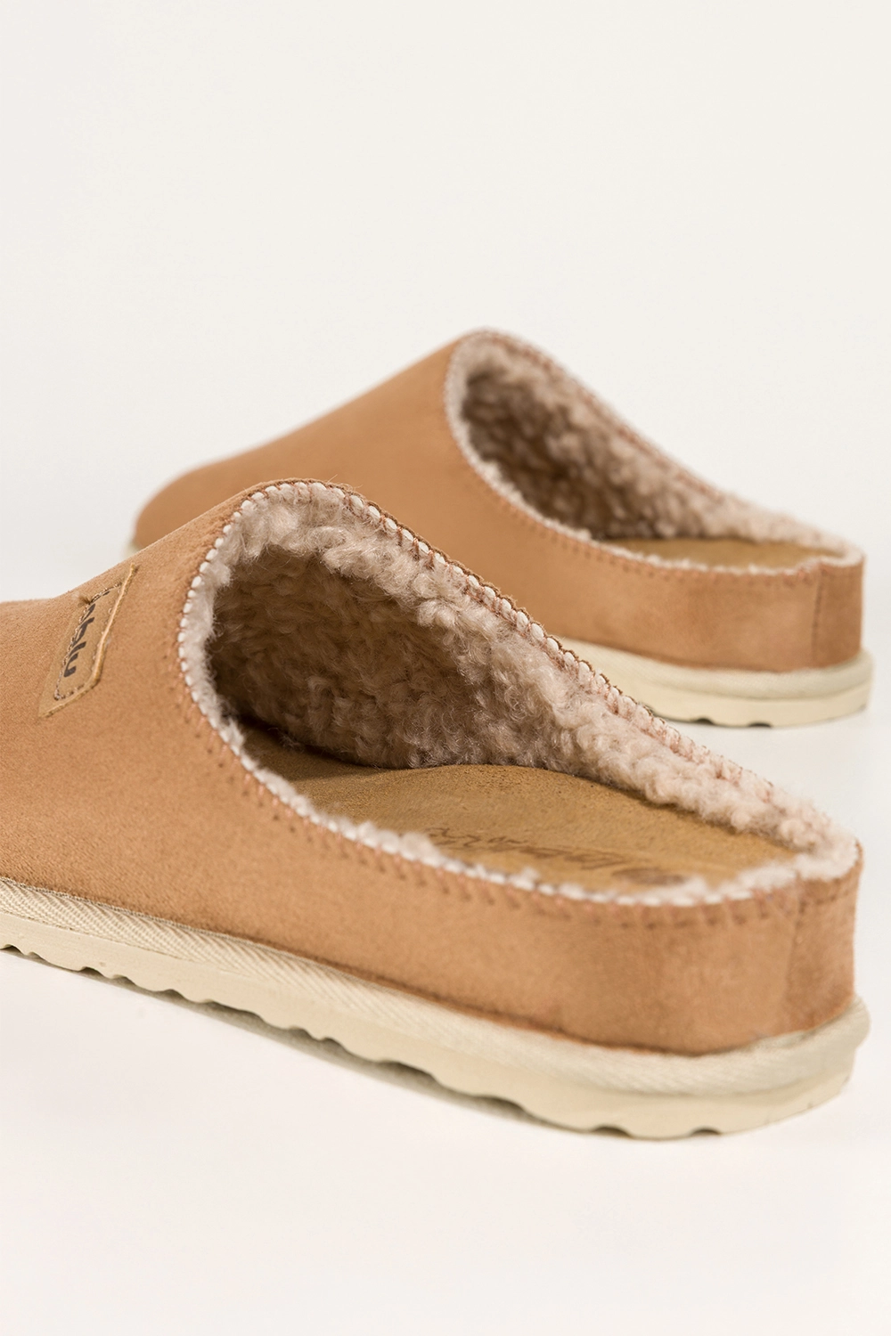 Klasyczny camelowy odcień oraz ponadczasowy, wsuwany fason z zaokrąglonym noskiem sprawiają, że kapcie doskonale komponują się z każdą domową stylizacją. Płaska podeszwa oferuje stabilność, a staranne wykończenie podkreśla ich elegancki charakter, nawet w casualowym wydaniu.