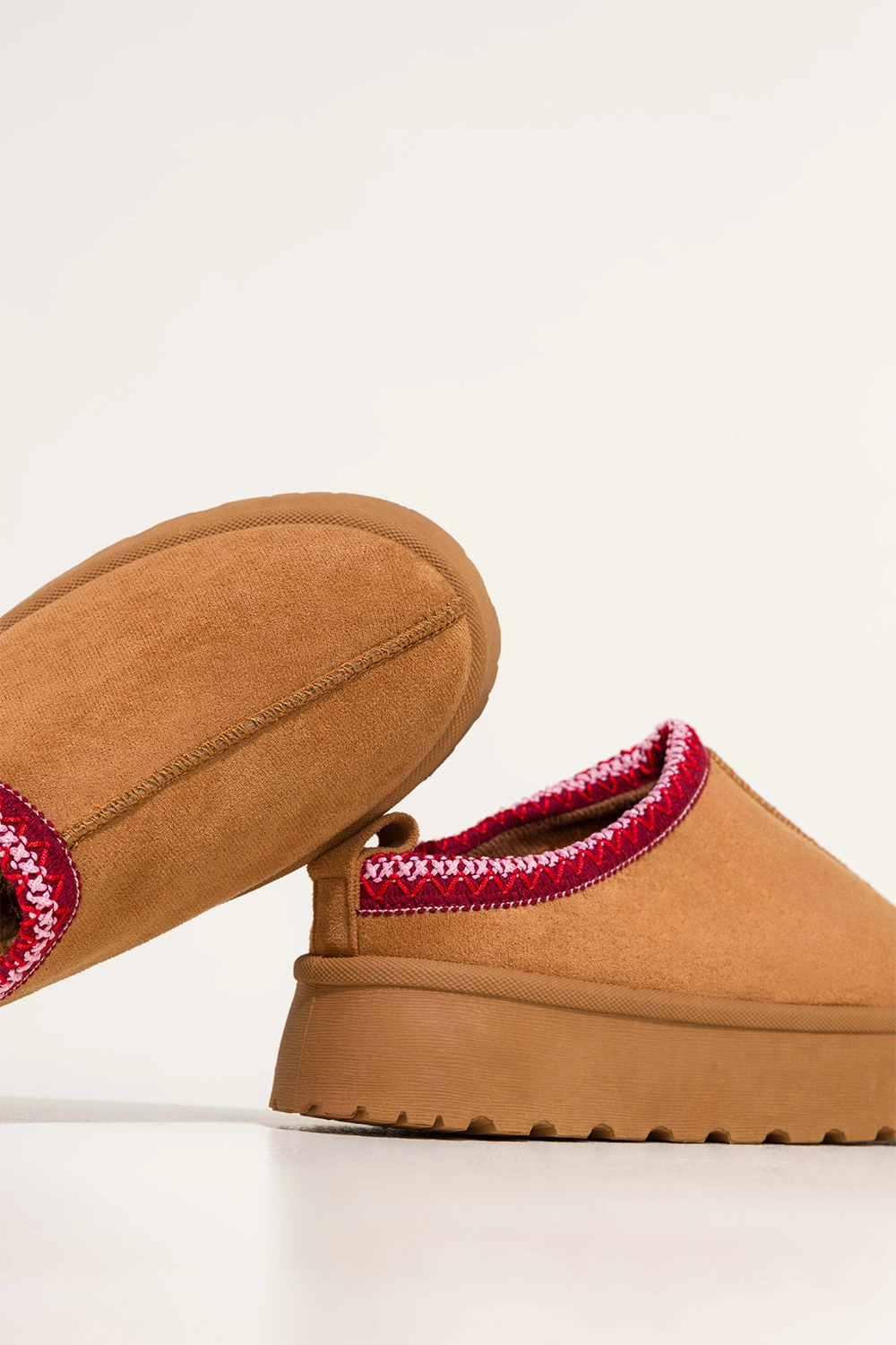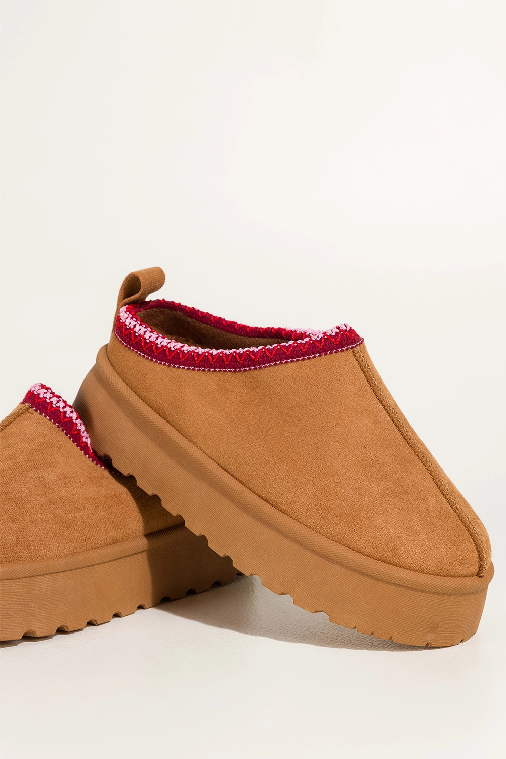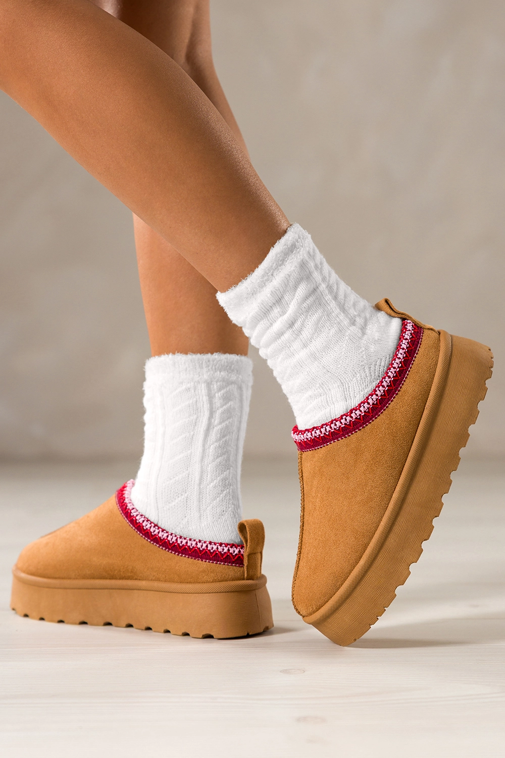 Camelowe kapcie damskie z futerkiem na platformie ozdobne obszycie Casu model 1078. Wykonane z miękkiej, zamszowej skóry ekologicznej o wysokiej jakości, gwarantują trwałość i przyjemność noszenia przez długi czas. Ocieplone miękkim, puszystym futerkiem, idealnie otulają stopy, zapewniając ciepło nawet w najchłodniejsze dni. Wsuwana konstrukcja oraz zaokrąglony nosek sprawiają, że kapcie dopasowują się do stopy, nie powodując ucisku. To idealne obuwie domowe dla kobiet, które cenią sobie komfort i wysoką jakość materiałów.