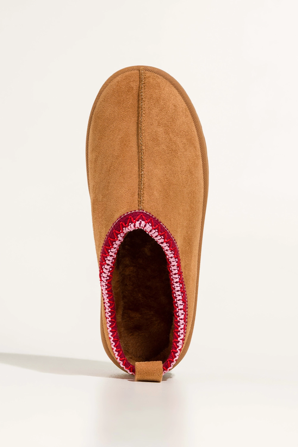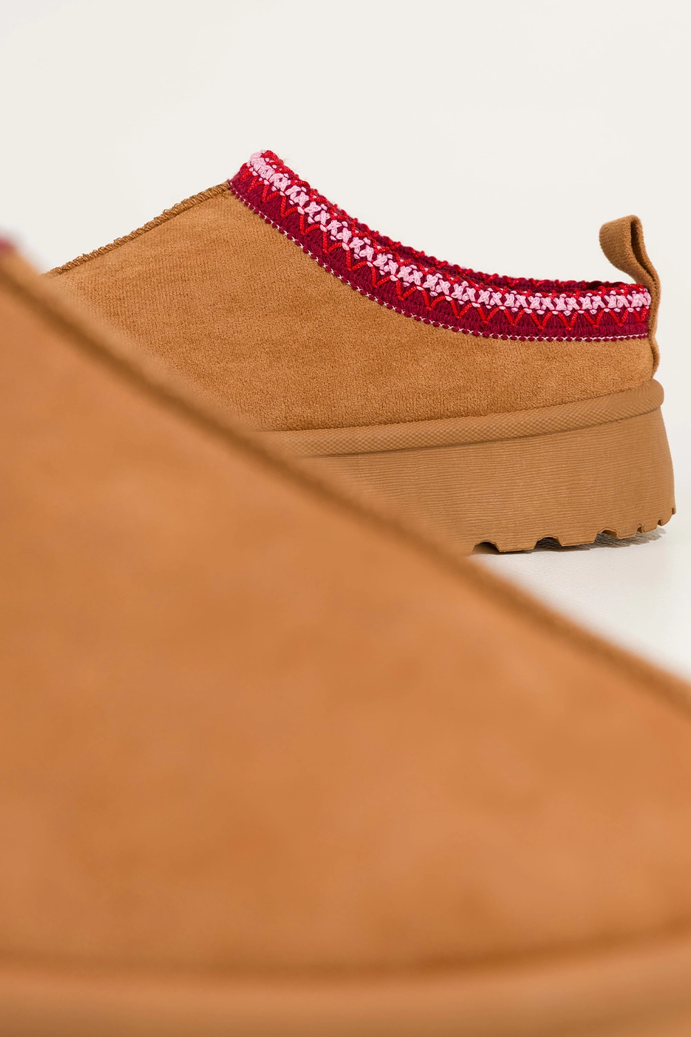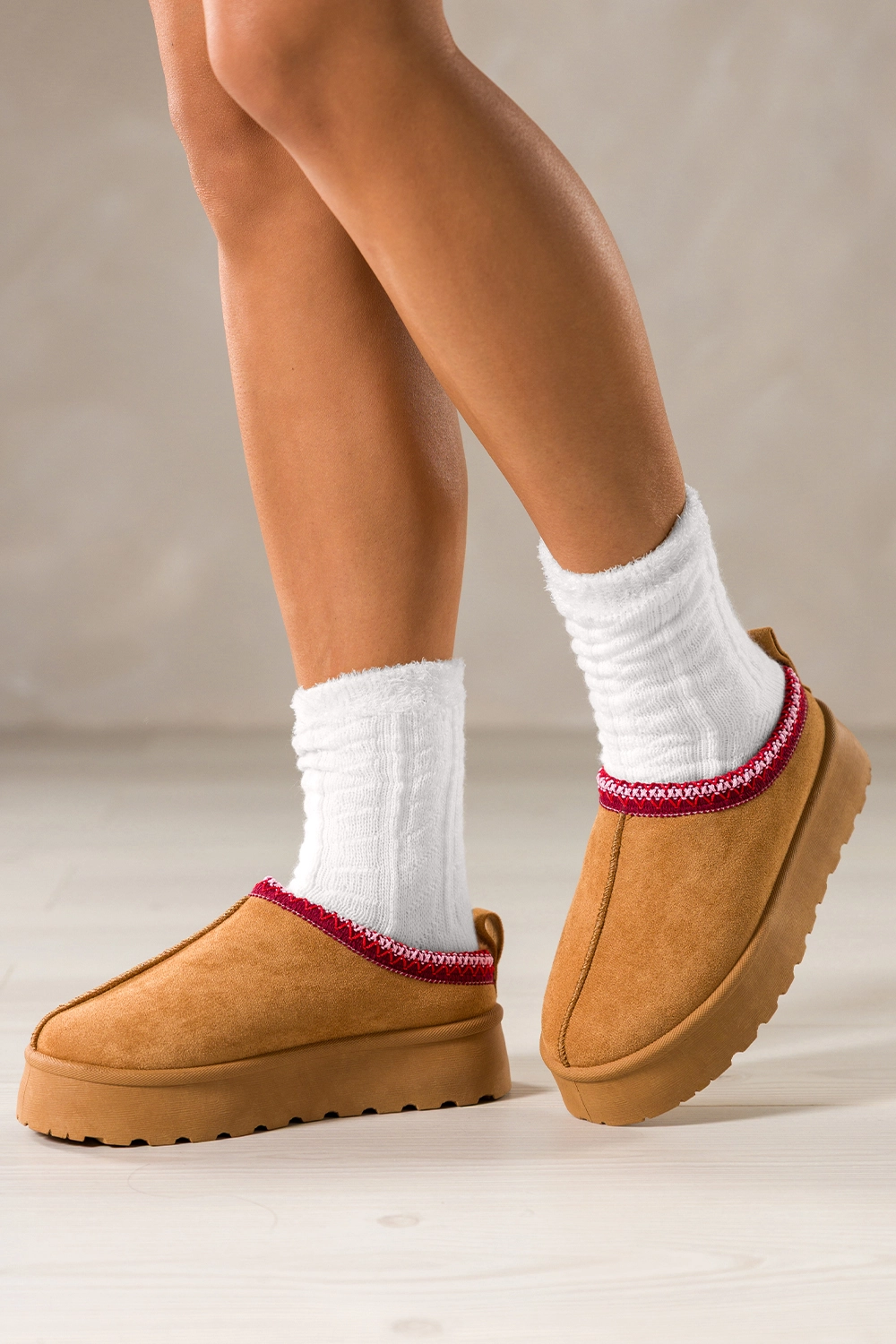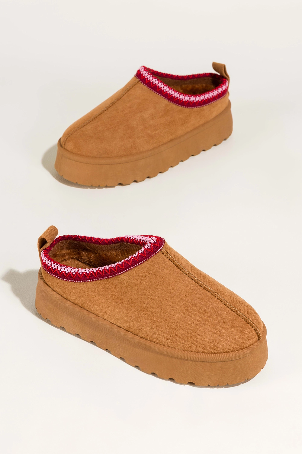 Camelowe kapcie damskie z futerkiem na platformie ozdobne obszycie Casu model 1078. Wykonane z miękkiej, zamszowej skóry ekologicznej o wysokiej jakości, gwarantują trwałość i przyjemność noszenia przez długi czas. Ocieplone miękkim, puszystym futerkiem, idealnie otulają stopy, zapewniając ciepło nawet w najchłodniejsze dni. Wsuwana konstrukcja oraz zaokrąglony nosek sprawiają, że kapcie dopasowują się do stopy, nie powodując ucisku. To idealne obuwie domowe dla kobiet, które cenią sobie komfort i wysoką jakość materiałów.