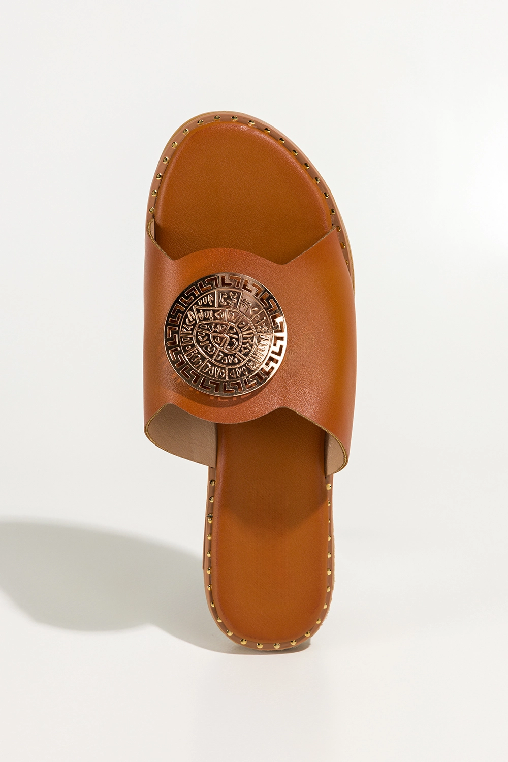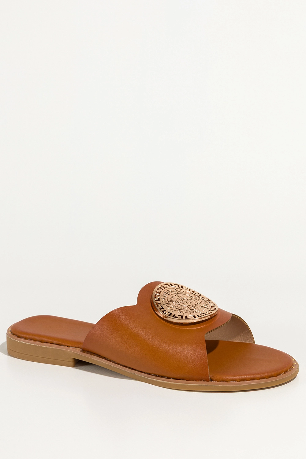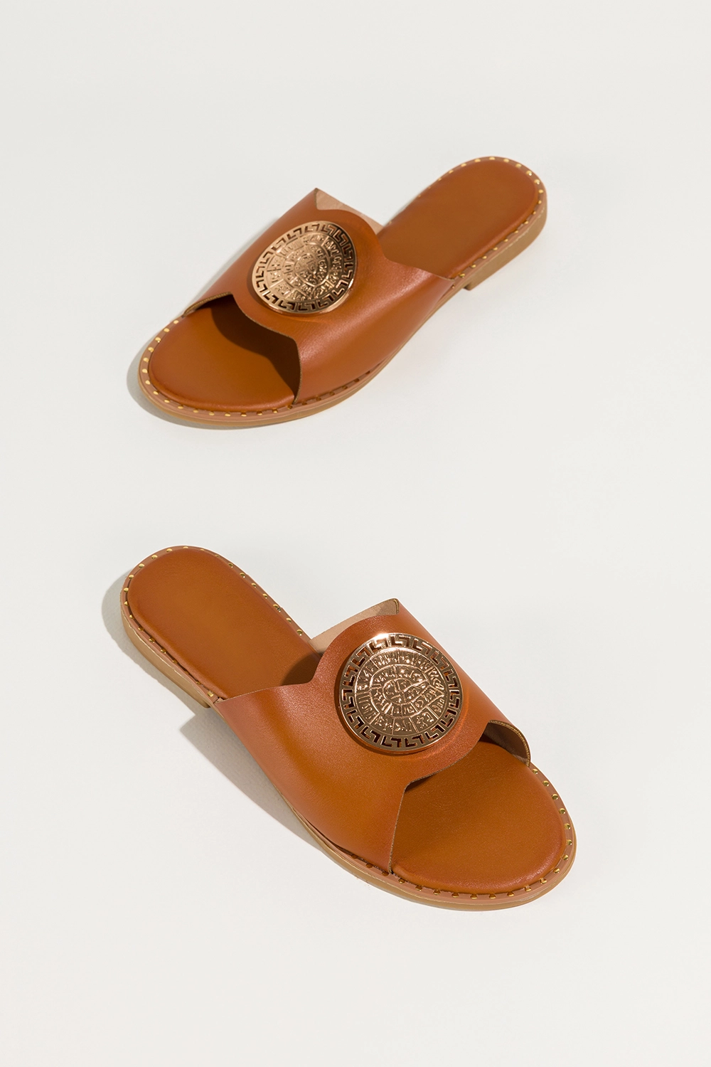 Camelowe klapki damskie na elastycznej ozdobnej płaskiej podeszwie ze złotą ażurową ozdobą Carla model M730 to wyjątkowe połączenie komfortu, kobiecej elegancji i codziennej praktyczności. To model stworzony z myślą o kobietach, które cenią sobie zarówno wygodę, jak i wyrafinowany wygląd. Wykonane z wysokogatunkowej skóry ekologicznej klapki są nie tylko przyjazne dla środowiska, ale również trwałe i stylowe. Złota ażurowa ozdoba na cholewce przyciąga uwagę subtelnym blaskiem i dodaje całości nuty luksusu, która wspaniale kontrastuje z ciepłym, camelowym odcieniem. Klapki są lekkie, a dzięki elastycznej podeszwie zapewniają maksymalny komfort noszenia – niezależnie od tego, czy spacerujesz po miejskich ulicach, czy spędzasz dzień na wakacyjnym deptaku.
