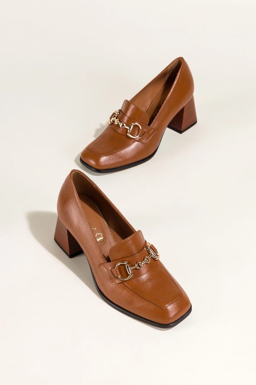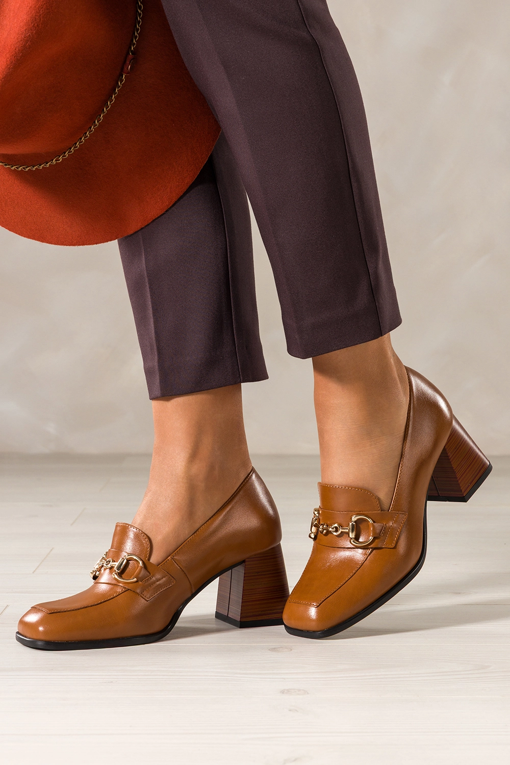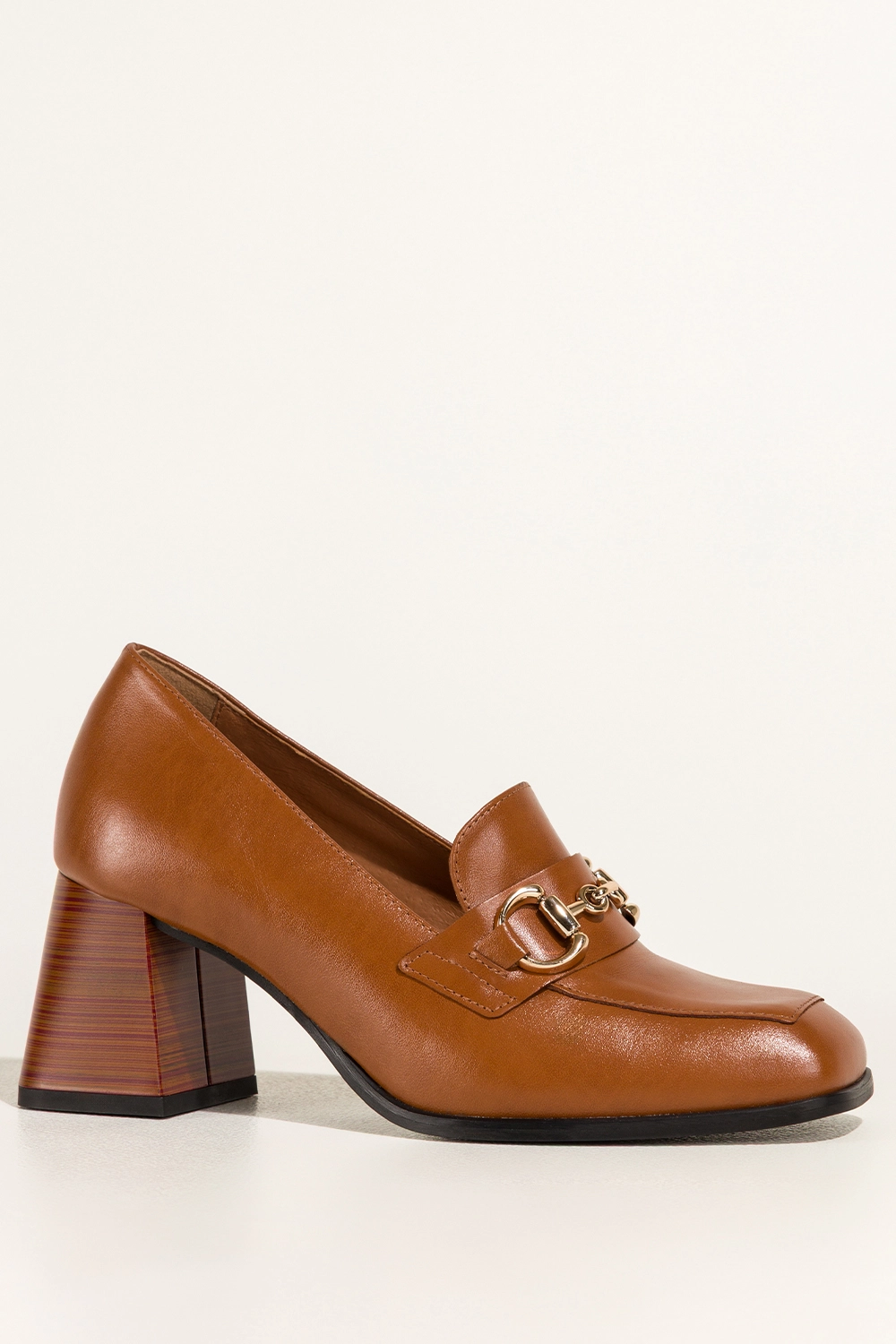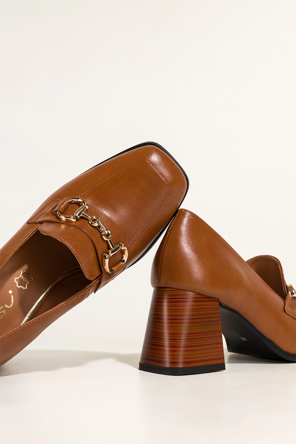 Model zachwyca złotą ozdobną sprzączką, która dodaje mu subtelnego blasku i nowoczesnego szyku. Kwadratowy nosek oraz szeroki, paskowany obcas typu klocek sprawiają, że mokasyny prezentują się nietuzinkowo, a przy tym są stabilne i niezwykle wygodne. Ich camelowy odcień to ciepła, neutralna tonacja, która doskonale współgra zarówno z codziennymi, jak i eleganckimi stylizacjami. To obuwie, które przyciąga spojrzenia i podkreśla charakter każdej kreacji.