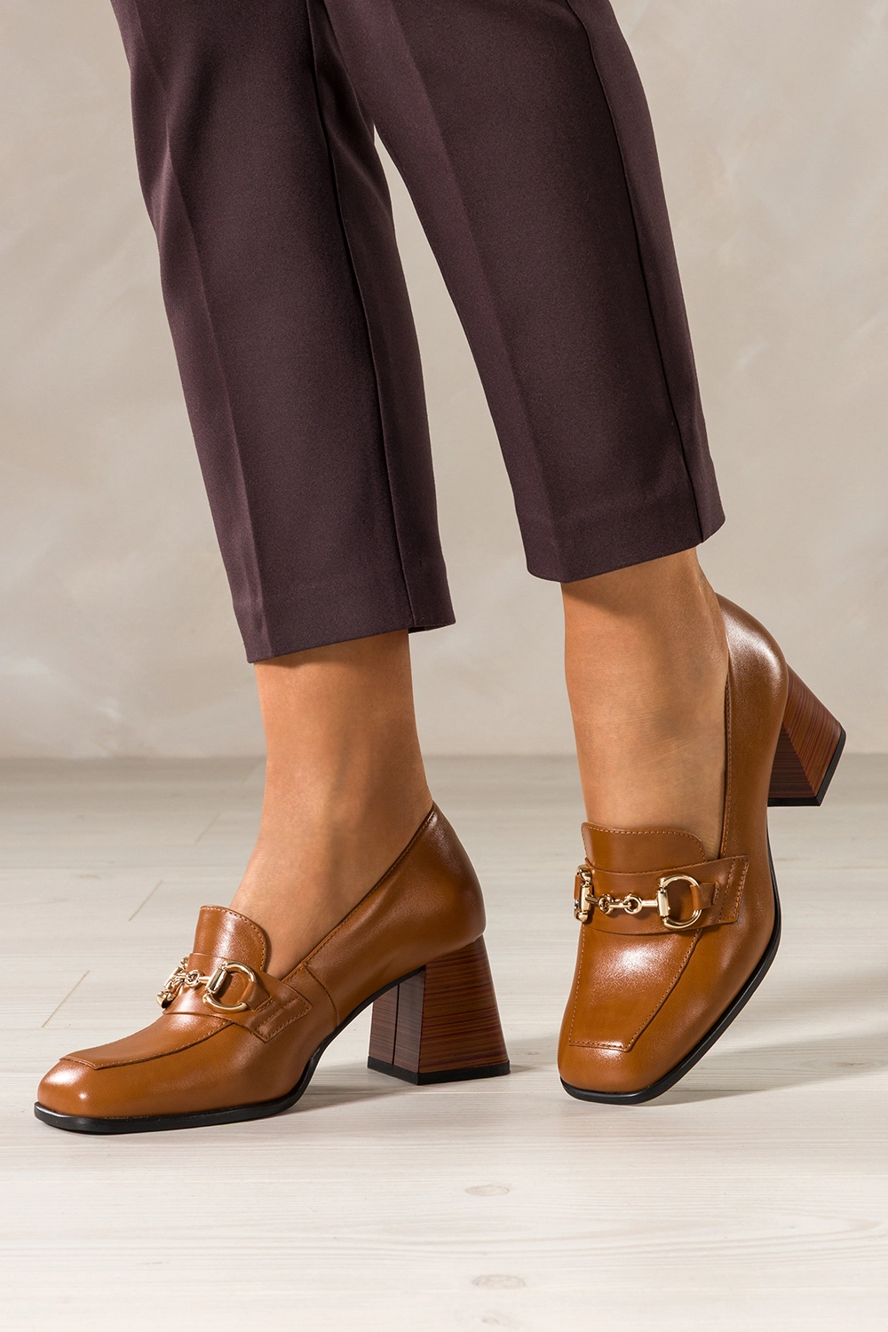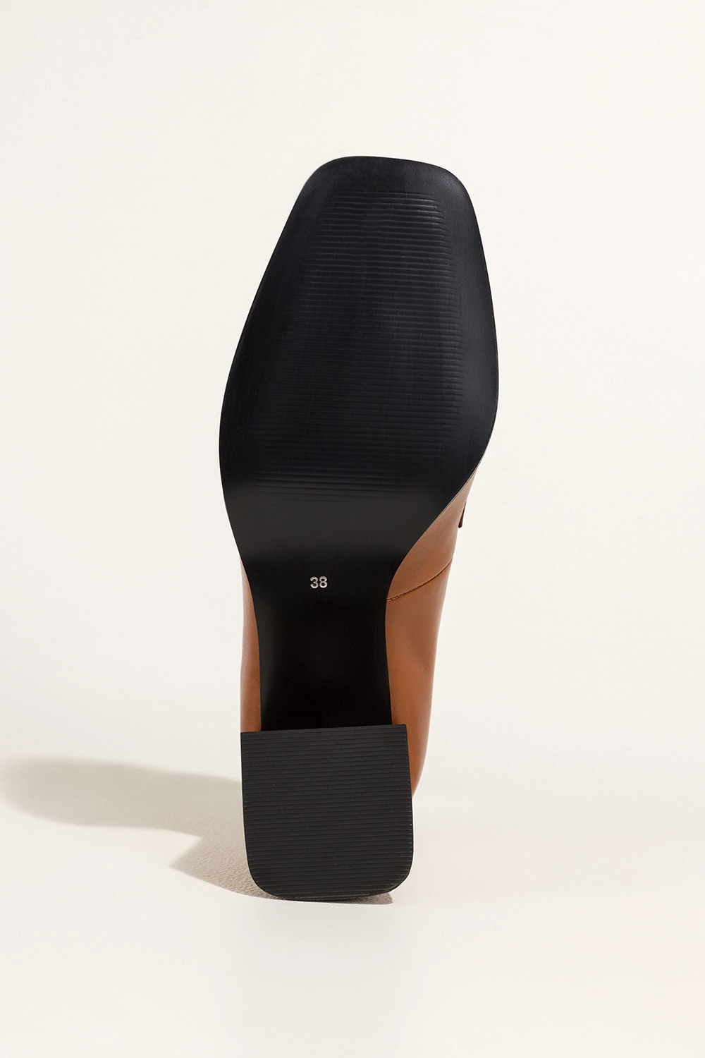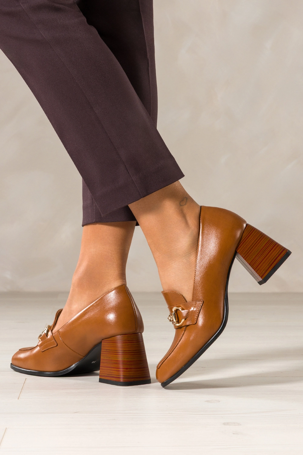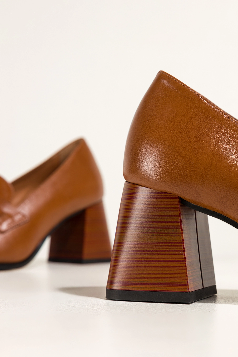 Model zachwyca złotą ozdobną sprzączką, która dodaje mu subtelnego blasku i nowoczesnego szyku. Kwadratowy nosek oraz szeroki, paskowany obcas typu klocek sprawiają, że mokasyny prezentują się nietuzinkowo, a przy tym są stabilne i niezwykle wygodne. Ich camelowy odcień to ciepła, neutralna tonacja, która doskonale współgra zarówno z codziennymi, jak i eleganckimi stylizacjami. To obuwie, które przyciąga spojrzenia i podkreśla charakter każdej kreacji.