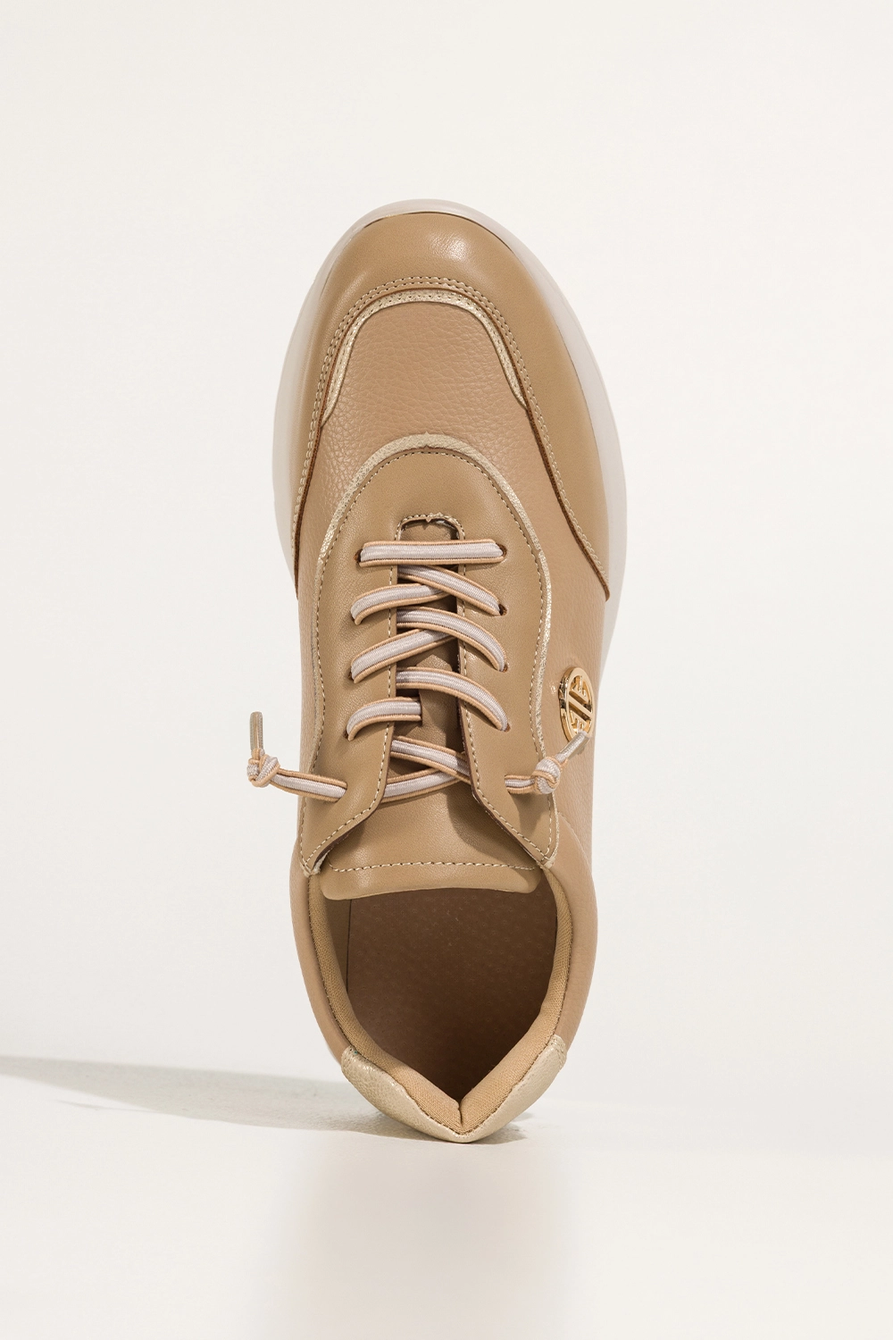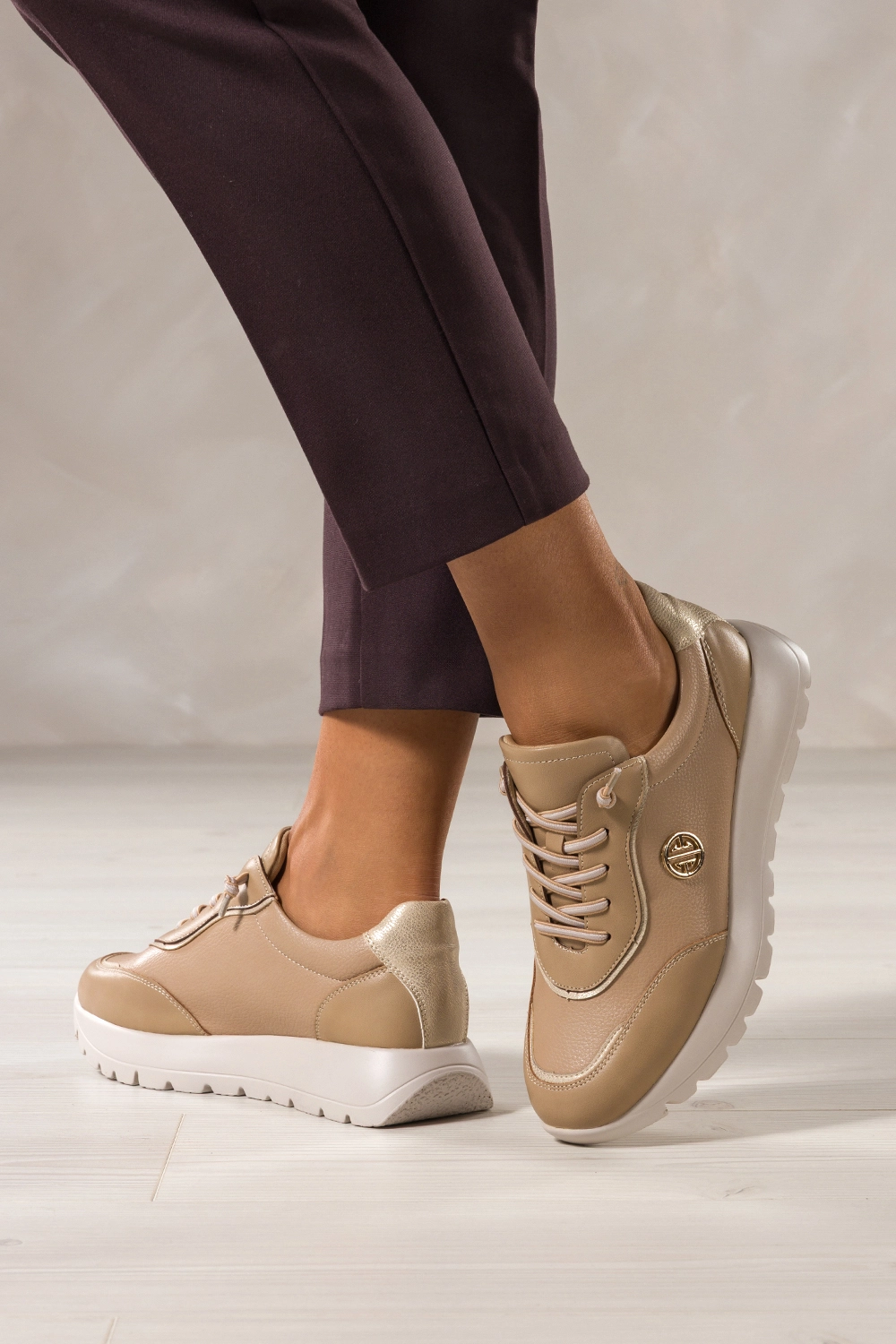 Camelowe sneakersy damskie buty sportowe na kremowej platformie elastyczne sznurówki złota ozdoba skórzana wkładka Carla QN0780-87 to kwintesencja modowego kompromisu pomiędzy komfortem a elegancją. Te stylowe buty, wykonane z wysokogatunkowej skóry ekologicznej, wyróżniają się nie tylko wyrafinowanym designem, ale przede wszystkim doskonałą jakością, która przekłada się na wygodę użytkowania przez cały dzień. Model ten łączy w sobie klasyczne camelowe odcienie z subtelnymi złotymi akcentami, tworząc idealne obuwie dla kobiet ceniących sobie zarówno praktyczność, jak i wyjątkowy styl. Dzięki starannemu wykończeniu i detalom, sneakersy stają się obowiązkowym elementem garderoby każdej miłośniczki mody.