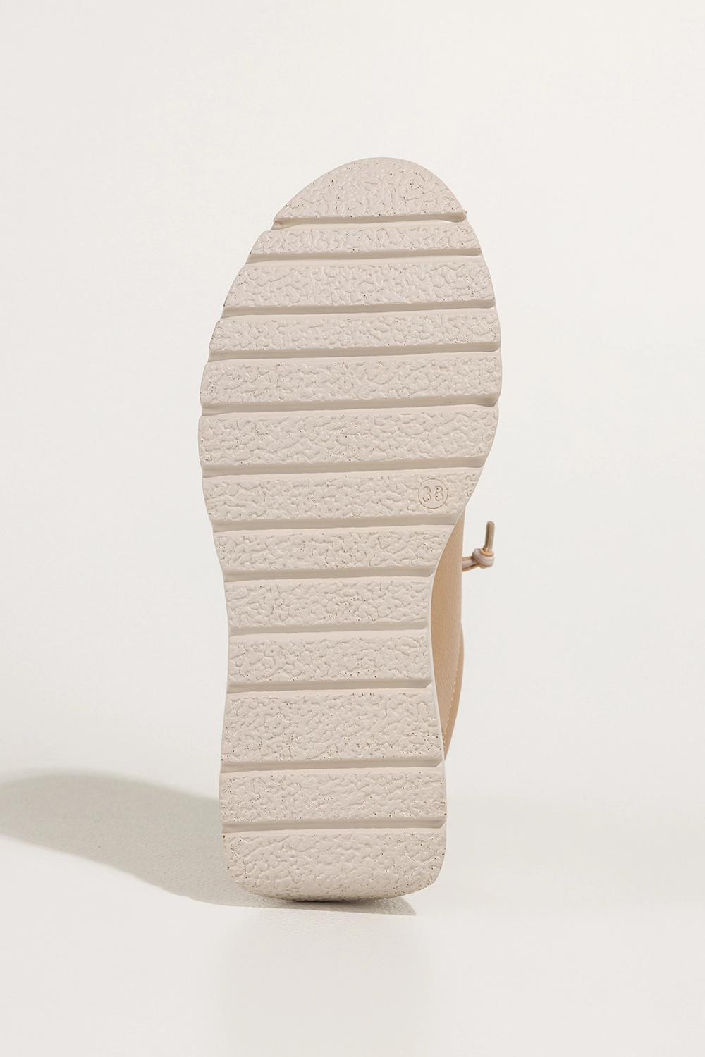 Projektanci zadbali o to, by każdy detal sneakersów miał swoje praktyczne i estetyczne uzasadnienie. Elastyczne sznurówki gwarantują idealne dopasowanie, bez konieczności ciągłego ich wiązania. Złota ozdoba umieszczona na cholewce subtelnie przyciąga uwagę, podkreślając nowoczesny i kobiecy charakter obuwia. Zaokrąglony nosek sprawia, że buty optycznie wysmuklają stopę i zapewniają większą przestrzeń dla palców, co przekłada się na komfort podczas całodniowego noszenia. Grubsza platforma w odcieniu kremowym nie tylko dodaje kilku centymetrów wzrostu, ale także odciąża stopy i kręgosłup, wspierając zdrową postawę. To rozwiązania, które świadczą o przemyślanej konstrukcji i funkcjonalnym podejściu do designu, tworząc obuwie przyjazne użytkowniczce w każdej sytuacji.