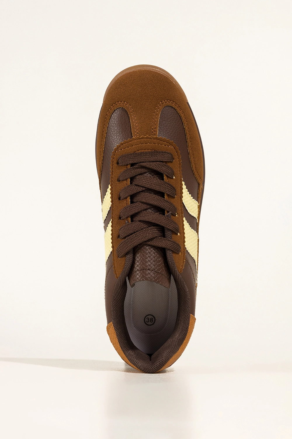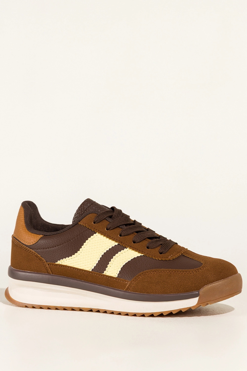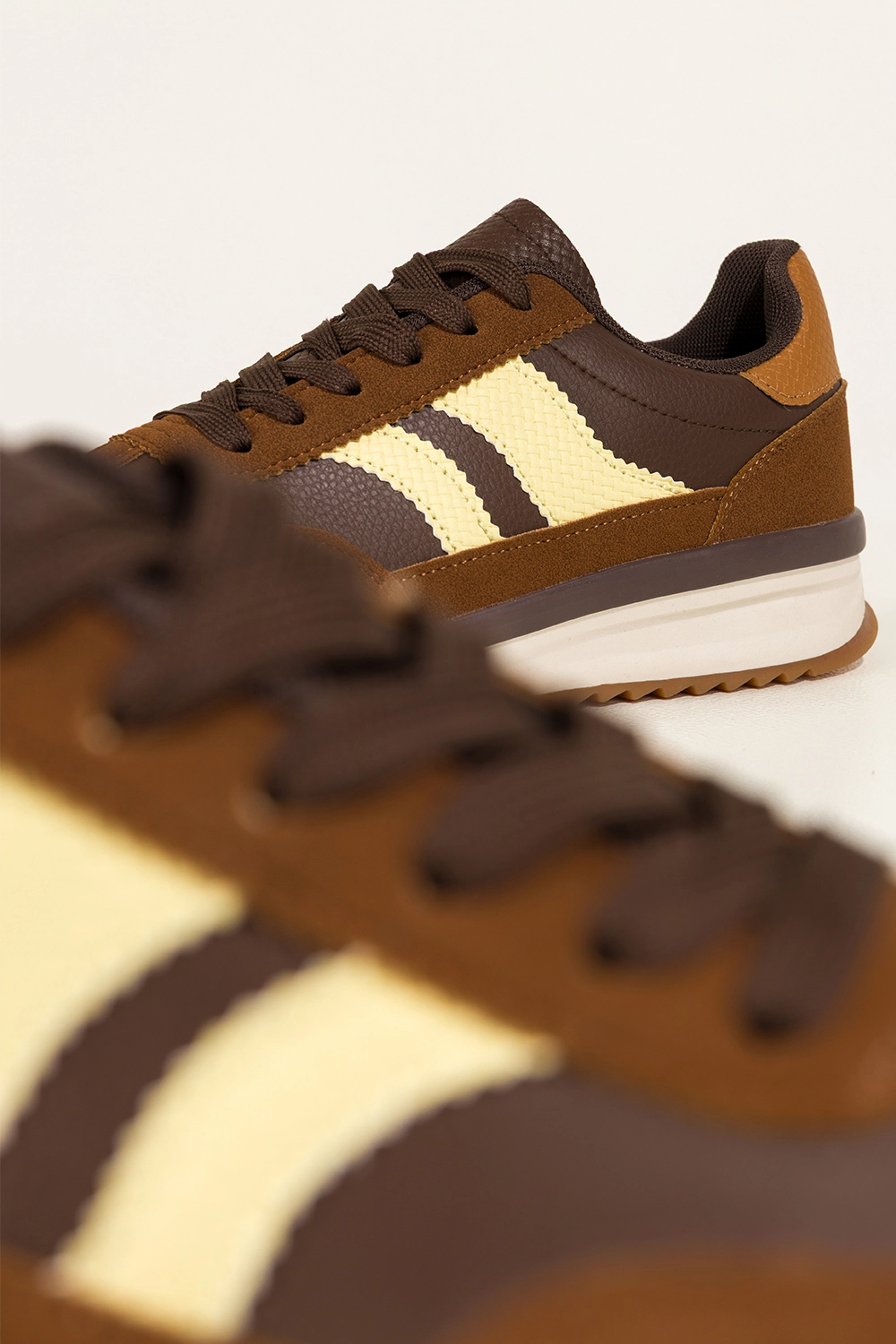 Subtelne beżowe i czekoladowe wstawki oraz kontrastujące brązowe sznurówki nadają im modowego charakteru, który przyciąga wzrok. Zaokrąglony nosek oraz staranne wykończenie detali dodają elegancji, dzięki czemu świetnie sprawdzą się zarówno do jeansów, jak i sukienek. Sneakersy te doskonale wpisują się w aktualne trendy i mogą stać się bazą wielu unikalnych stylizacji.