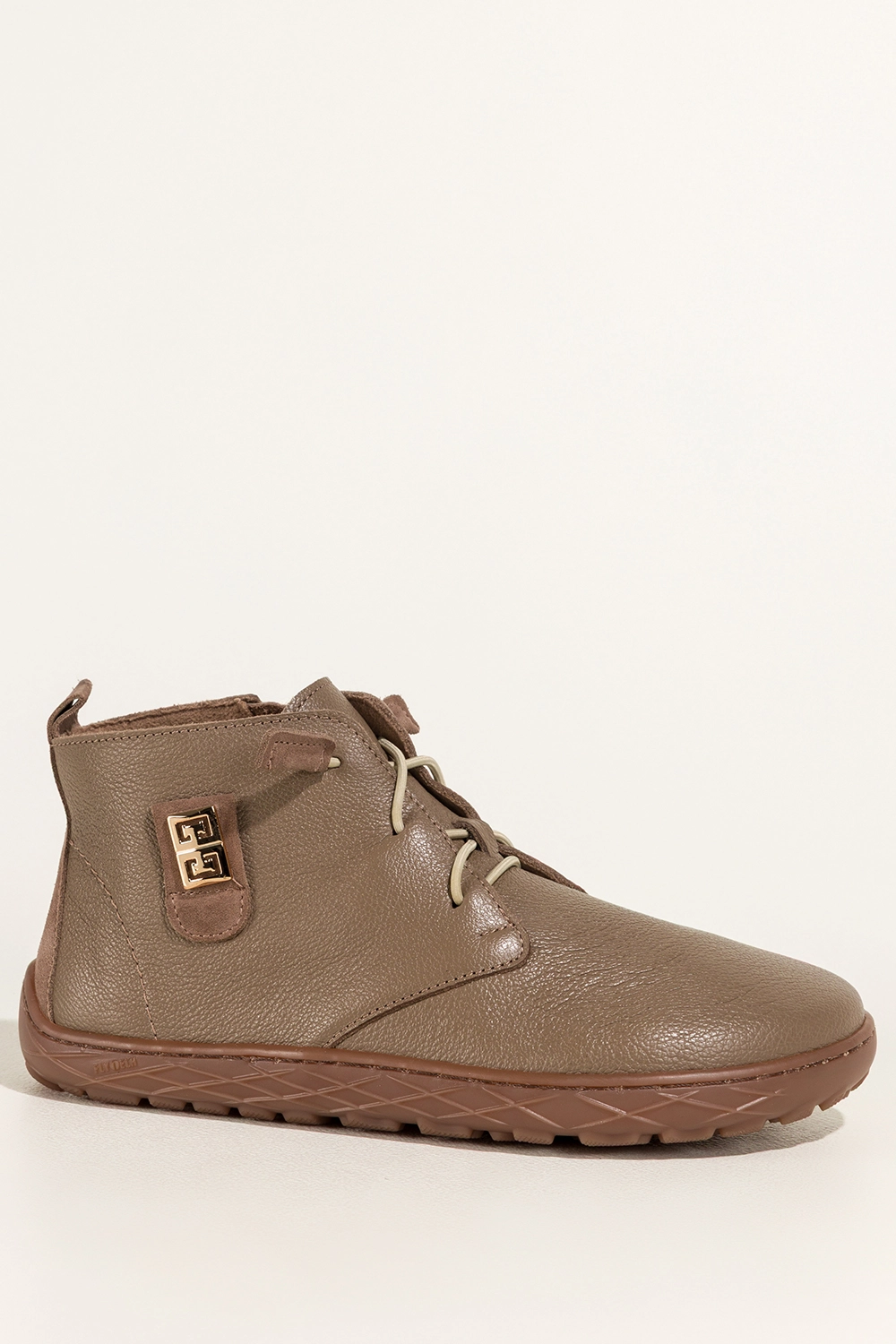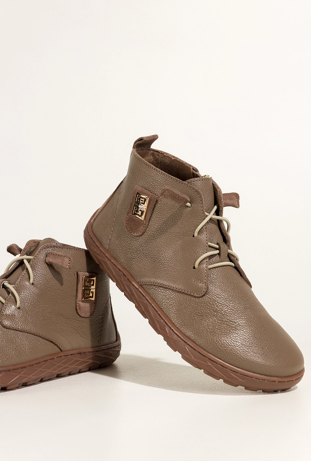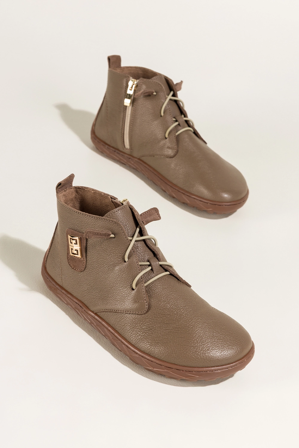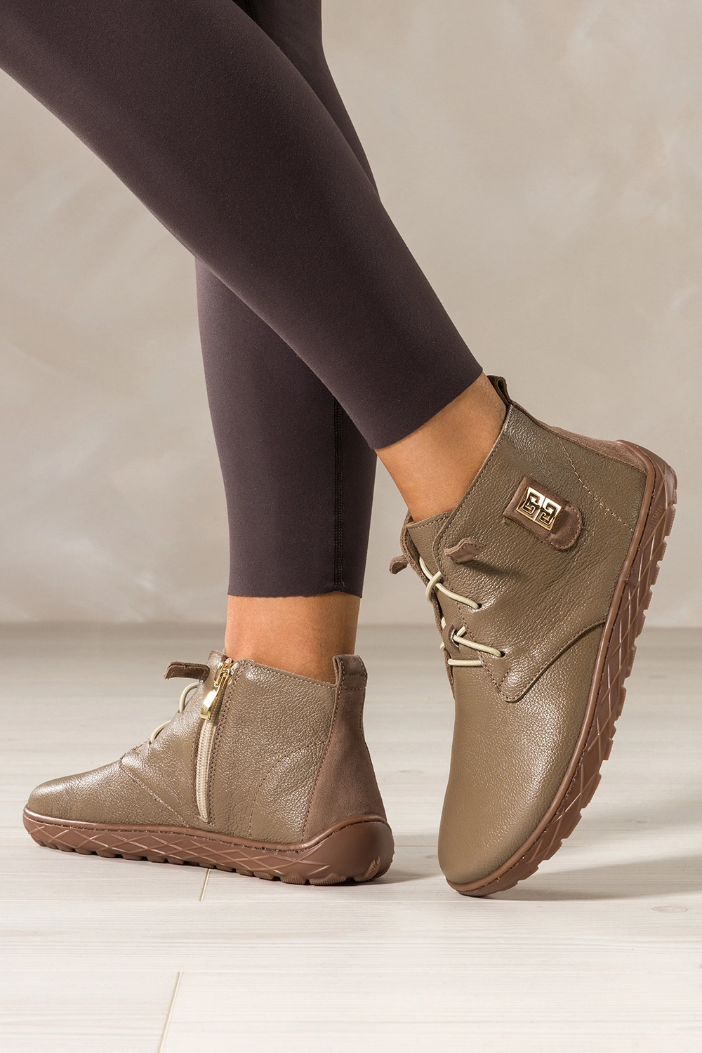 Ciemnobeżowe botki barefoot skórzane damskie szerokie na elastycznej płaskiej podeszwie złota ozdoba elastyczne sznurówki PRODUKT POLSKI Casu 69927