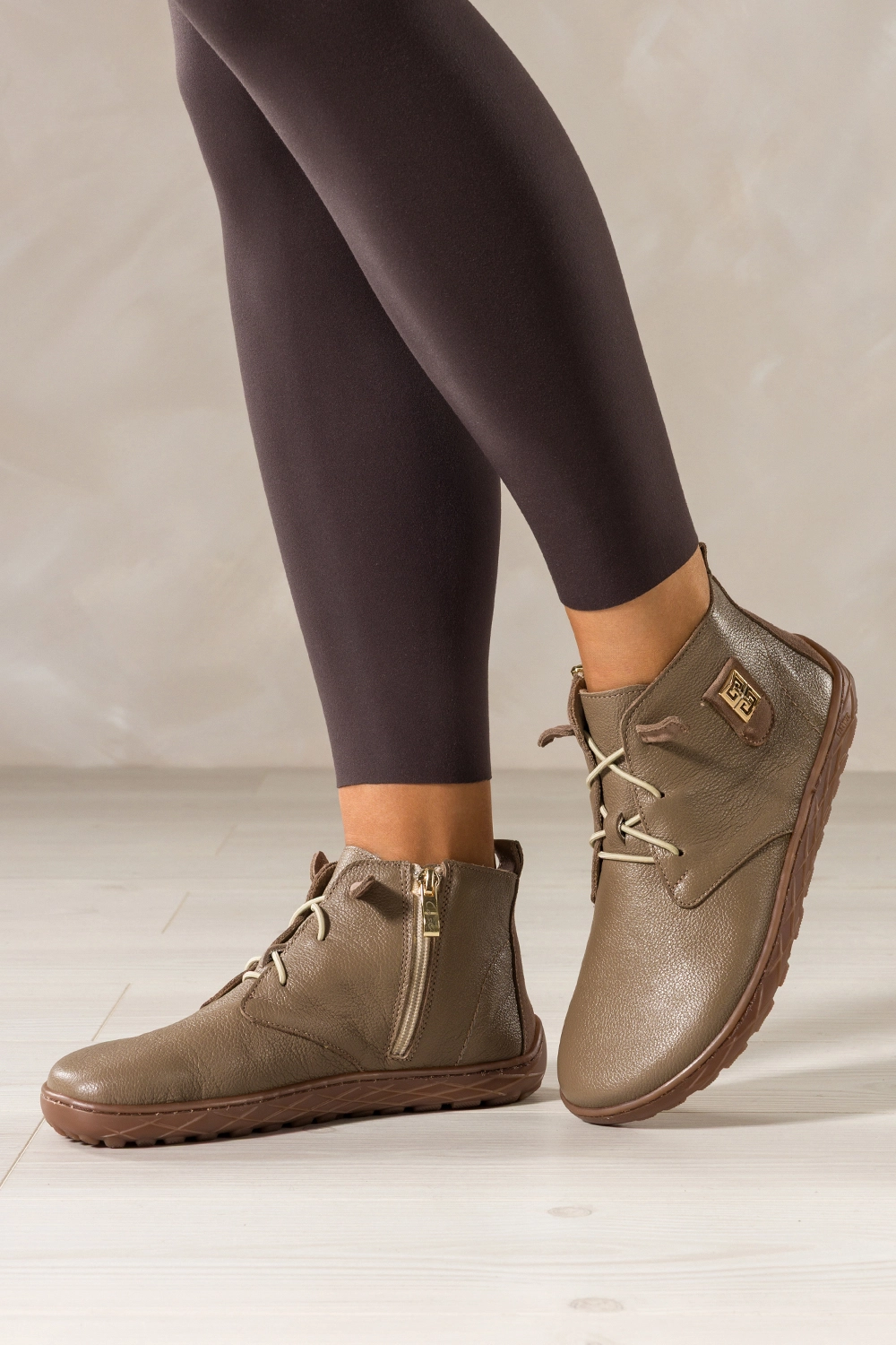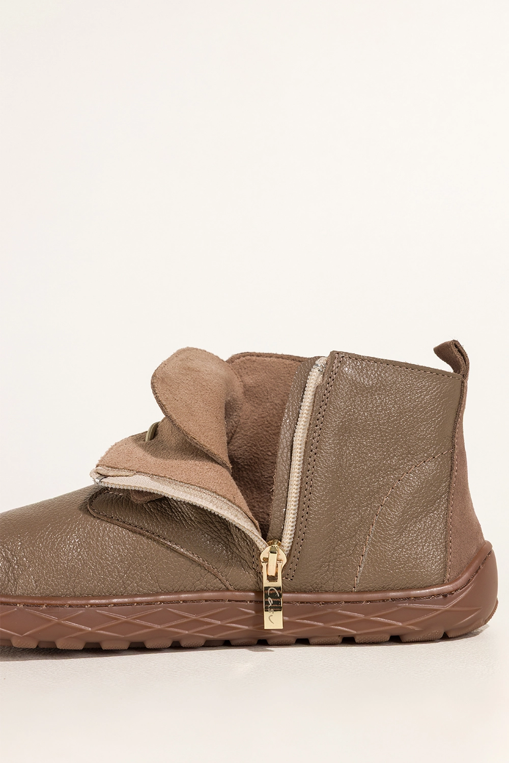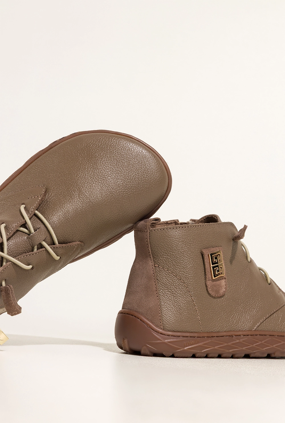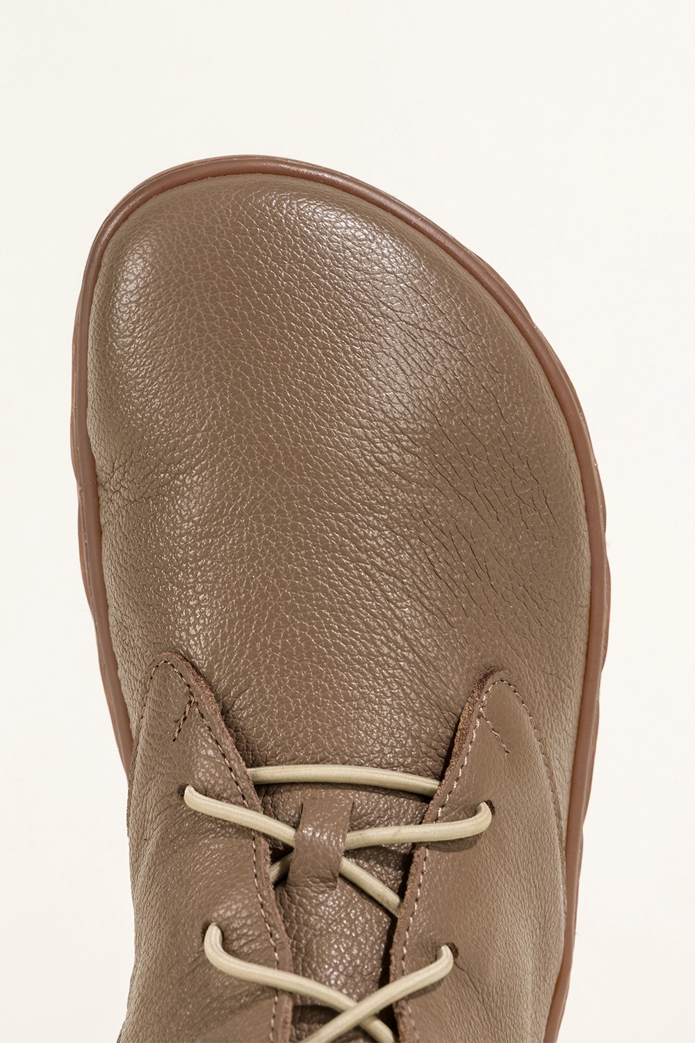 Ciemnobeżowe botki barefoot skórzane damskie szerokie na elastycznej płaskiej podeszwie złota ozdoba elastyczne sznurówki PRODUKT POLSKI Casu 69927