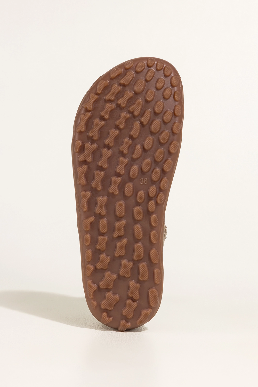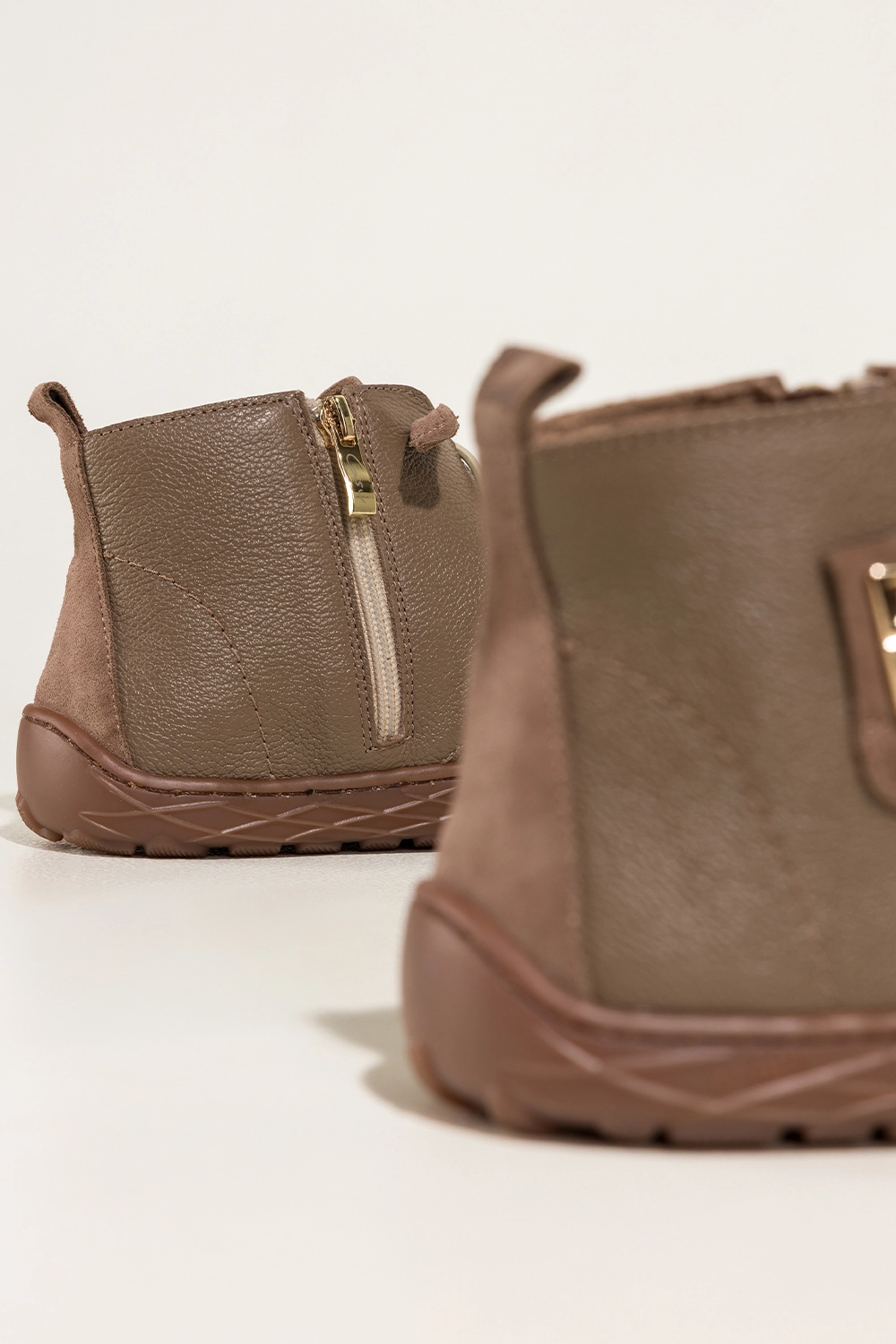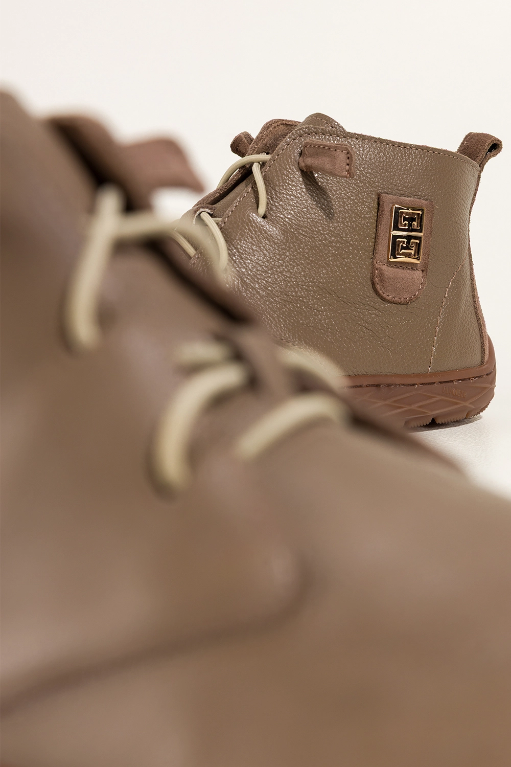 Subtelny odcień ciemnobeżowy z elegancką, metalową ozdobą w kolorze złota nadaje butom ponadczasowy charakter i sprawia, że doskonale wpisują się zarówno w codzienne, jak i bardziej eleganckie stylizacje. Zapinanie na zamek ułatwia szybkie zakładanie, a elastyczne beżowe sznurówki zwiększają dopasowanie do stopy.