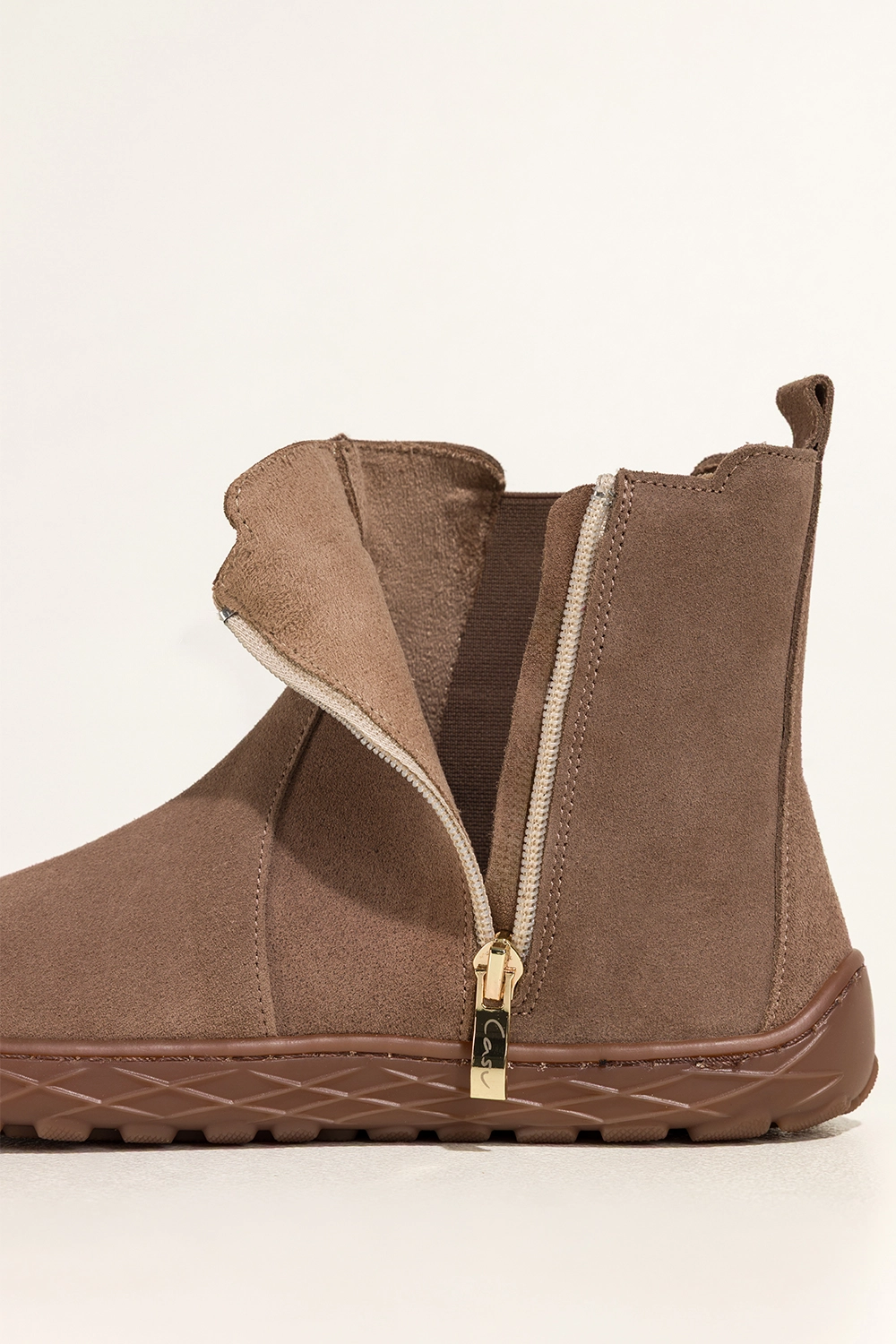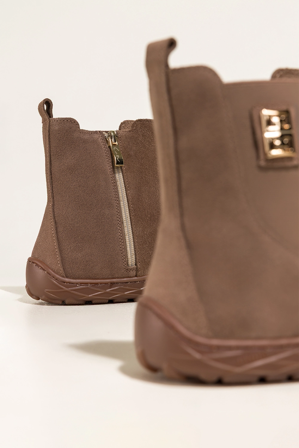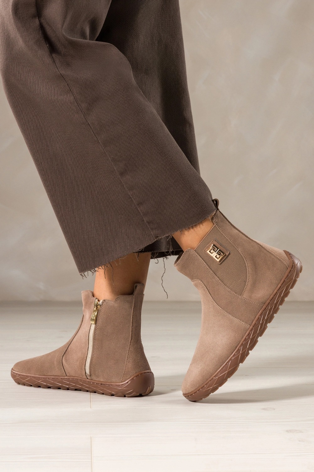 Ciemnobeżowe botki barefoot skórzane damskie szerokie na elastycznej płaskiej podeszwie złota ozdoba guma w cholewce PRODUKT POLSKI Casu model 69925, to esencja komfortu i naturalności. Wykonane z wysokogatunkowej skóry zamszowej, gwarantują miękkość i trwałość nawet przy intensywnym użytkowaniu. Ich miękka wkładka materiałowa oraz szeroki zaokrąglony nosek zapewniają maksymalną wygodę dla szerszych stóp, jednocześnie wspierając naturalną pracę palców, zgodnie z ideą barefoot.