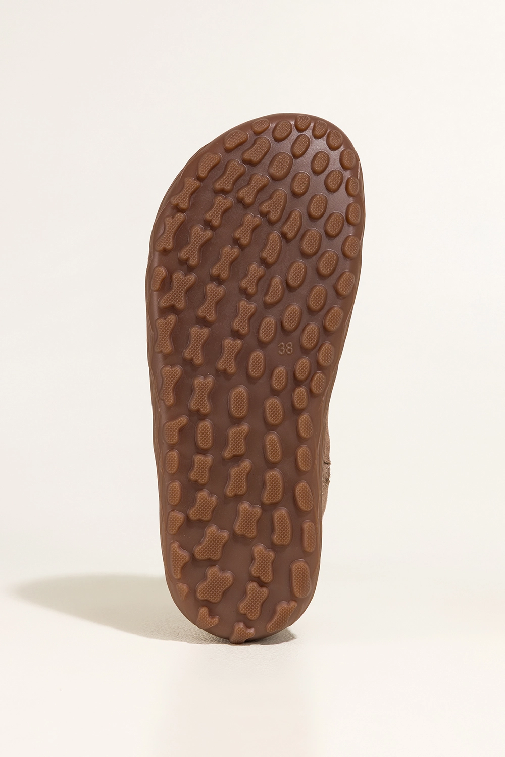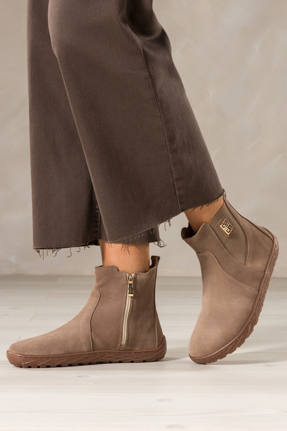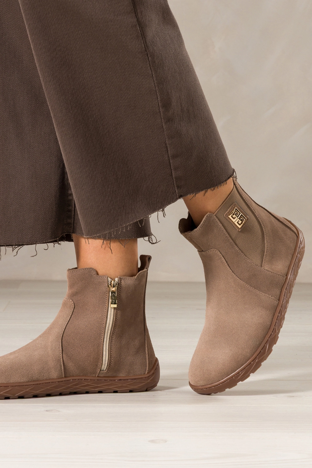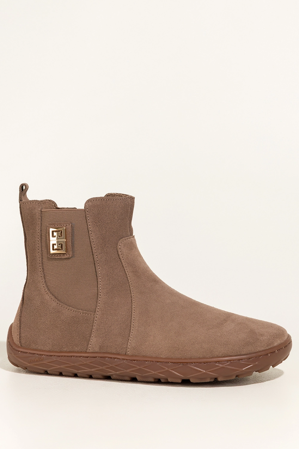 Ciemnobeżowe botki barefoot skórzane damskie szerokie na elastycznej płaskiej podeszwie złota ozdoba guma w cholewce PRODUKT POLSKI Casu model 69925, to esencja komfortu i naturalności. Wykonane z wysokogatunkowej skóry zamszowej, gwarantują miękkość i trwałość nawet przy intensywnym użytkowaniu. Ich miękka wkładka materiałowa oraz szeroki zaokrąglony nosek zapewniają maksymalną wygodę dla szerszych stóp, jednocześnie wspierając naturalną pracę palców, zgodnie z ideą barefoot.