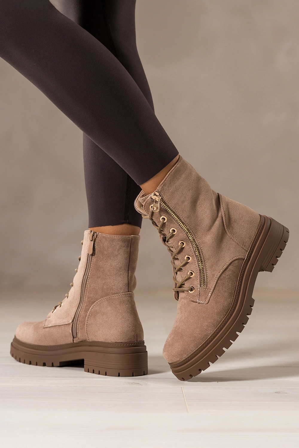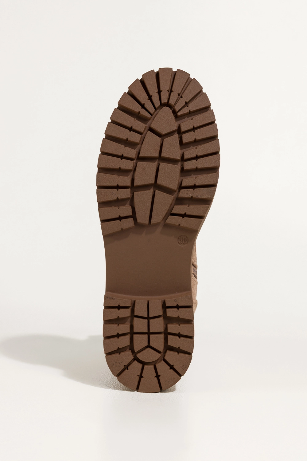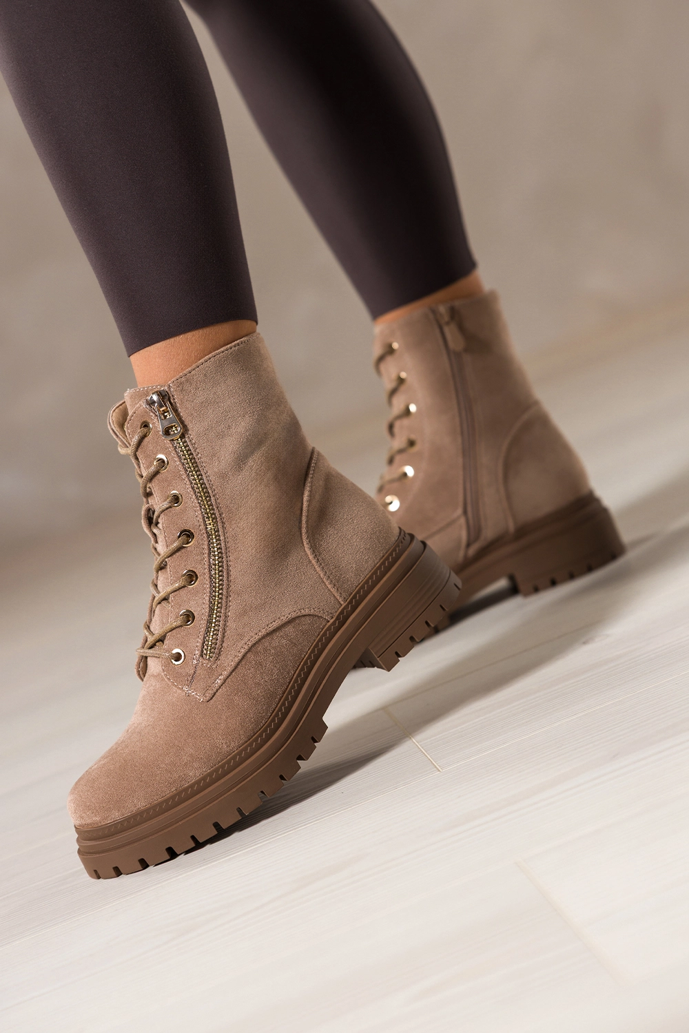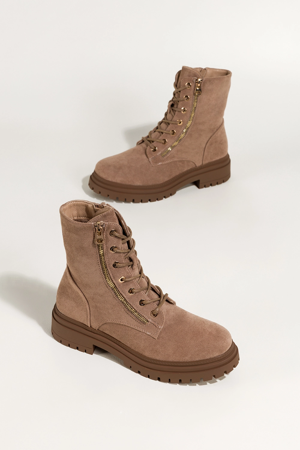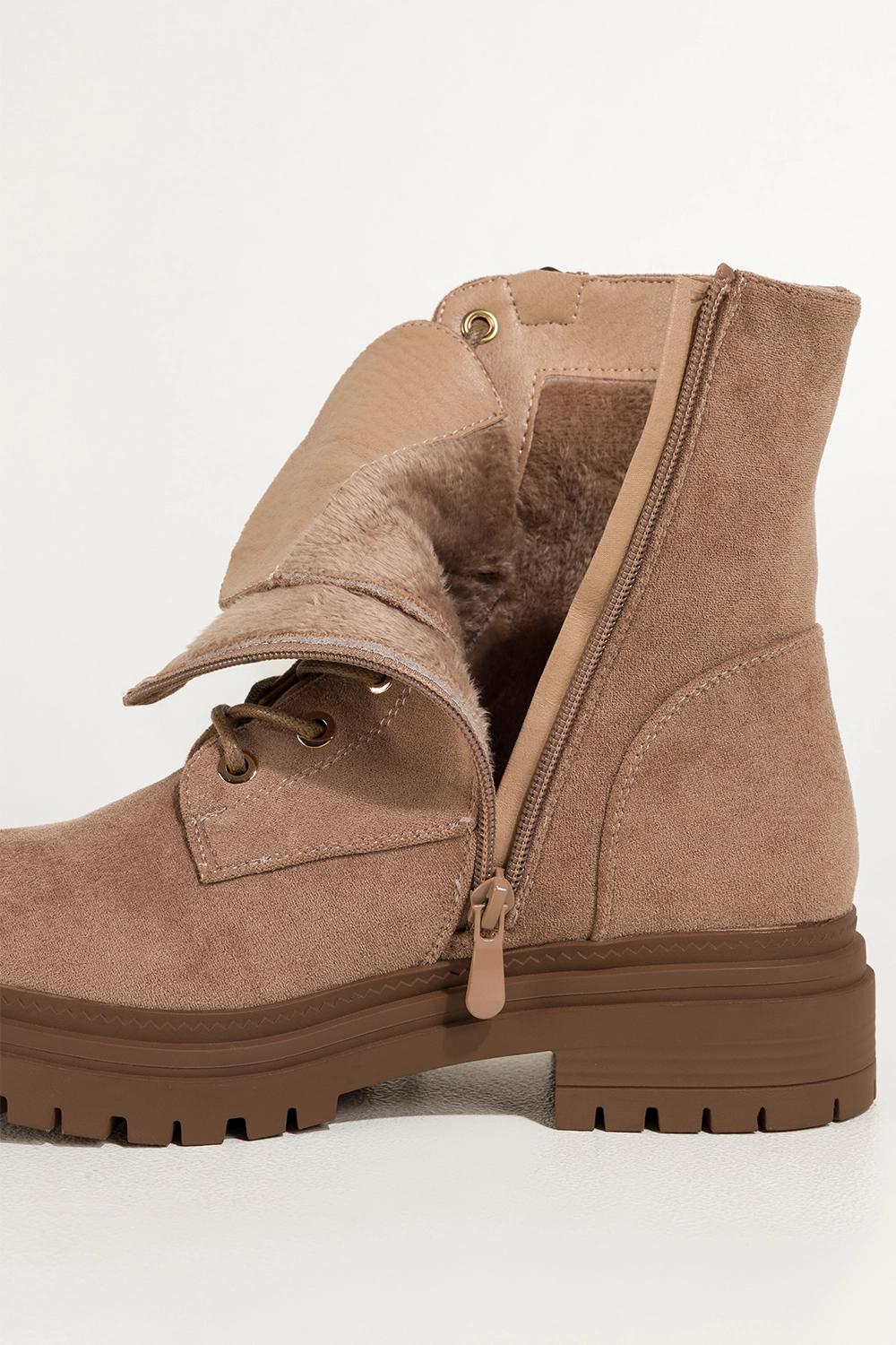 Ciemnobeżowe botki damskie na bieżnikowanej platformie ozdobny zamek na cholewce sznurowane Casu model 31884-7, to synonim elegancji i wygody w jesienno-zimowym wydaniu. Wykonane z wysokogatunkowej skóry zamszowej, zachwycają swoją miękkością. Ocieplane delikatnym futerkiem, gwarantują ciepło nawet w chłodniejsze dni, jednocześnie pozwalając skórze oddychać. Precyzyjne szycie i staranne wykończenie podkreślają luksusowy charakter produktu, który sprawdzi się zarówno na co dzień, jak i podczas wyjątkowych okazji.