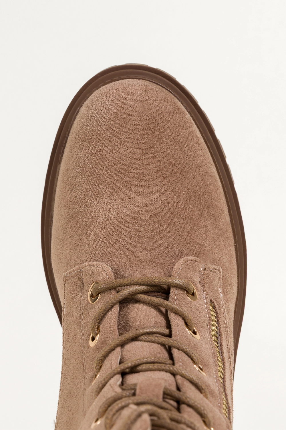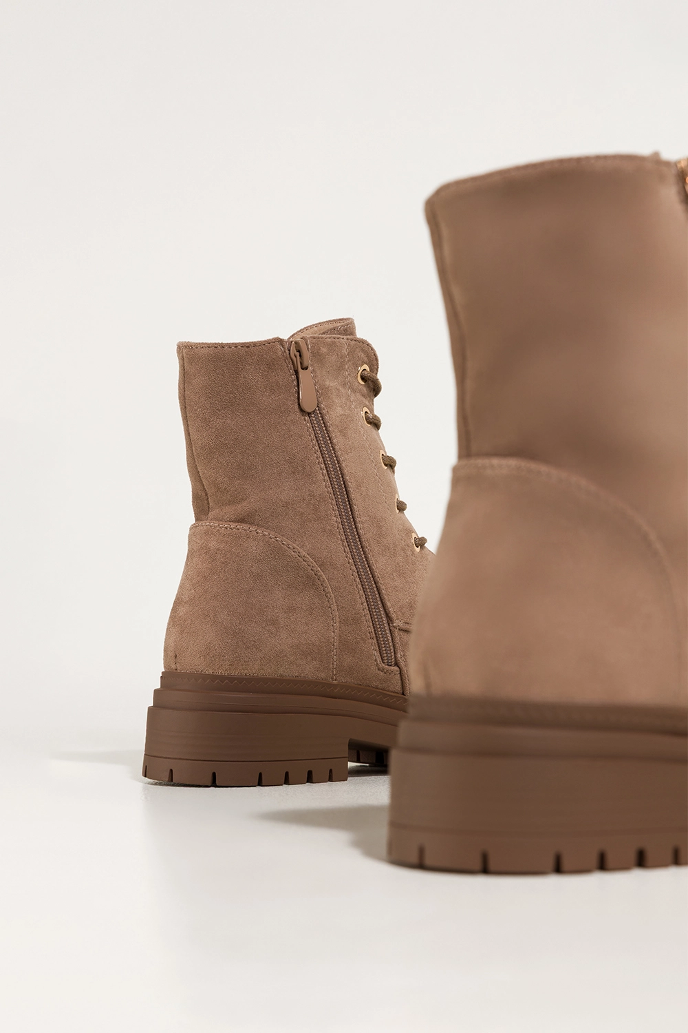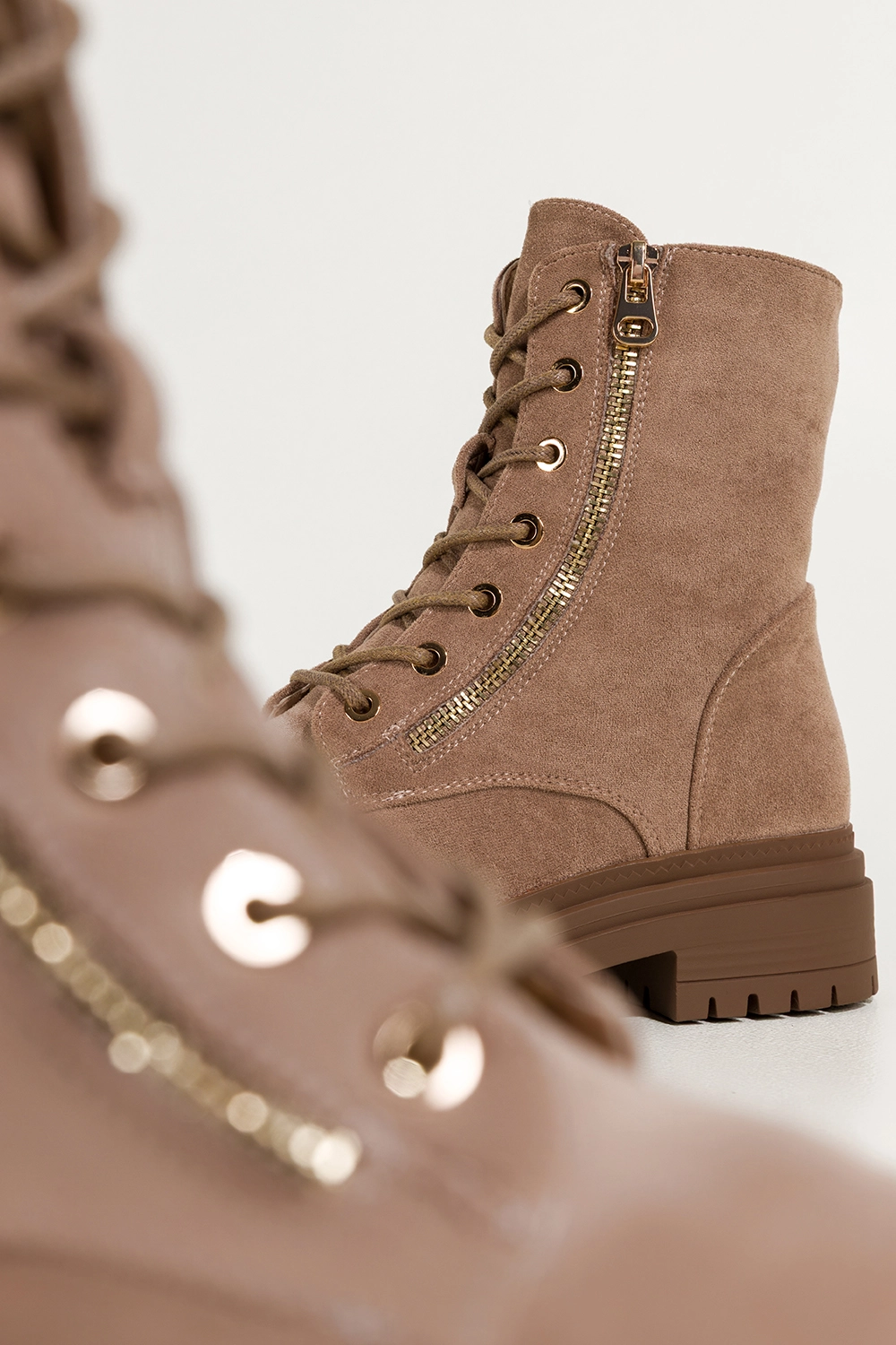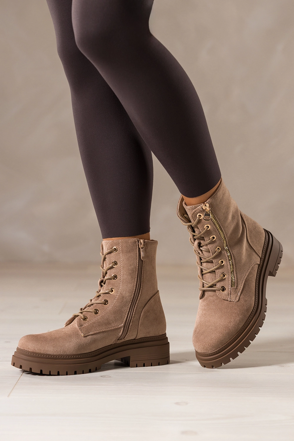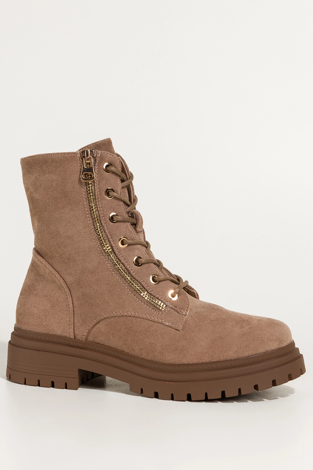 Ciemnobeżowe botki damskie na bieżnikowanej platformie ozdobny zamek na cholewce sznurowane Casu model 31884-7, to synonim elegancji i wygody w jesienno-zimowym wydaniu. Wykonane z wysokogatunkowej skóry zamszowej, zachwycają swoją miękkością. Ocieplane delikatnym futerkiem, gwarantują ciepło nawet w chłodniejsze dni, jednocześnie pozwalając skórze oddychać. Precyzyjne szycie i staranne wykończenie podkreślają luksusowy charakter produktu, który sprawdzi się zarówno na co dzień, jak i podczas wyjątkowych okazji.