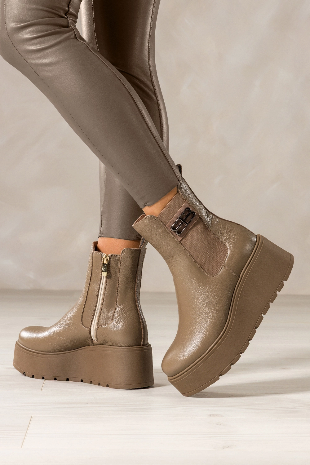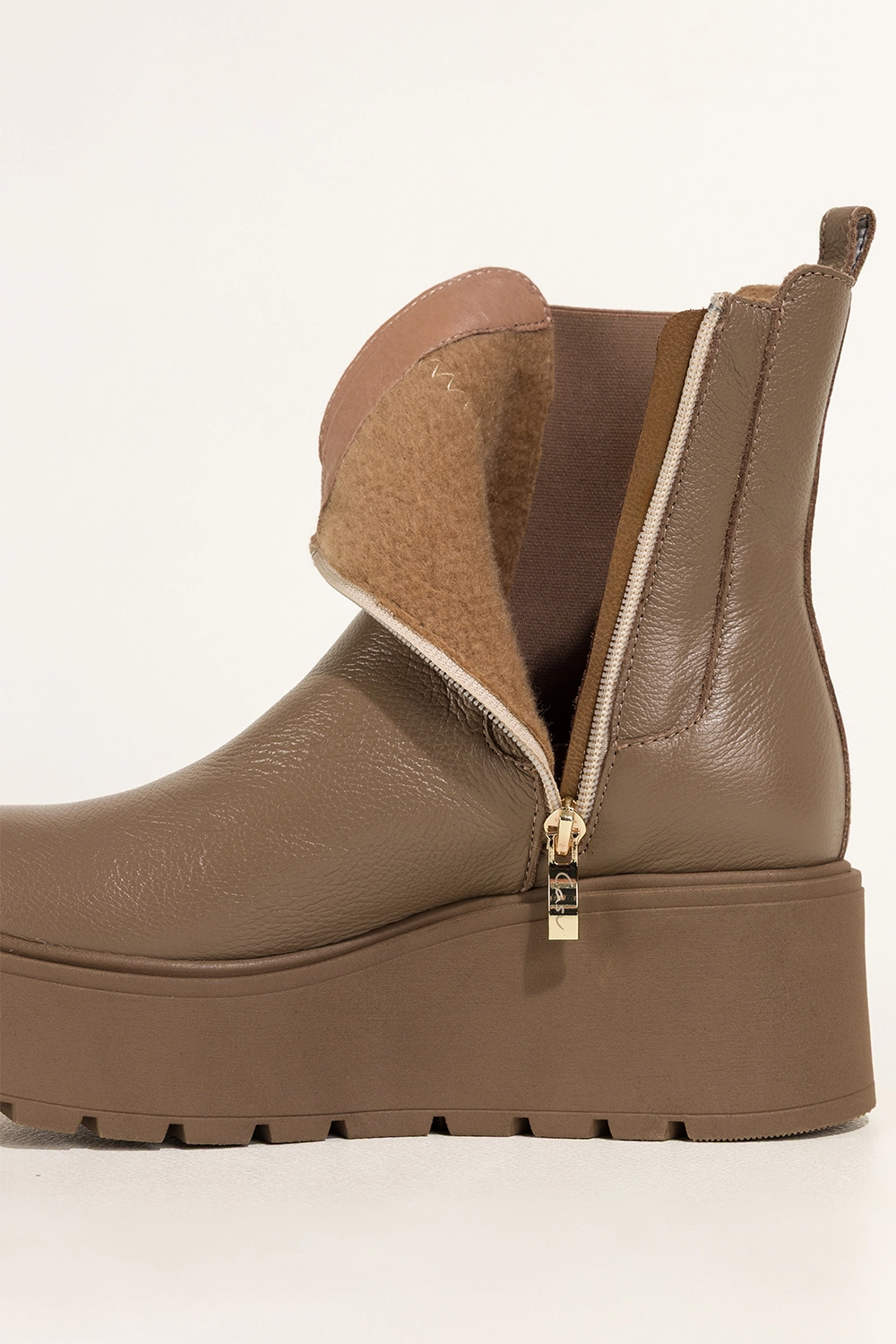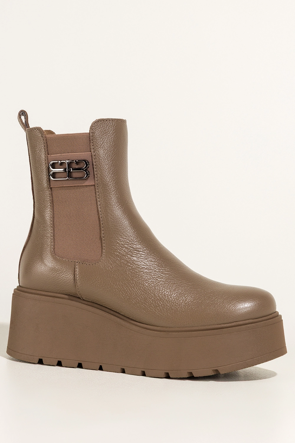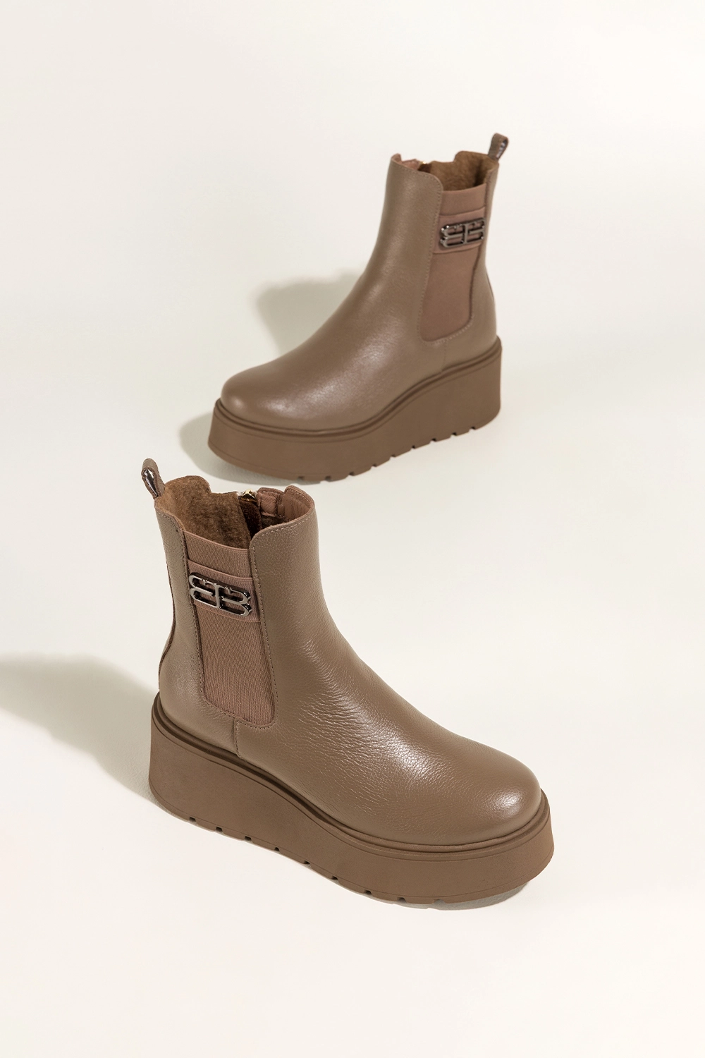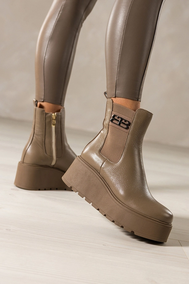 Ciemnobeżowe botki skórzane damskie na bieżnikowanej platformie guma w cholewce stalowa ozdoba PRODUKT POLSKI Casu 39501, to kwintesencja rzemiosła i komfortu. Wykonane z wysokogatunkowej skóry naturalnej, zapewniają doskonałą trwałość i miękkość, dzięki której każda stylizacja zyskuje nowy wymiar wygody. Ich wnętrze ocieplone jest przyjemnym w dotyku kocem obuwniczym, a miękka wkładka gwarantuje komfort przez cały dzień, niezależnie od pogody.