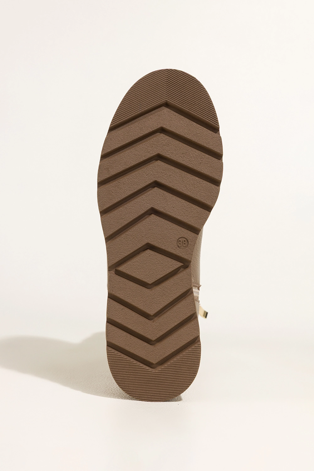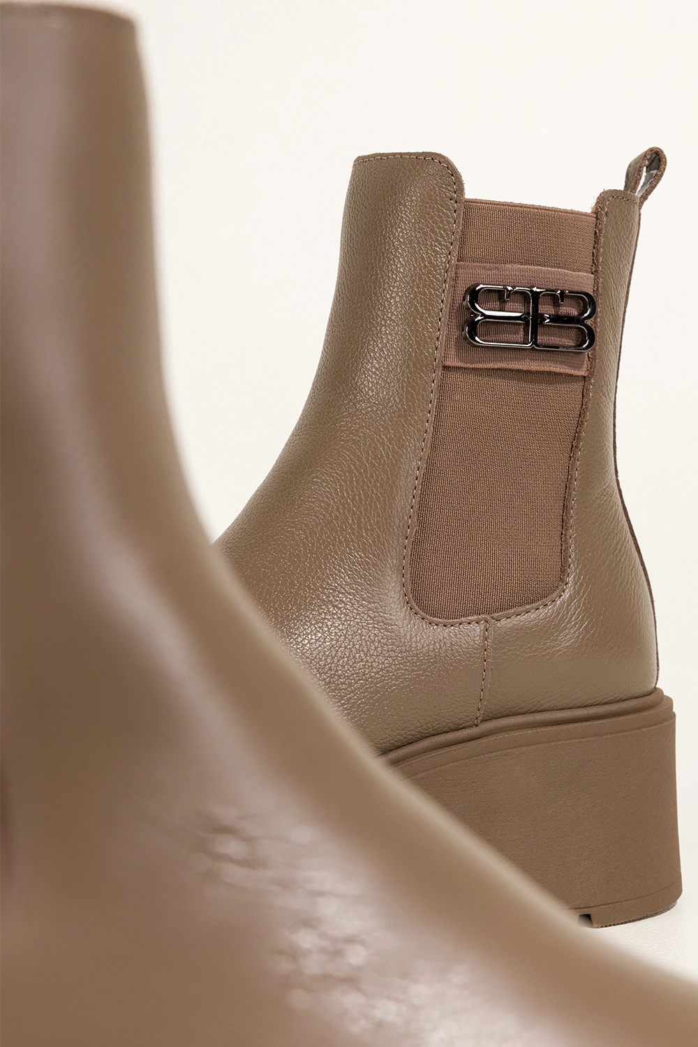 Botki zachwycają nie tylko praktycznością, ale również nowoczesnym designem. Bieżnikowana platforma dodaje im charakteru, a zaokrąglony nosek i gładka cholewka świetnie wpisują się w aktualne trendy. Beżowa elastyczna guma w cholewce ułatwia zakładanie, a stalowa ozdoba dodaje wyrazistego, industrialnego akcentu. Kolor ciemnobeżowy to idealny kompromis między klasyką a modową świeżością, doskonale pasuje zarówno do dżinsów, jak i zwiewnych sukienek. Dzięki zamkowi z boku, botki są niezwykle praktyczne i wygodne w użytkowaniu na co dzień.