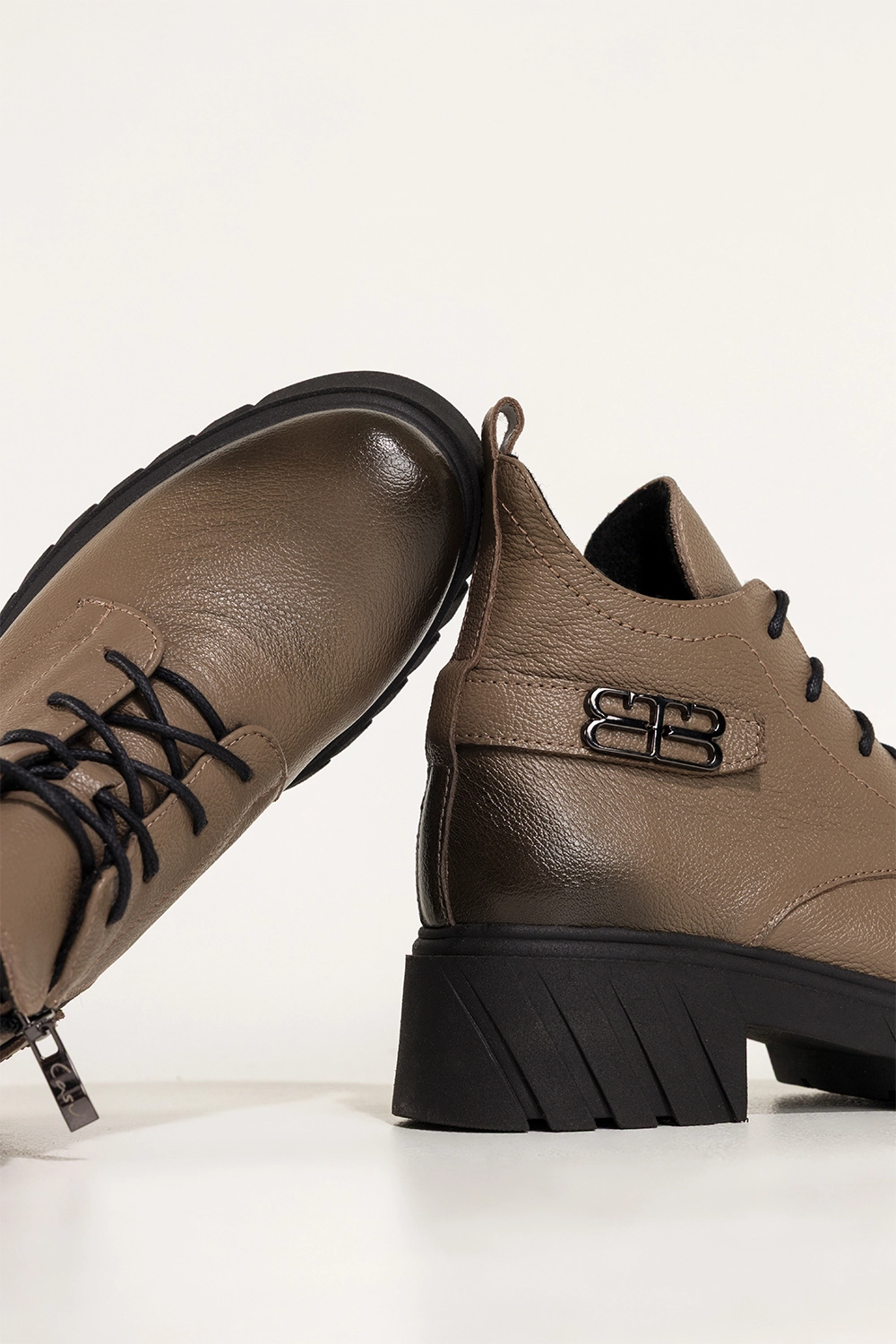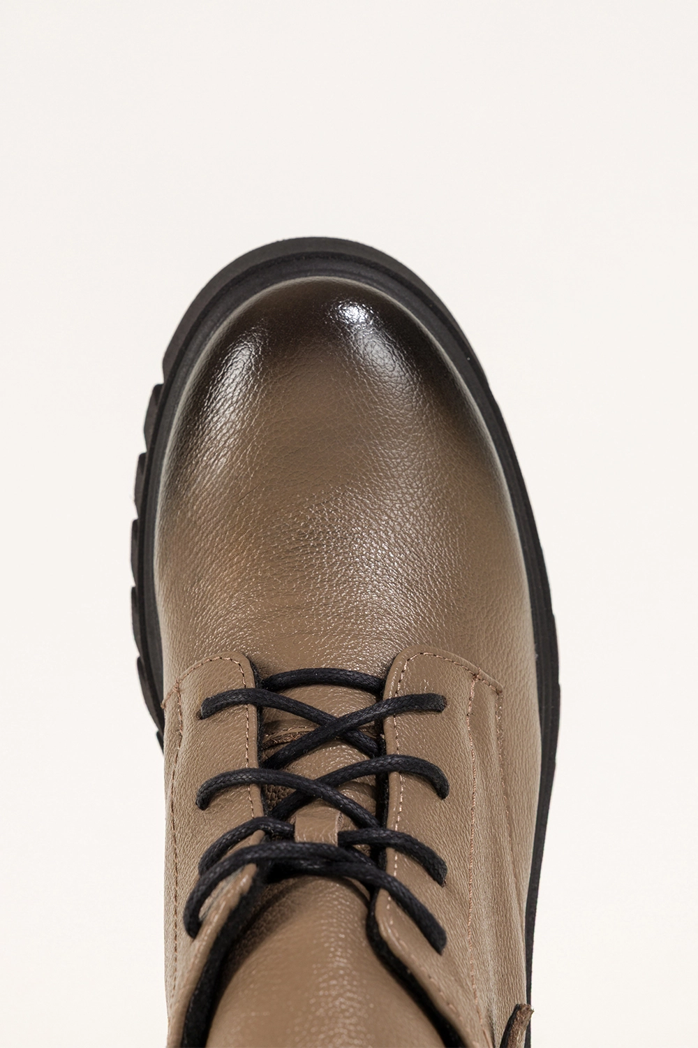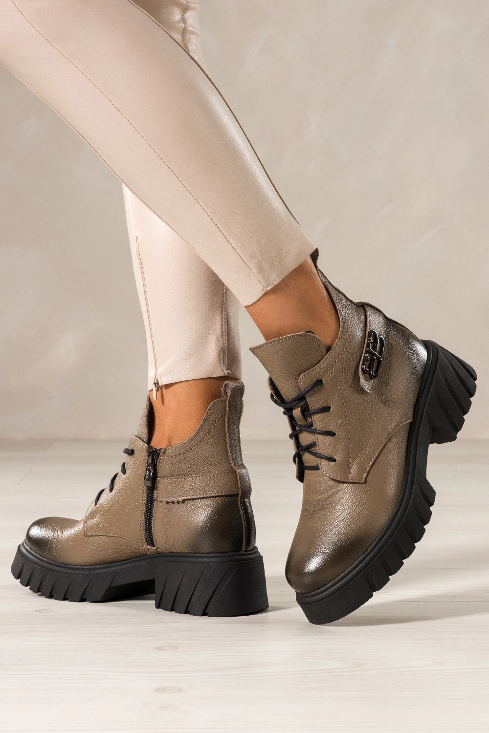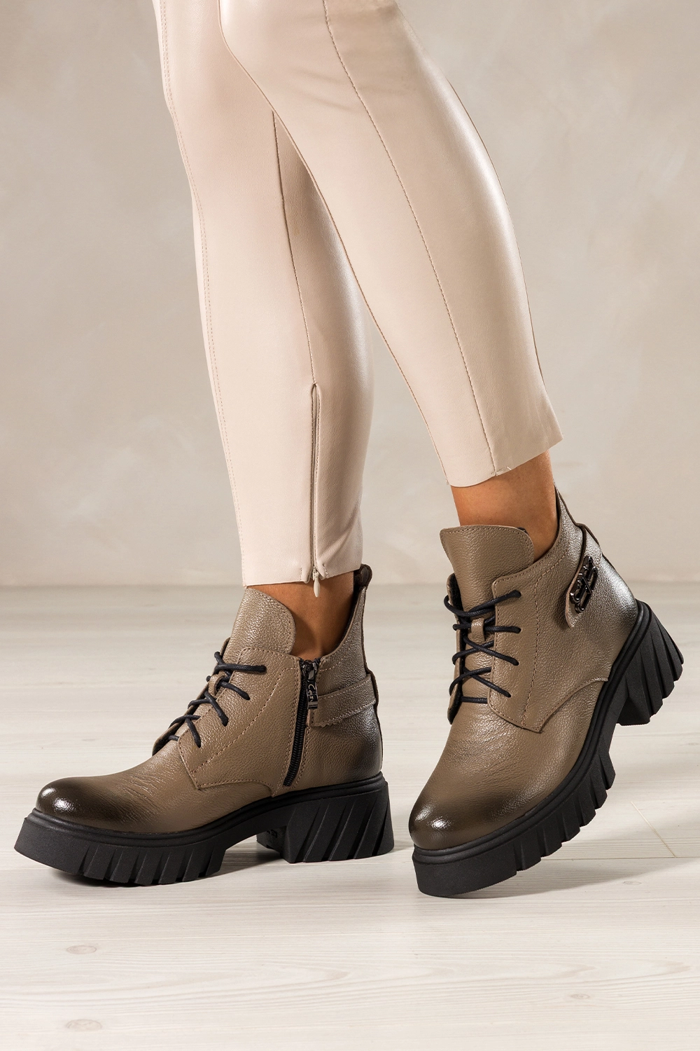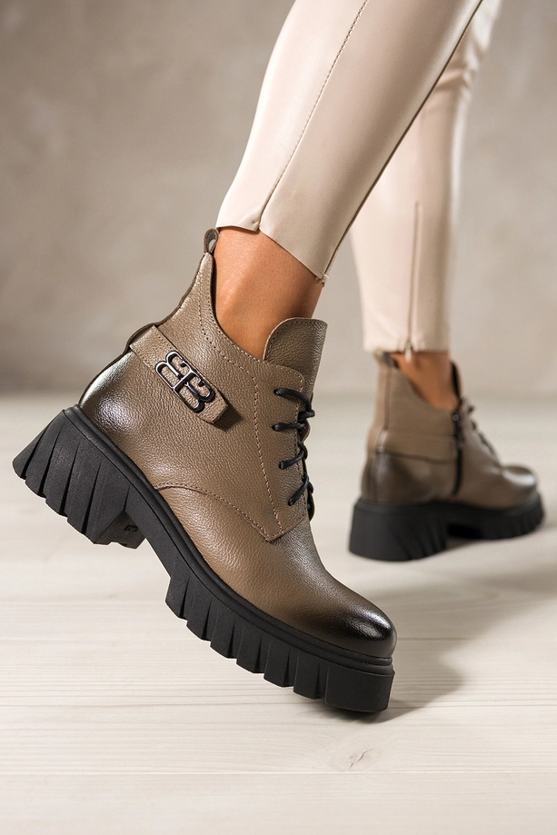 Ciemnobeżowe botki skórzane damskie na bieżnikowanej platformie wycięta cholewka stalowa ozdoba sznurowane PRODUKT POLSKI Casu 39516
