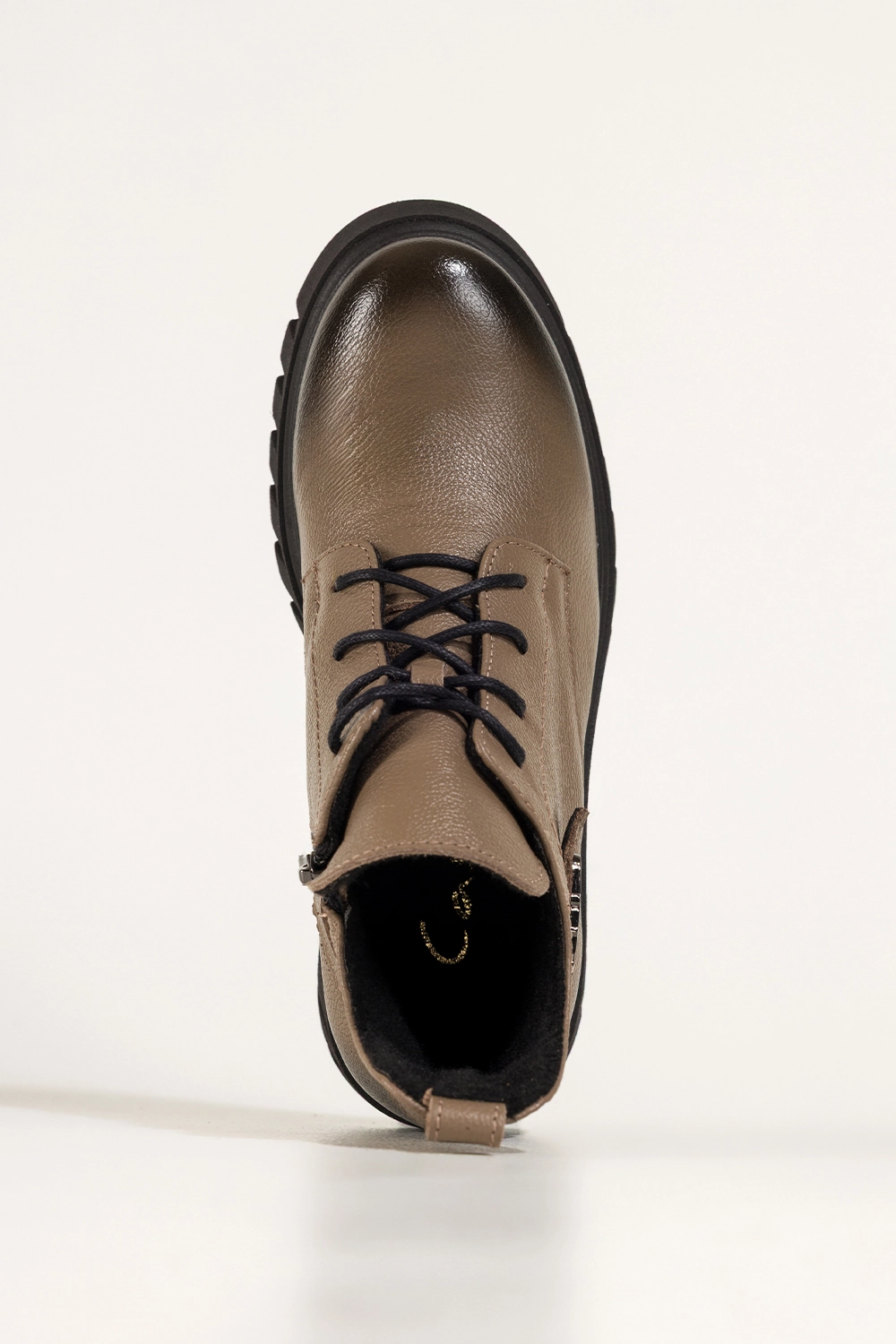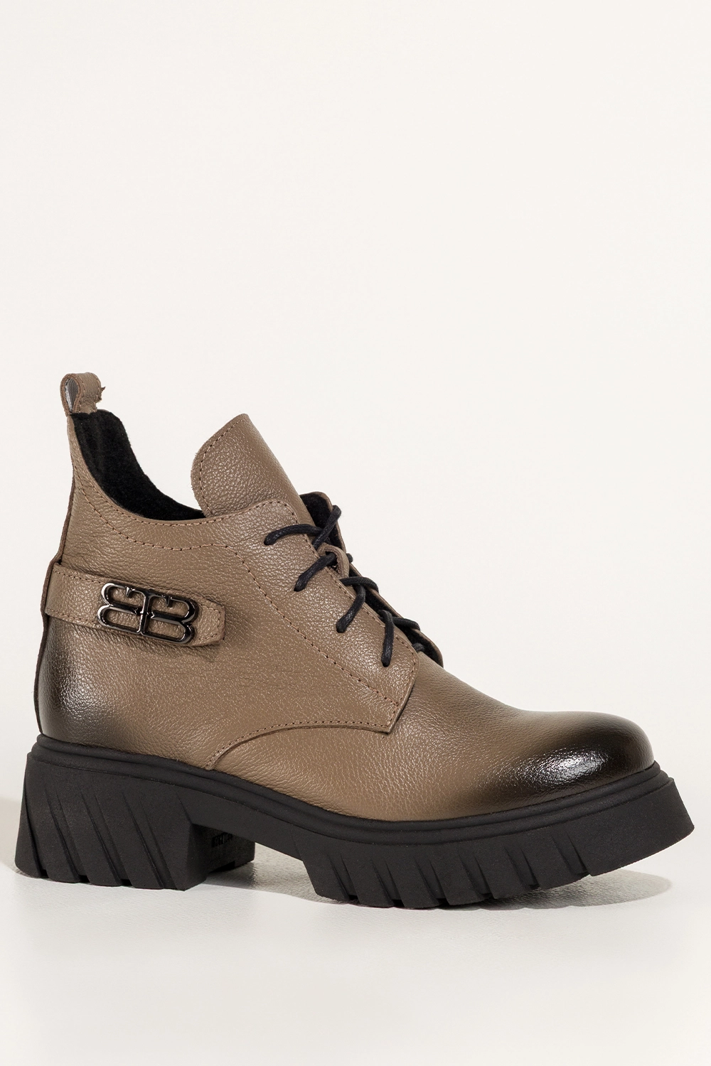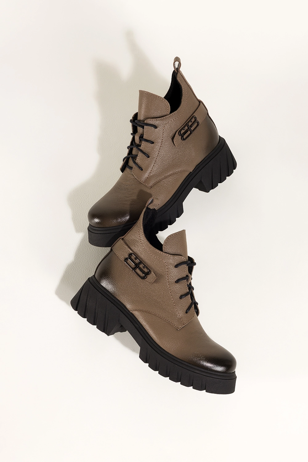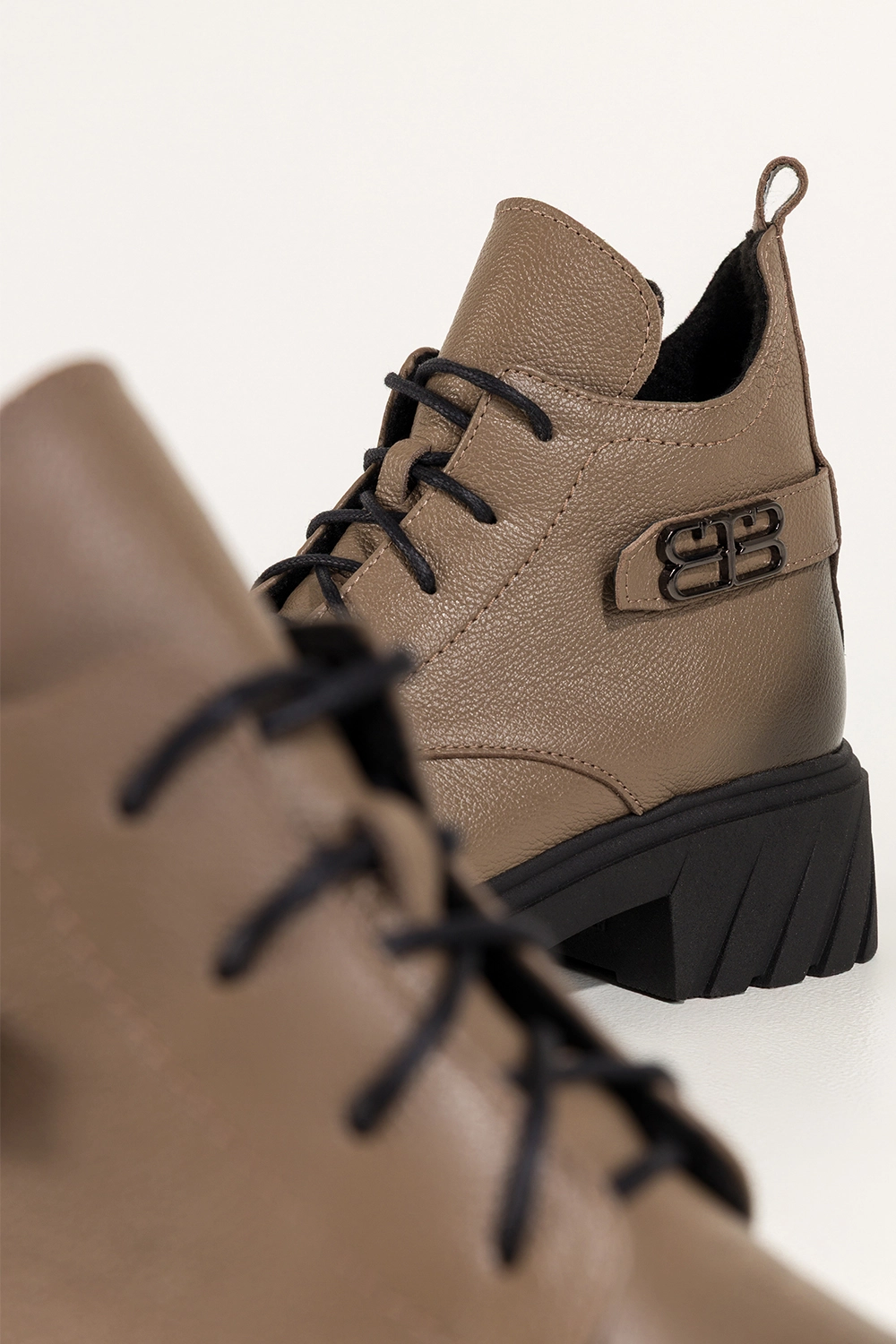 Ciemnobeżowe botki skórzane damskie na bieżnikowanej platformie wycięta cholewka stalowa ozdoba sznurowane PRODUKT POLSKI Casu 39516
