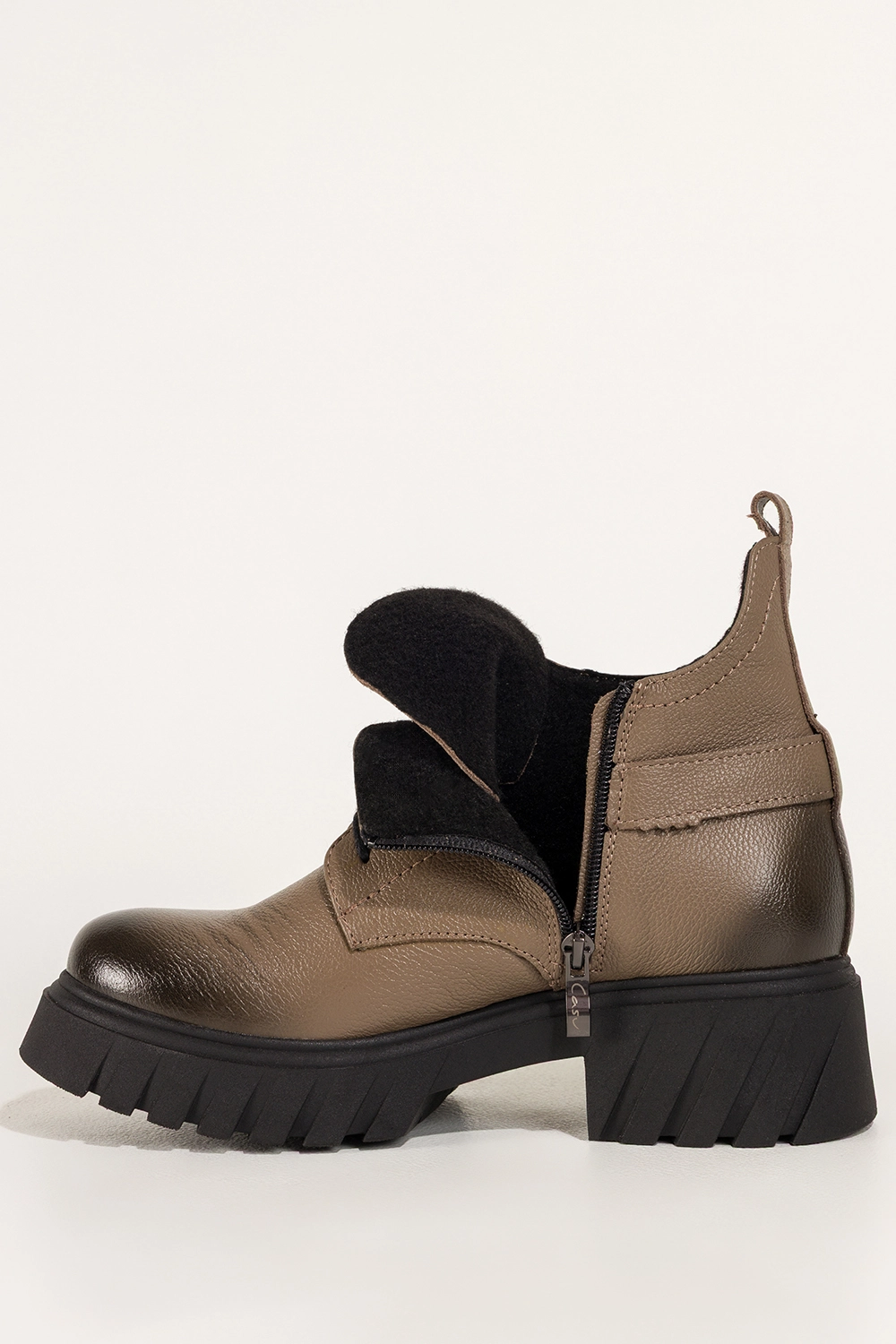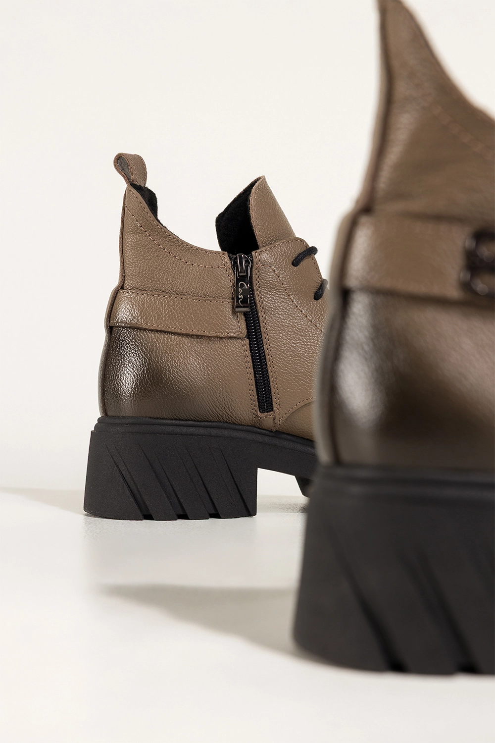 Ciemnobeżowe botki skórzane damskie na bieżnikowanej platformie z wyciętą cholewką i stalową ozdobą Casu model 39516. Wykonane z wysokogatunkowej skóry naturalnej, gwarantują wyjątkową trwałość oraz perfekcyjne dopasowanie do stopy. Miękka wkładka z materiału oraz wewnętrzne ocieplenie kocem obuwniczym zapewniają komfort termiczny nawet w chłodniejsze dni. Dodatkowe czarne sznurówki i boczny zamek umożliwiają szybkie i wygodne zakładanie, a zaokrąglony nosek zwiększa wygodę noszenia przez cały dzień.