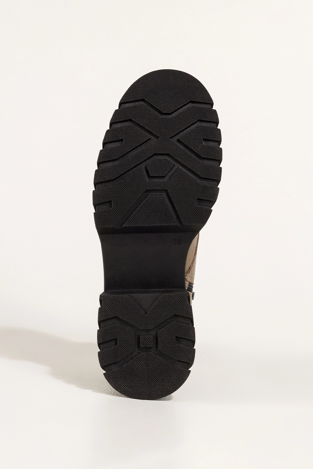 Stylowe wycięcie w cholewce oraz metaliczna stalowa ozdoba nadają botkom charakterystyczny, designerski wygląd. Ciemnobeżowy kolor sprawia, że obuwie świetnie komponuje się z wieloma stylizacjami, zarówno codziennymi, jak i bardziej eleganckimi. To model, który bez trudu dopasujesz do jeansów, sukienki czy wełnianego płaszcza. Bieżnikowana platforma nie tylko przyciąga wzrok, ale również zapewnia stabilność i komfort chodzenia, nawet na śliskich nawierzchniach.