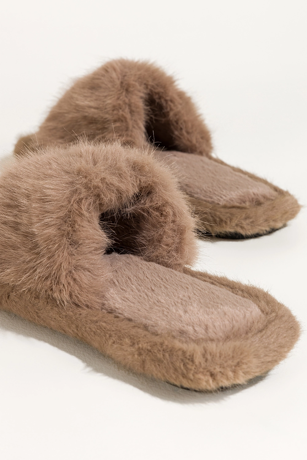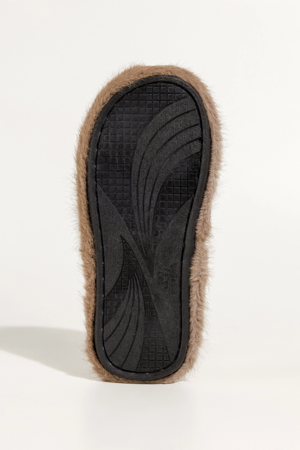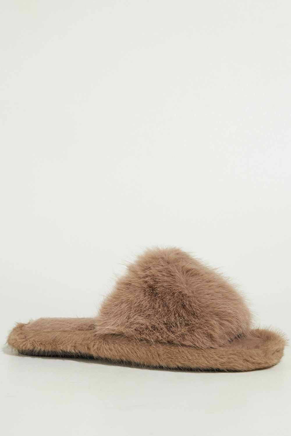 Kapcie przyciągają uwagę dzięki szerokiemu paskowi z puszystego futerka na cholewce, który nadaje im modny charakter. Ciemnobeżowy kolor wpisuje się w aktualne trendy wnętrzarskie i garderobiane, z łatwością komponując się z szlafrokami, piżamami czy dresami. To domowe obuwie, które łączy styl z funkcjonalnością, pozwalając Ci wyglądać świetnie nawet podczas leniwych dni w domu. Ich otwarty nosek dodaje lekkości i przewiewności, co zwiększa komfort użytkowania niezależnie od pory roku.