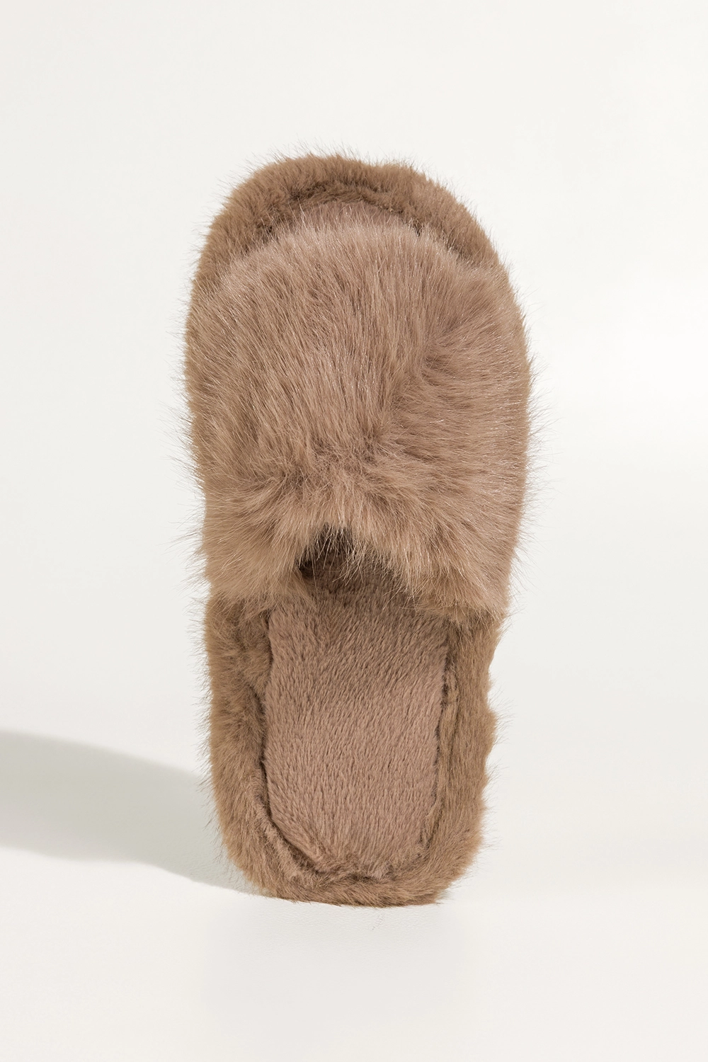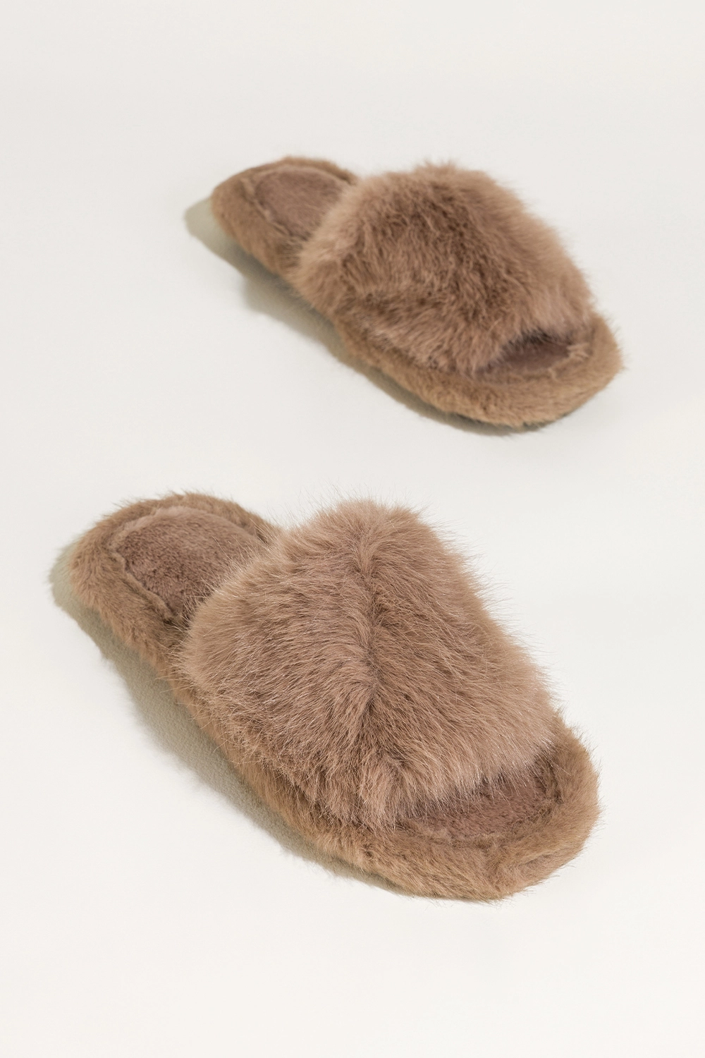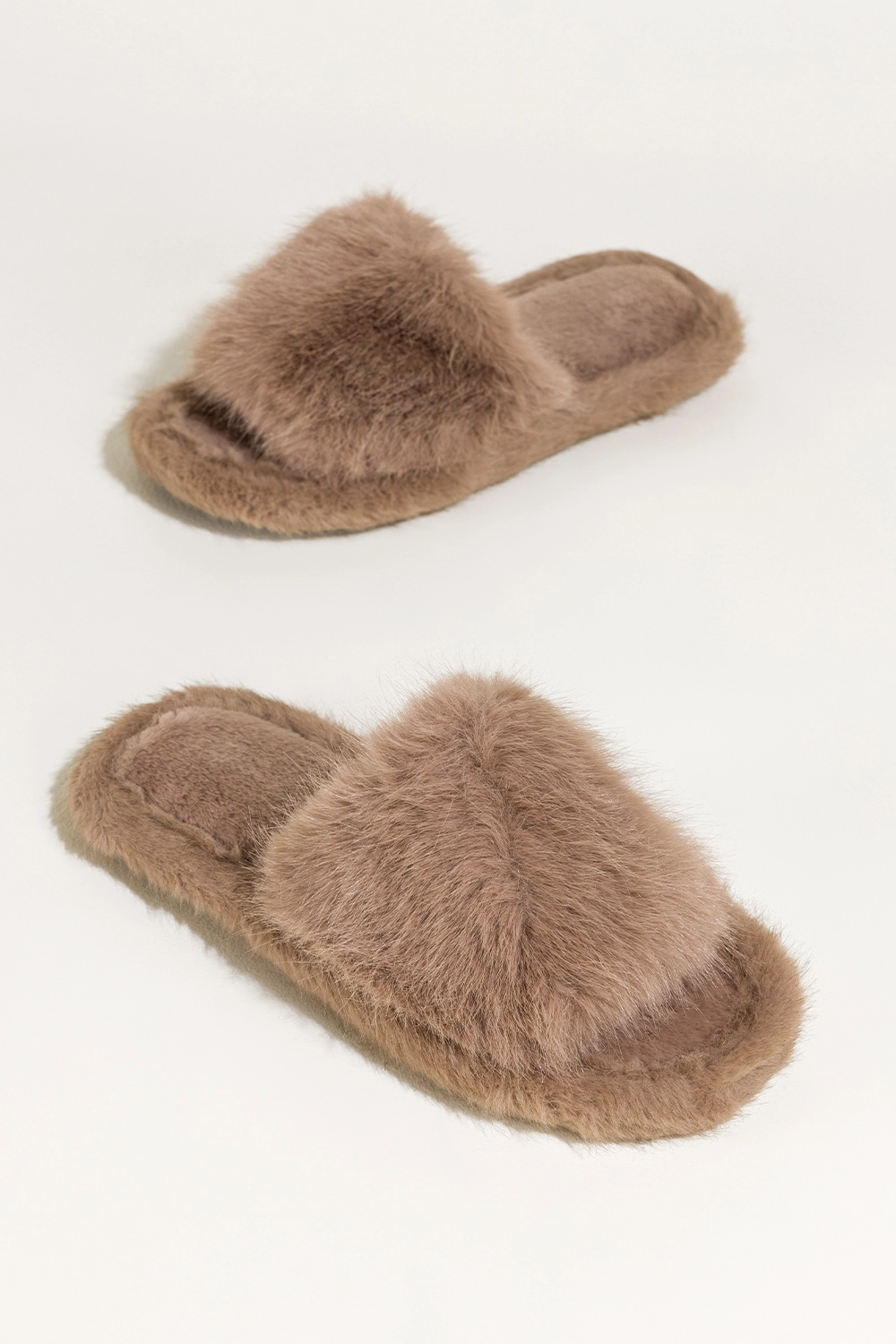 Kapcie przyciągają uwagę dzięki szerokiemu paskowi z puszystego futerka na cholewce, który nadaje im modny charakter. Ciemnobeżowy kolor wpisuje się w aktualne trendy wnętrzarskie i garderobiane, z łatwością komponując się z szlafrokami, piżamami czy dresami. To domowe obuwie, które łączy styl z funkcjonalnością, pozwalając Ci wyglądać świetnie nawet podczas leniwych dni w domu. Ich otwarty nosek dodaje lekkości i przewiewności, co zwiększa komfort użytkowania niezależnie od pory roku.