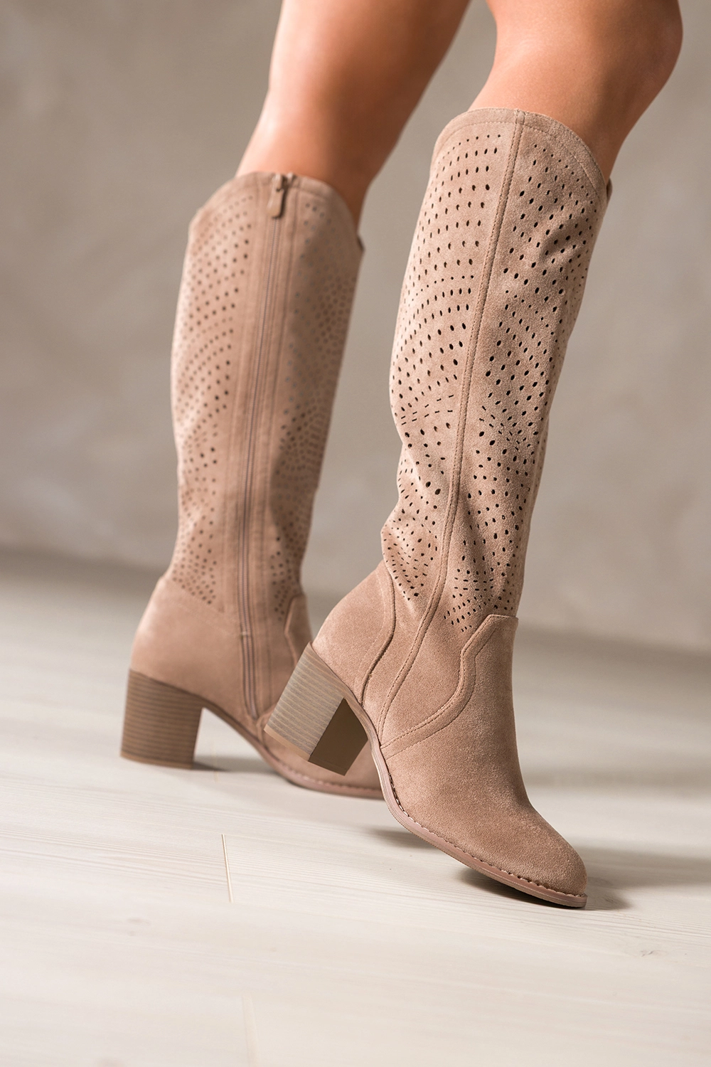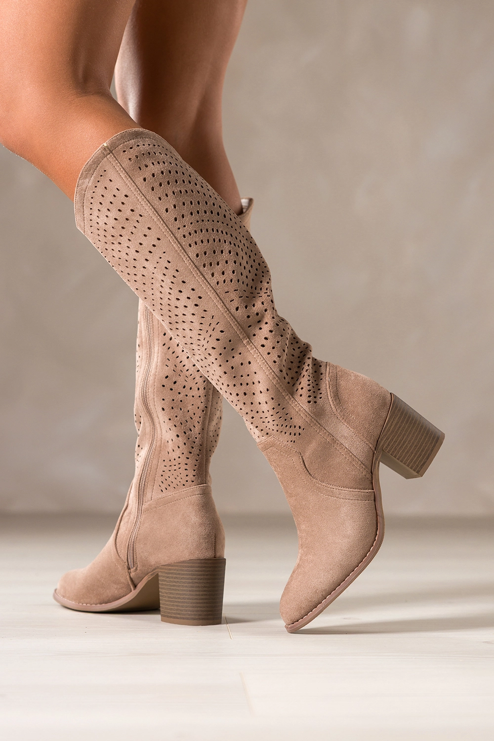 Ciemnobeżowe kozaki damskie przed kolano na słupku ażurowa cholewka Carla model S748-7 to połączenie elegancji z wyrazistym charakterem, dzięki czemu już od pierwszego spojrzenia przyciągają uwagę swoją smukłą linią oraz ażurową cholewką, która dodaje im lekkości i wyjątkowej kobiecości.