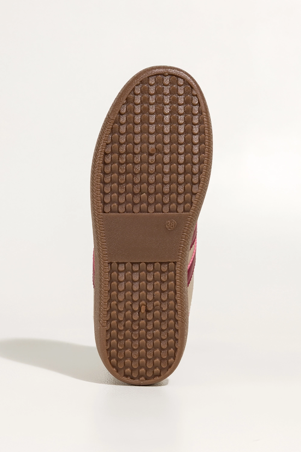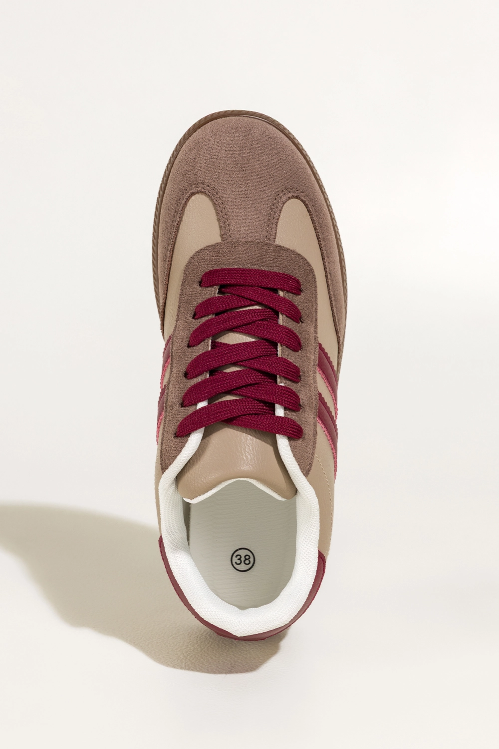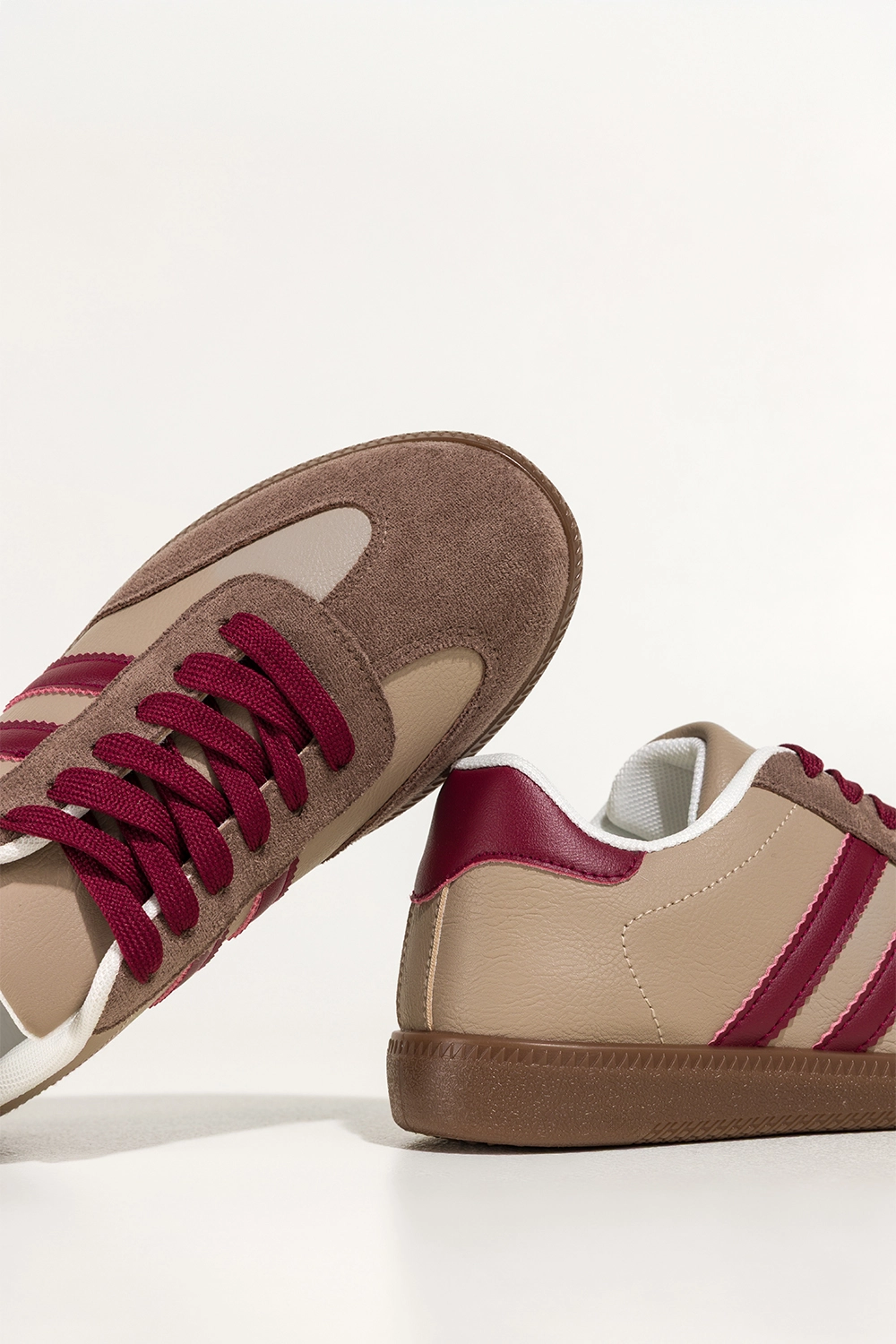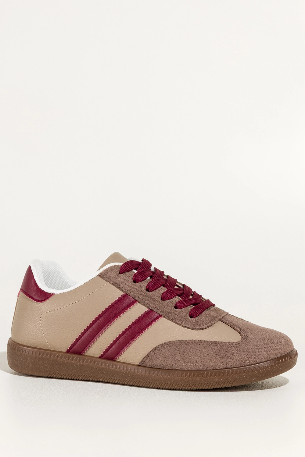 Sneakersy zachwycają modną kolorystyką, beż przełamany bordowymi akcentami sprawia, że model ten świetnie komponuje się z różnymi stylizacjami, od jeansów po sportowe sukienki. Elastyczna, płaska podeszwa dodaje lekkości, a bordowe sznurówki pozwalają idealnie dopasować obuwie do stopy. To wszechstronny model, który świetnie sprawdzi się zarówno na spacerze, zakupach, jak i w pracy.