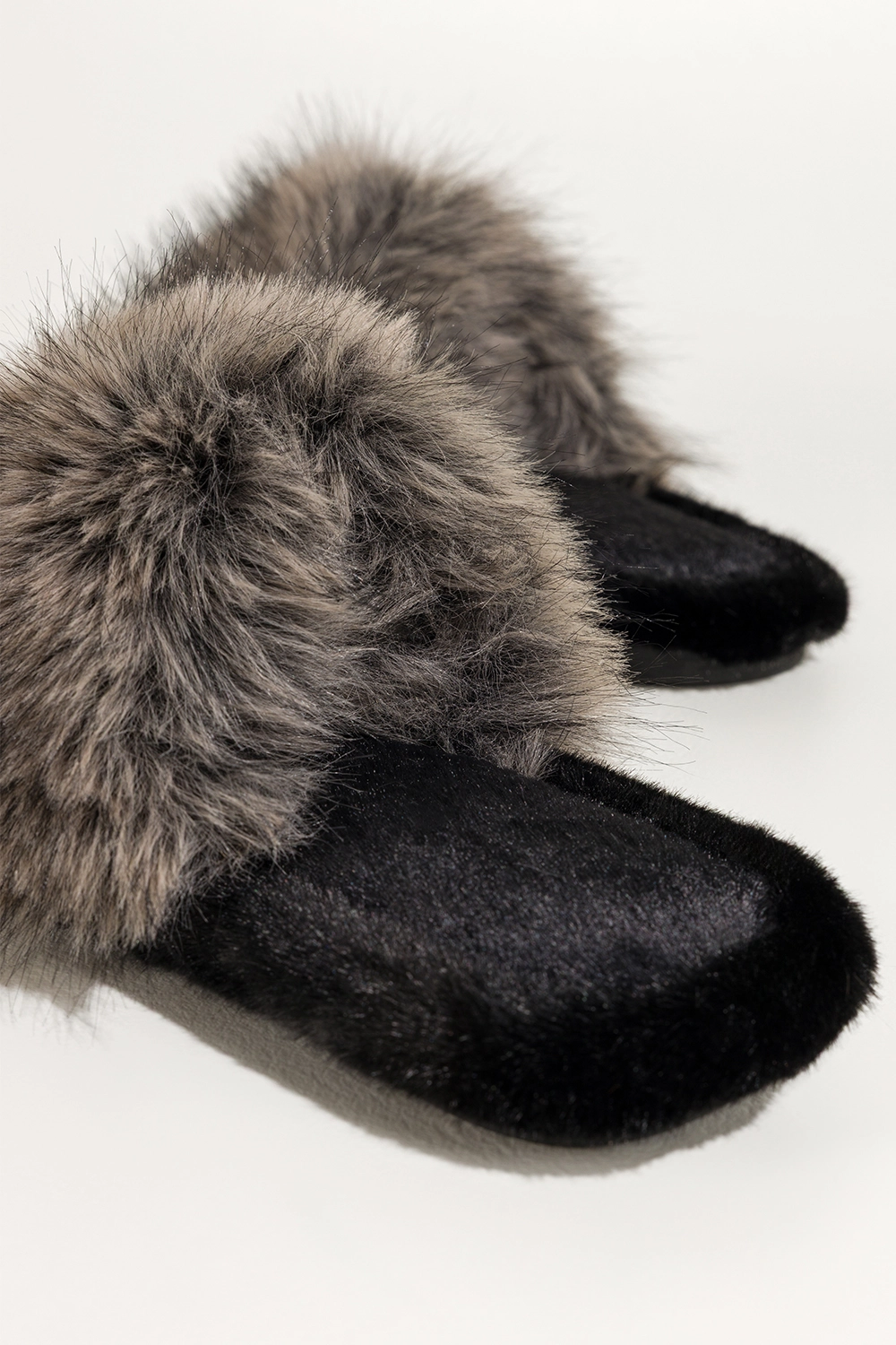 Ciemnoszare kapcie damskie obuwie domowe futrzane szeroki pasek z długim włosiem Casu UO965