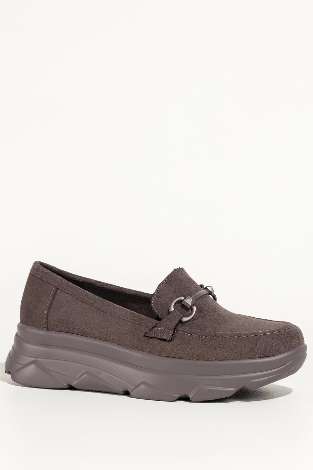 Ciemnoszare mokasyny damskie półbuty na platformie skórzana wkładka ozdoba Carla K-6-5974 to model dla kobiet, które cenią wyrazisty styl i subtelną elegancję w codziennym wydaniu. Głęboki, ciemnoszary kolor w połączeniu z aksamitną fakturą zamszu ekologicznego tworzy spójną, nowoczesną całość, a delikatna ozdoba na przodzie nadaje modelowi kobiecego charakteru. Wsuwana forma i platforma podkreślają miejski styl, zapewniając przy tym lekkość wizualną.