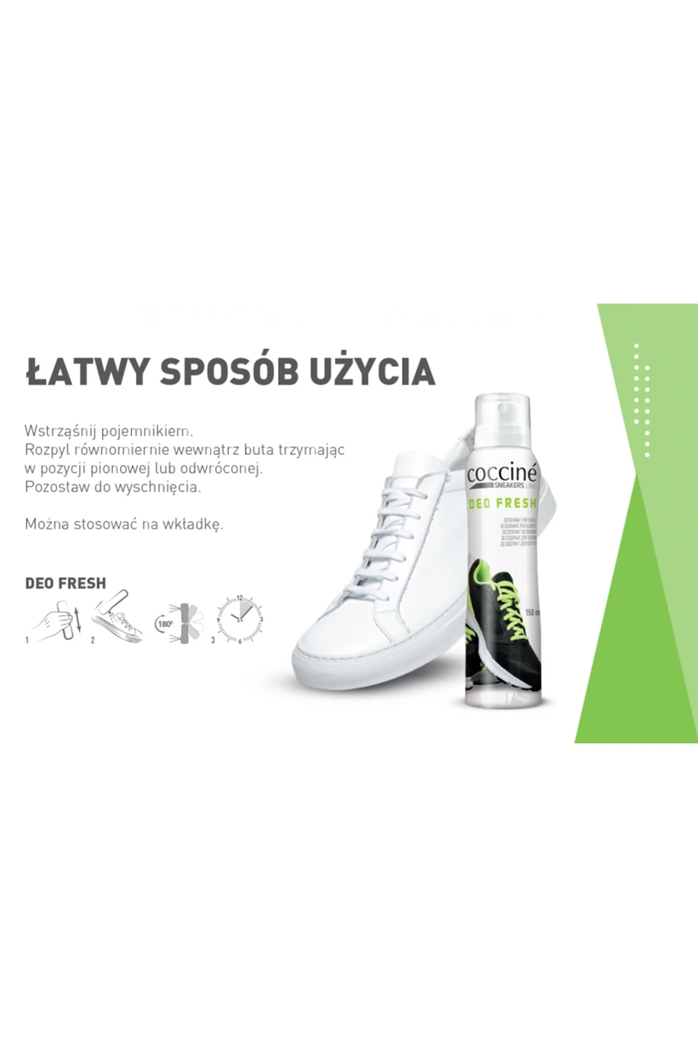 Natychmiastowa świeżość. Dezodorant do obuwia Coccine Sneakers Deo Fresh 150 ml to niezwykle skuteczny preparat, który błyskawicznie eliminuje nieprzyjemne zapachy. Jego intensywnie odświeżająca formuła pozostawia świeży i przyjemny zapach, podnosząc komfort noszenia obuwia każdego dnia.