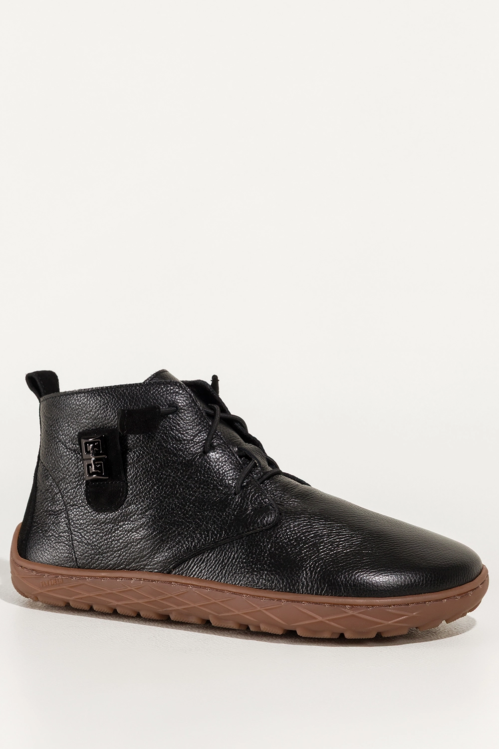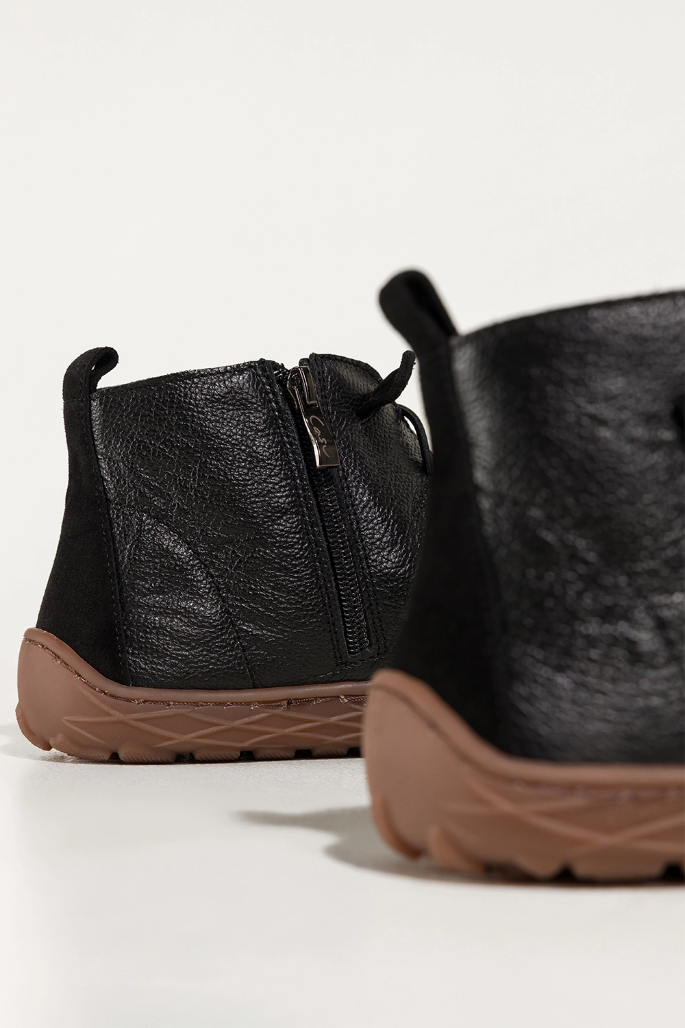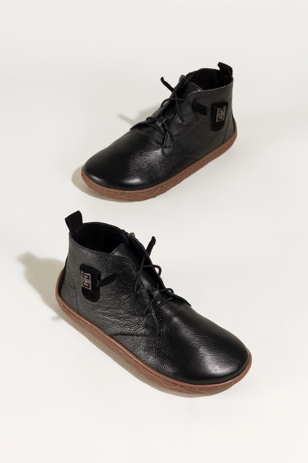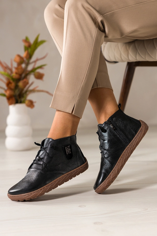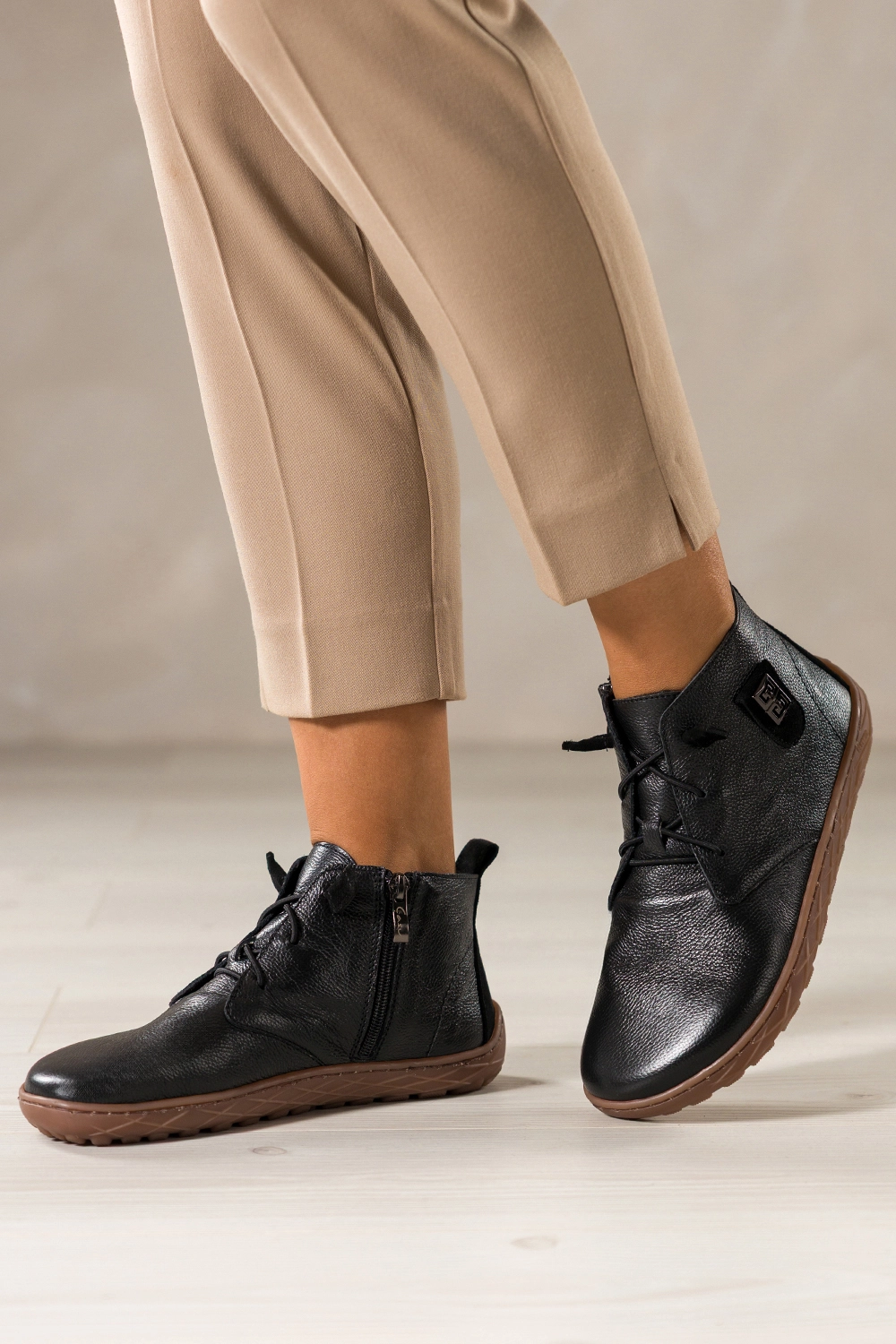 Dzięki minimalistycznemu, a zarazem nowoczesnemu designowi z ozdobną stalową aplikacją, botki doskonale komponują się zarówno z codziennymi, jak i bardziej eleganckimi stylizacjami. Elastyczne czarne sznurówki i praktyczne zapięcie na zamek zapewniają szybkie zakładanie i idealne dopasowanie. Elastyczna, żłobiona, płaska podeszwa barefoot wspiera naturalny sposób chodzenia i dba o zdrowie stóp. To model stworzony z myślą o kobietach ceniących wygodę, design i ponadczasowy styl.