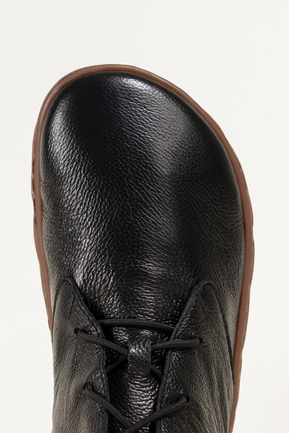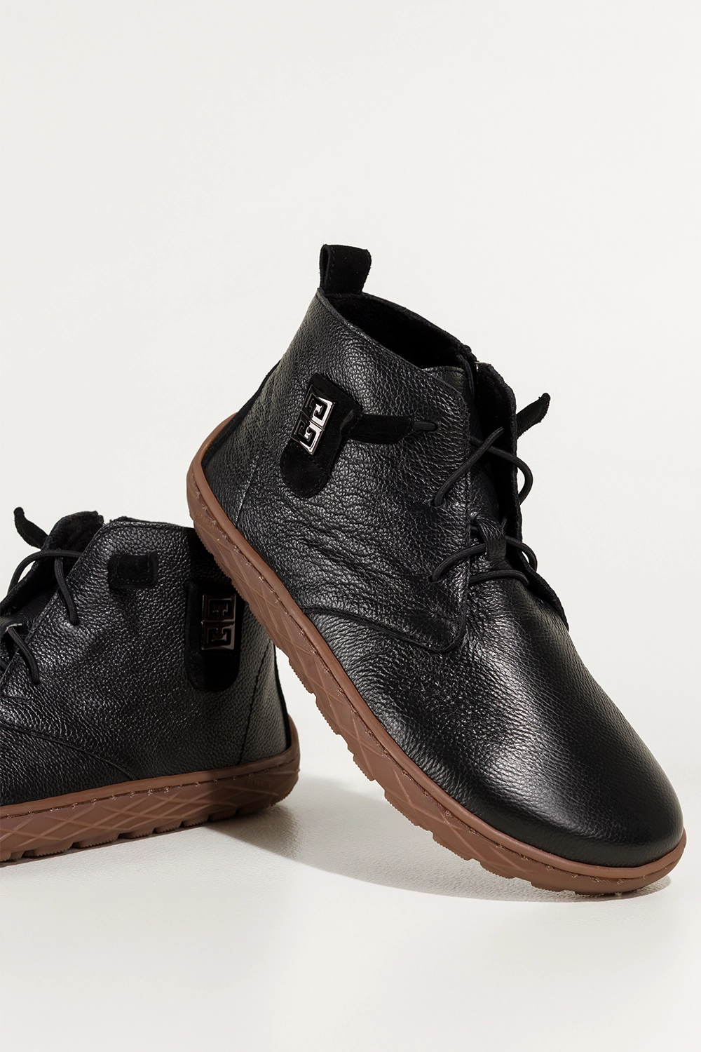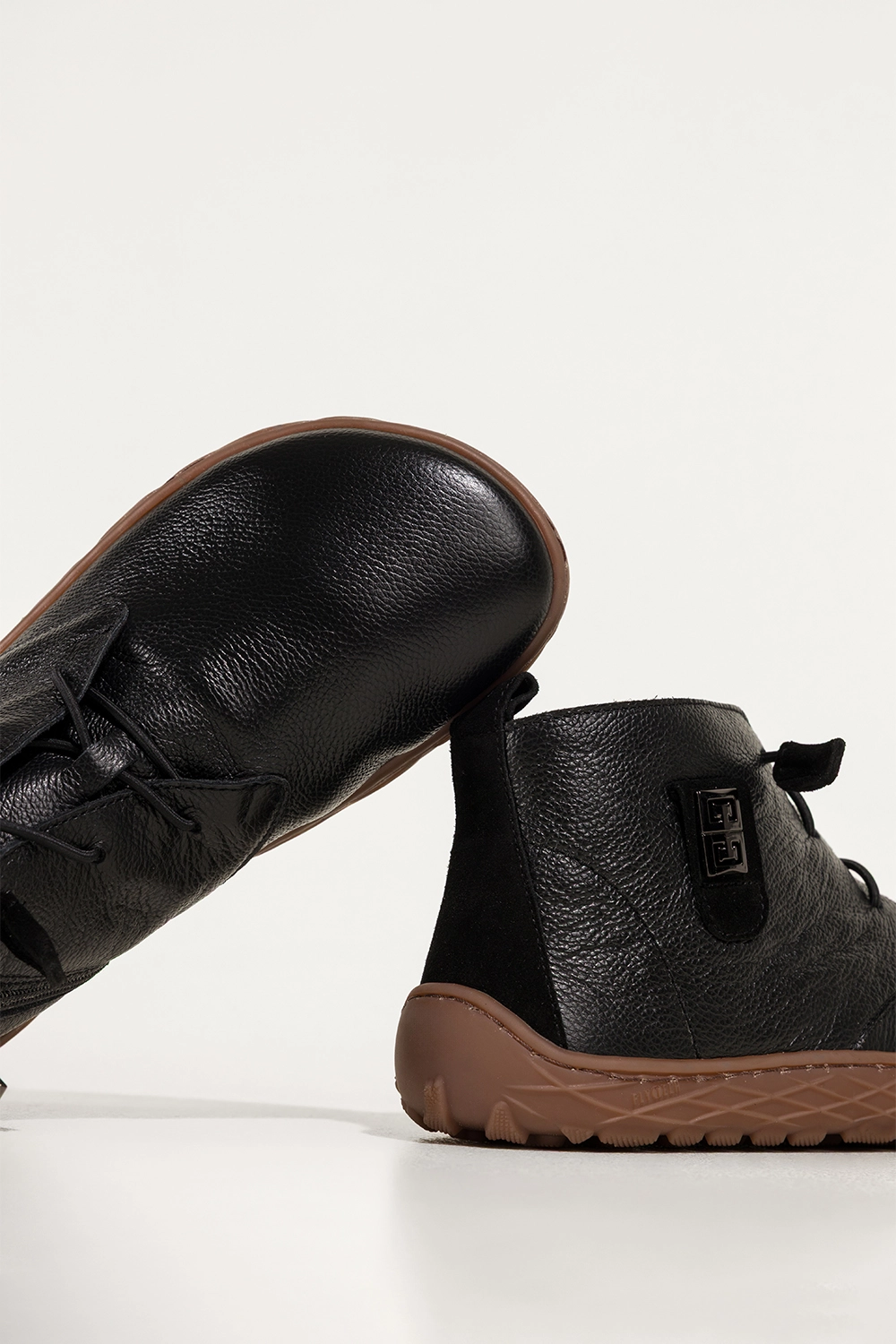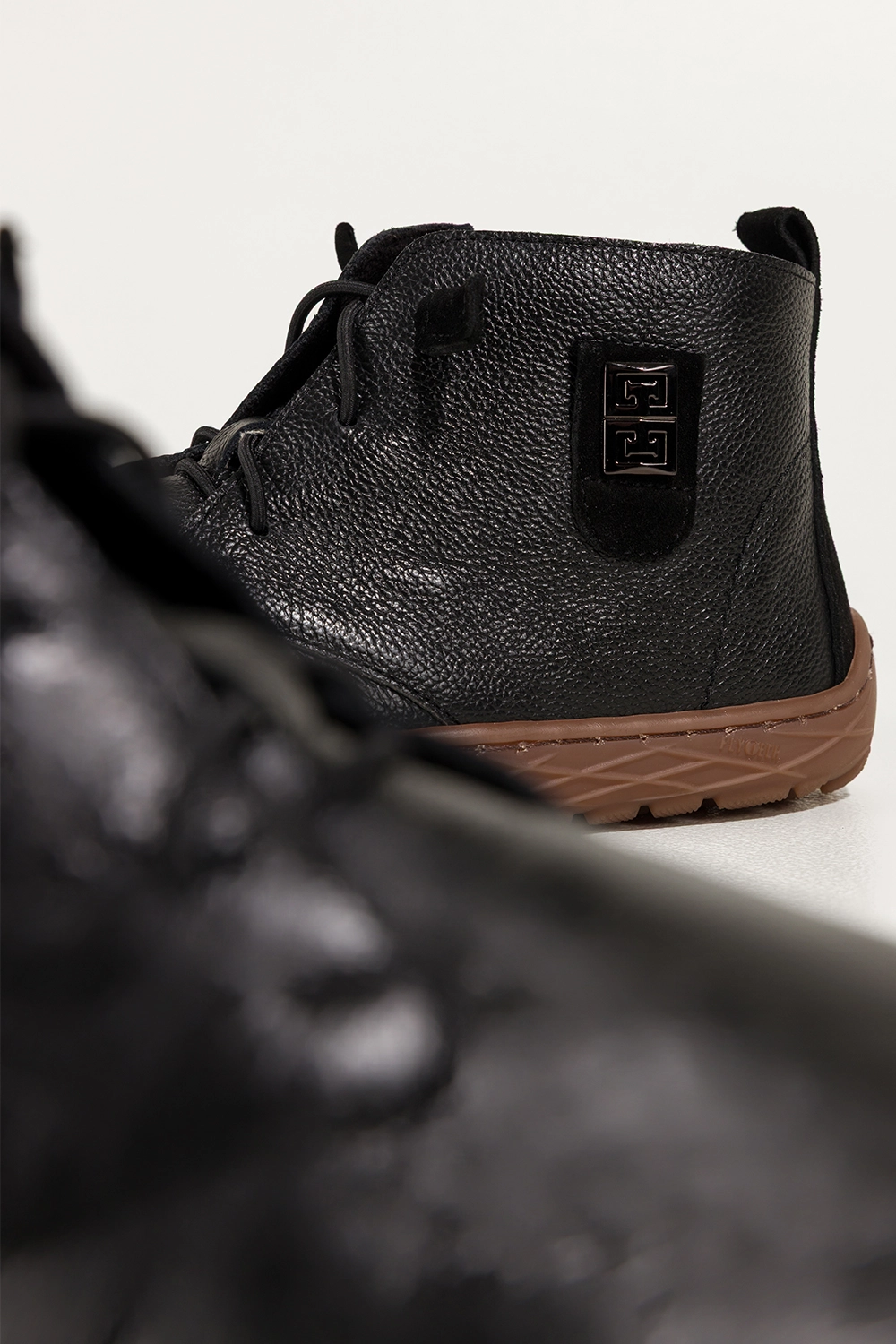 Dzięki minimalistycznemu, a zarazem nowoczesnemu designowi z ozdobną stalową aplikacją, botki doskonale komponują się zarówno z codziennymi, jak i bardziej eleganckimi stylizacjami. Elastyczne czarne sznurówki i praktyczne zapięcie na zamek zapewniają szybkie zakładanie i idealne dopasowanie. Elastyczna, żłobiona, płaska podeszwa barefoot wspiera naturalny sposób chodzenia i dba o zdrowie stóp. To model stworzony z myślą o kobietach ceniących wygodę, design i ponadczasowy styl.