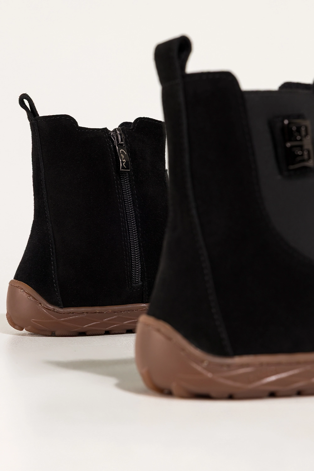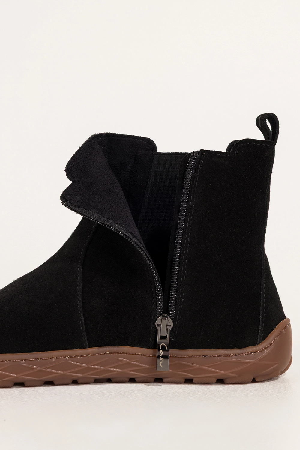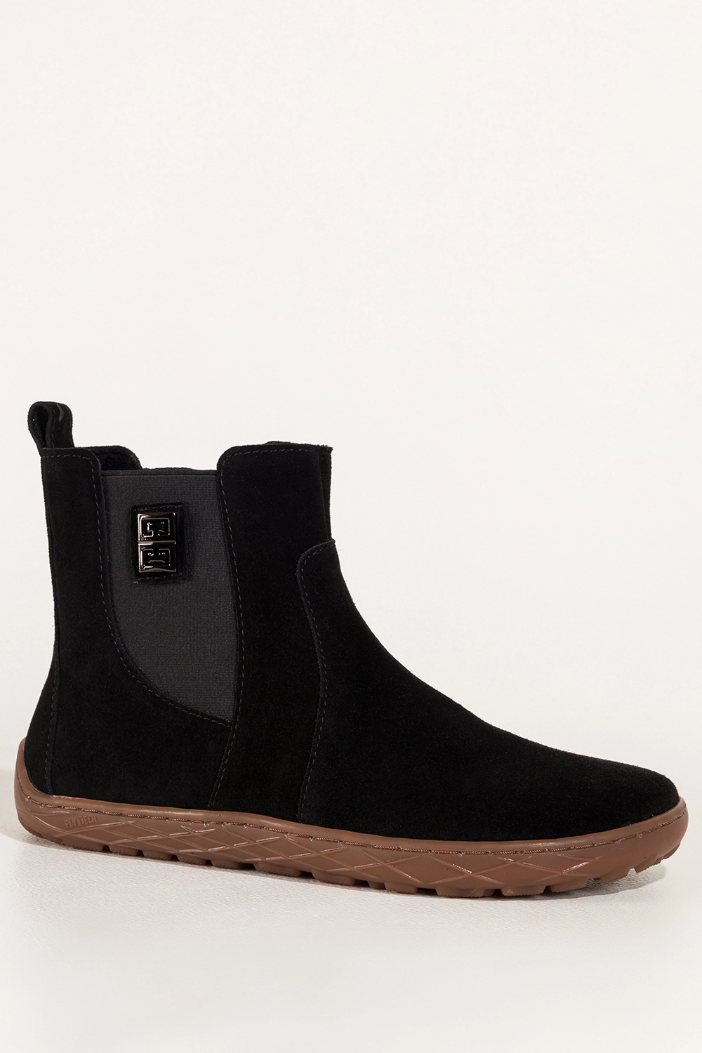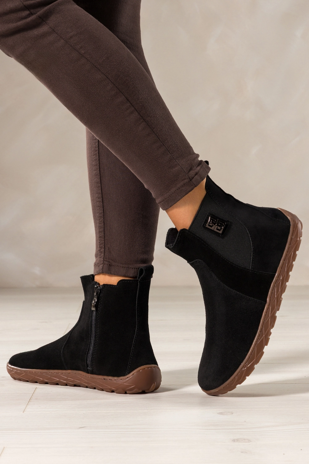 Czarne botki barefoot skórzane damskie szerokie na elastycznej płaskiej podeszwie stalowa ozdoba guma w cholewce PRODUKT POLSKI Casu model 69925. Wykonane z wysokogatunkowej skóry zamszowej, gwarantują miękkość i trwałość przez wiele sezonów. Wewnętrzna, delikatna wyściółka z materiału oraz miękka wkładka zapewniają komfort nawet podczas całodniowego noszenia. Elastyczna, żłobiona podeszwa idealnie dopasowuje się do ruchu stopy, wspierając naturalny sposób chodzenia zgodny z filozofią barefoot.