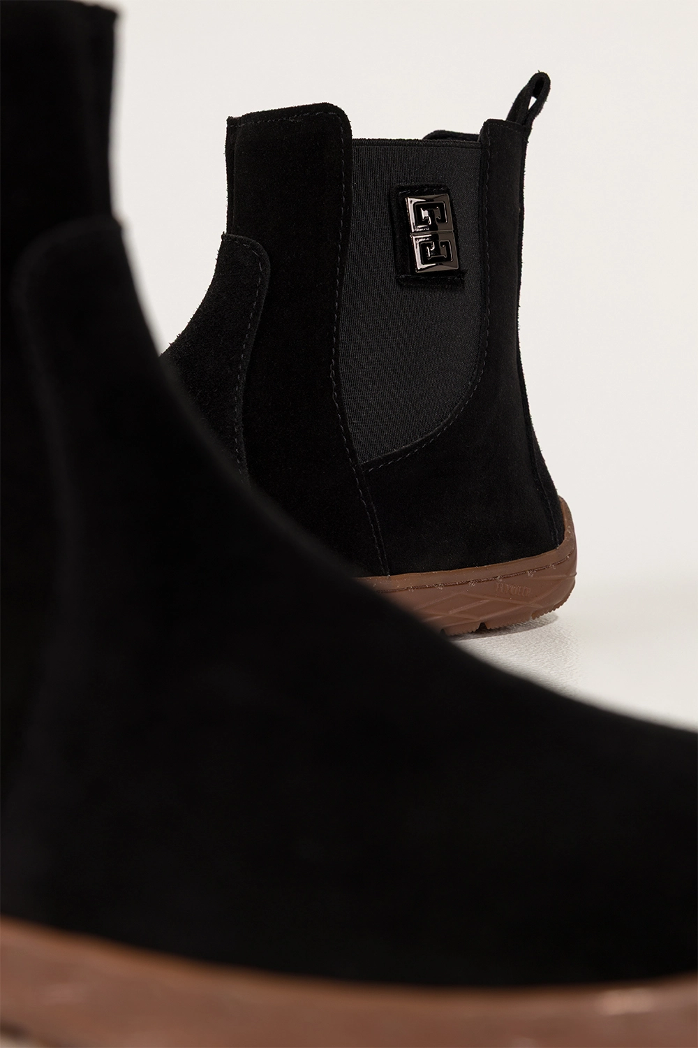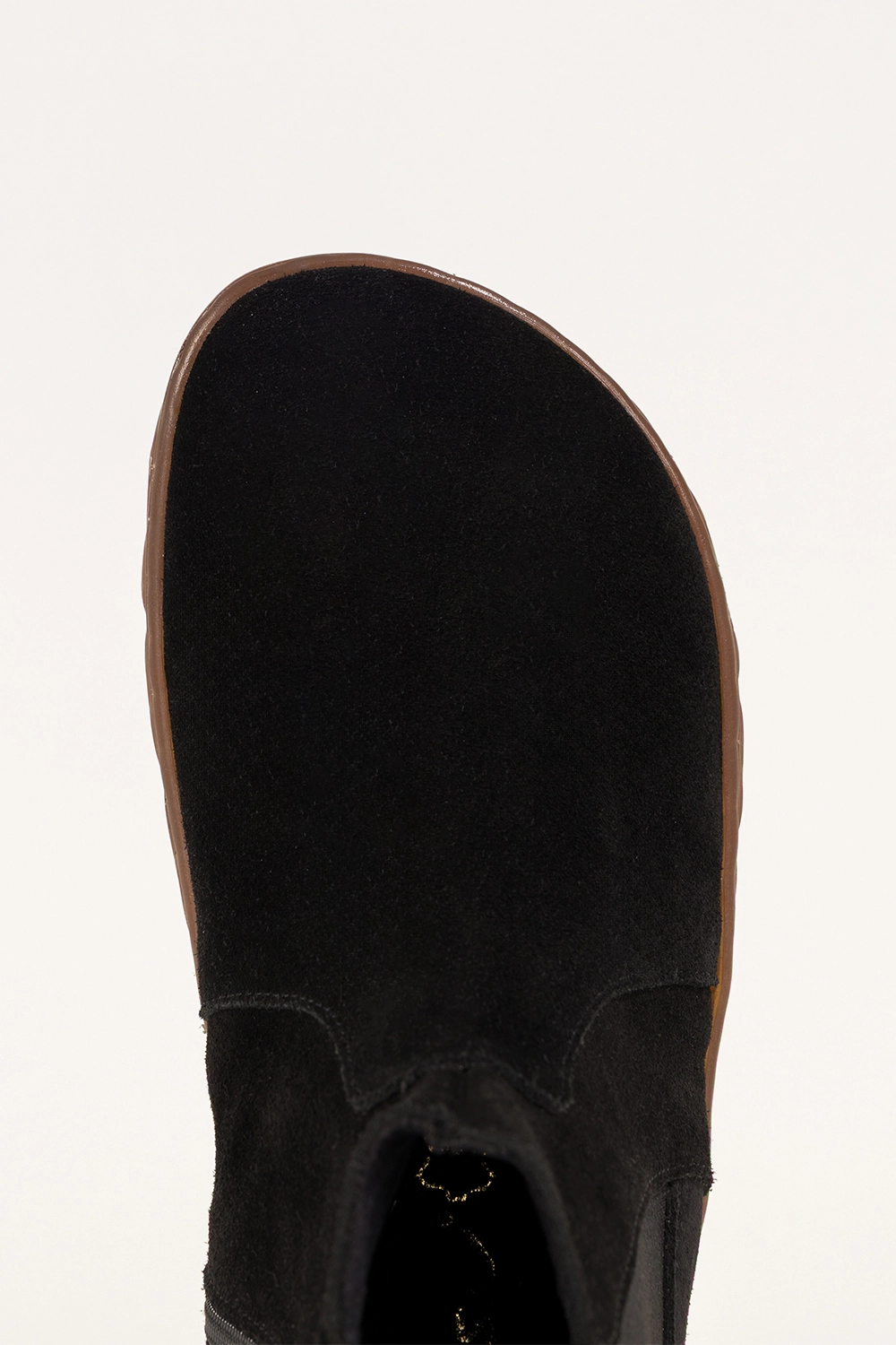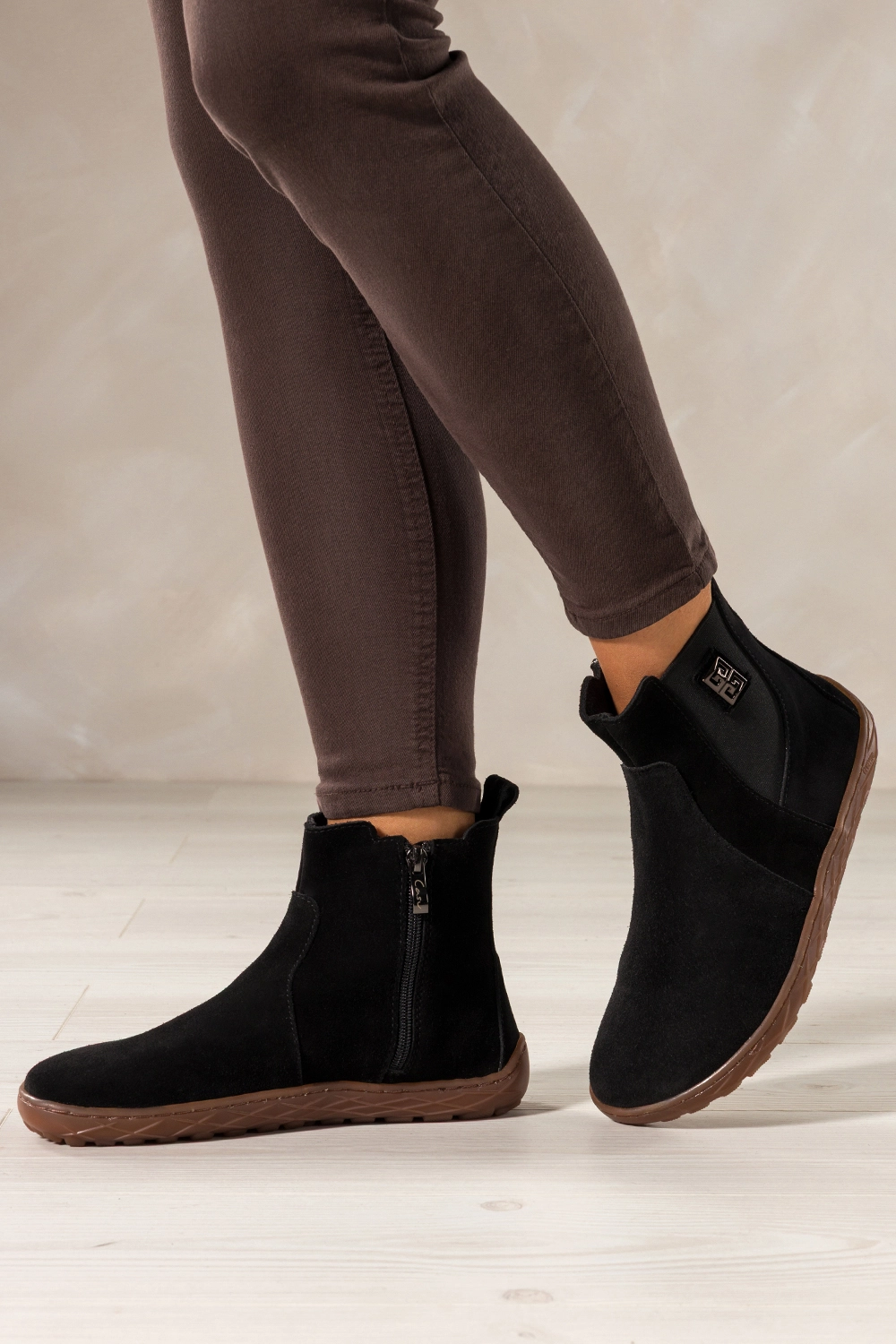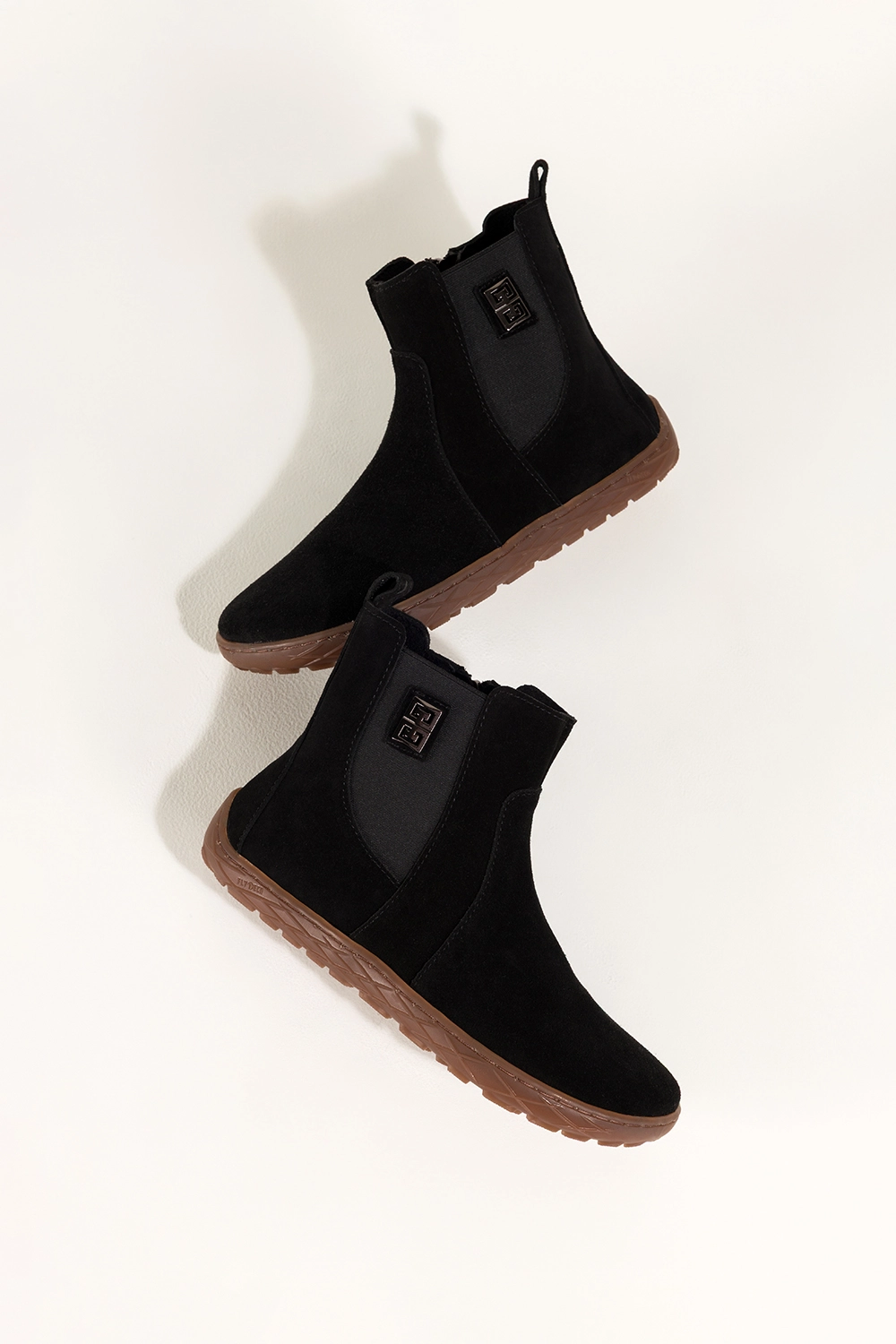 Czarne botki barefoot skórzane damskie szerokie na elastycznej płaskiej podeszwie stalowa ozdoba guma w cholewce PRODUKT POLSKI Casu model 69925. Wykonane z wysokogatunkowej skóry zamszowej, gwarantują miękkość i trwałość przez wiele sezonów. Wewnętrzna, delikatna wyściółka z materiału oraz miękka wkładka zapewniają komfort nawet podczas całodniowego noszenia. Elastyczna, żłobiona podeszwa idealnie dopasowuje się do ruchu stopy, wspierając naturalny sposób chodzenia zgodny z filozofią barefoot.
