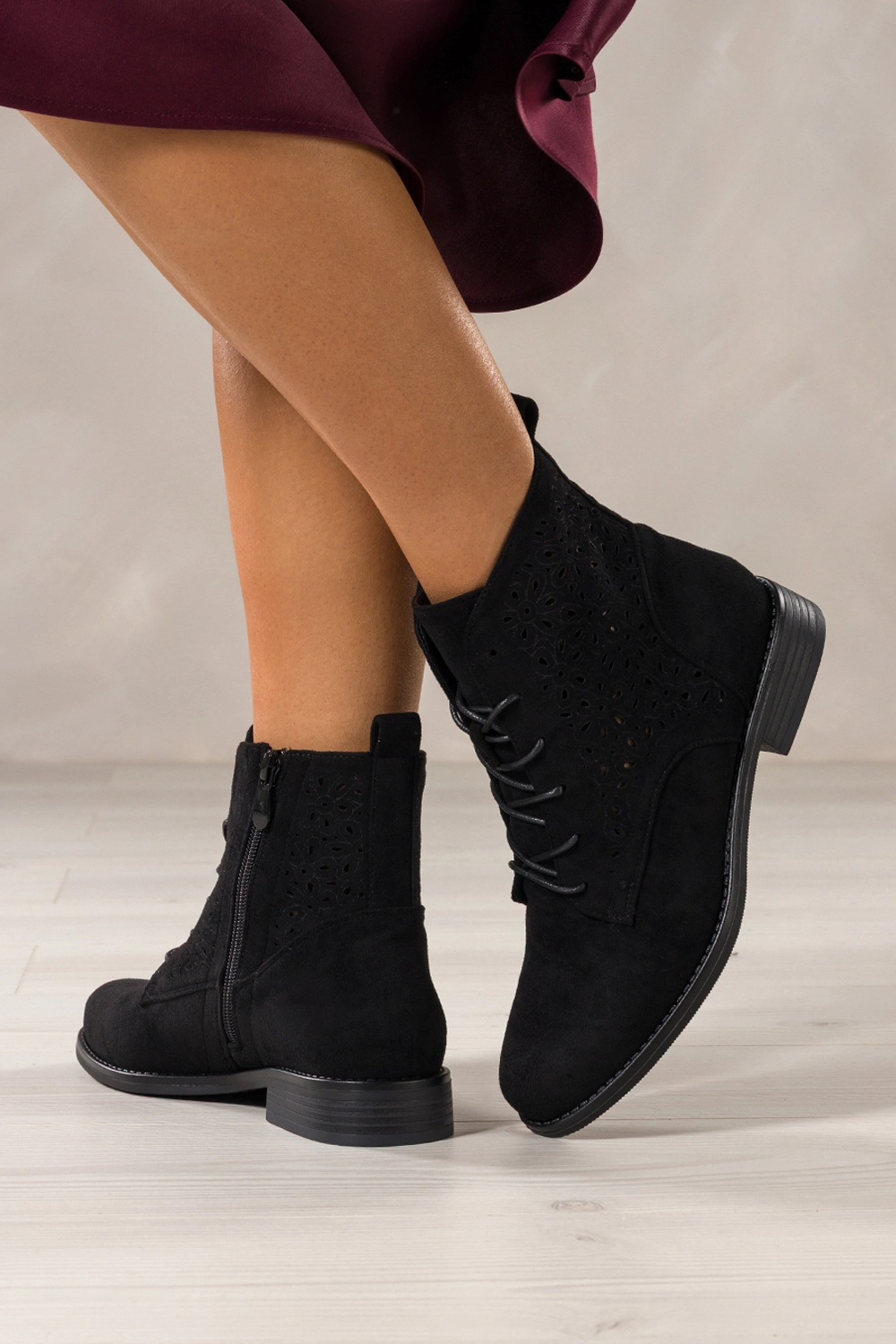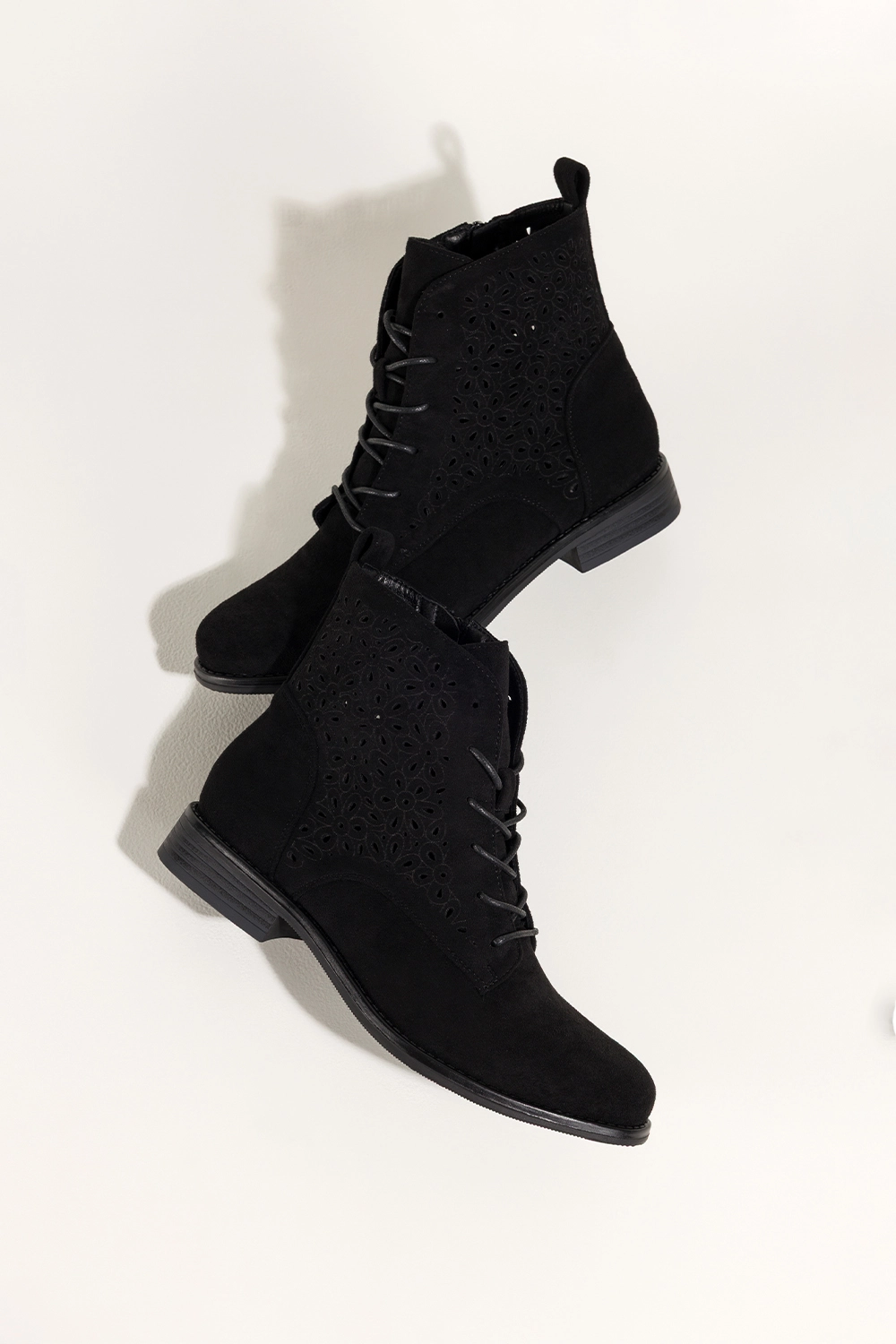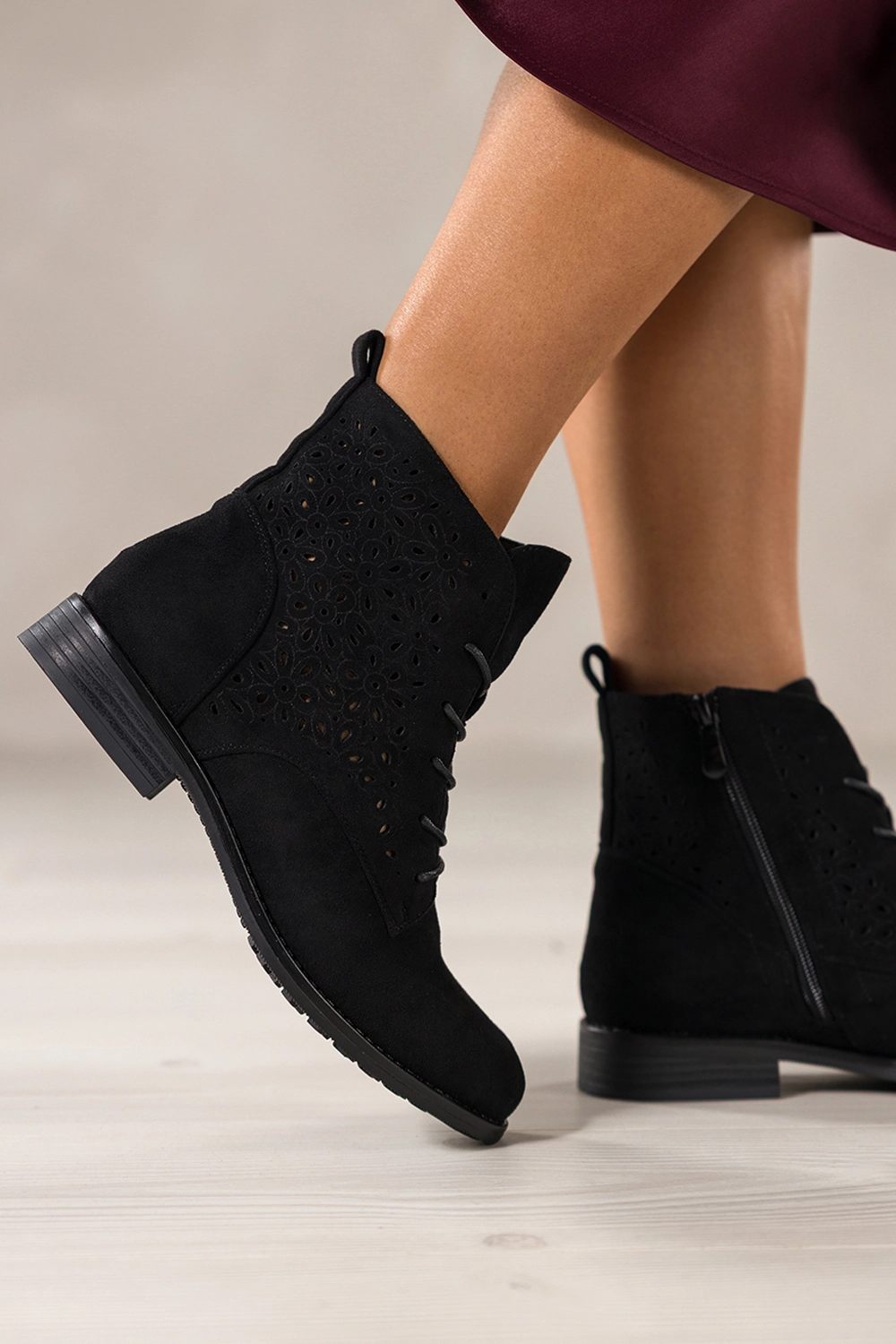 Stylizacje i wszechstronność – botki na każdą okazję. Klasyczny czarny kolor w połączeniu z unikalnym ażurowym wzorem sprawia, że botki z łatwością dopasujesz do wielu stylizacji – zarówno casualowych, jak i bardziej eleganckich. Świetnie prezentują się z jeansami rurek i białą koszulą, ale także z letnią sukienką, oversize’owym swetrem czy kombinezonem. Dzięki sznurowaniu z przodu oraz funkcjonalnemu zamkowi z boku, botki nie tylko dobrze leżą na stopie, ale również pozwalają na łatwe zakładanie i zdejmowanie. To model, który możesz nosić zarówno do pracy, na uczelnię, jak i podczas weekendowych wyjść – botki są niezwykle uniwersalne i pasują do różnorodnych okazji, podkreślając indywidualny styl każdej kobiety.