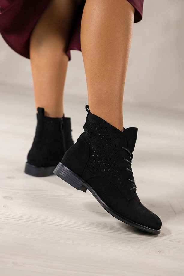 Czarne botki damskie ażurowe płaskie sznurowane Carla model S7680-8 to idealne połączenie stylu, wygody i funkcjonalności – stworzone z myślą o kobietach, które cenią sobie komfort każdego dnia, nie rezygnując z modowego sznytu. Wykonane z wysokogatunkowego zamszu ekologicznego, botki emanują subtelną elegancją, podkreśloną nowoczesnym designem i ponadczasowym kolorem. Ich ażurowa cholewka nadaje im lekkości i sprawia, że idealnie sprawdzają się w cieplejsze dni, oferując przewiewność i świeżość. To obuwie, które przyciąga wzrok nie tylko dzięki estetyce, ale również dzięki przemyślanej konstrukcji, gwarantującej komfort użytkowania przez cały dzień.