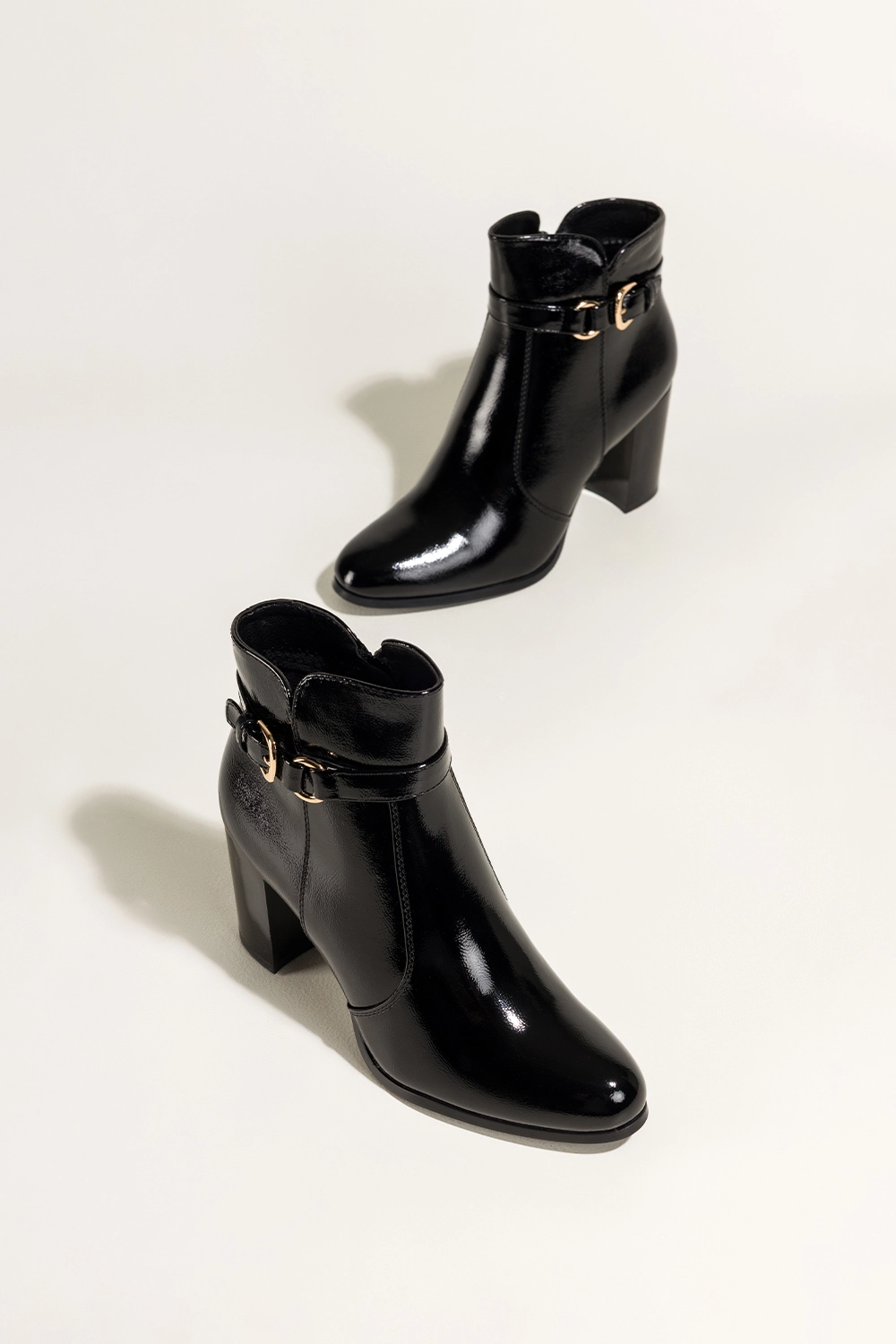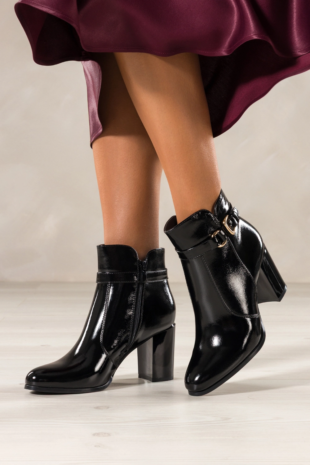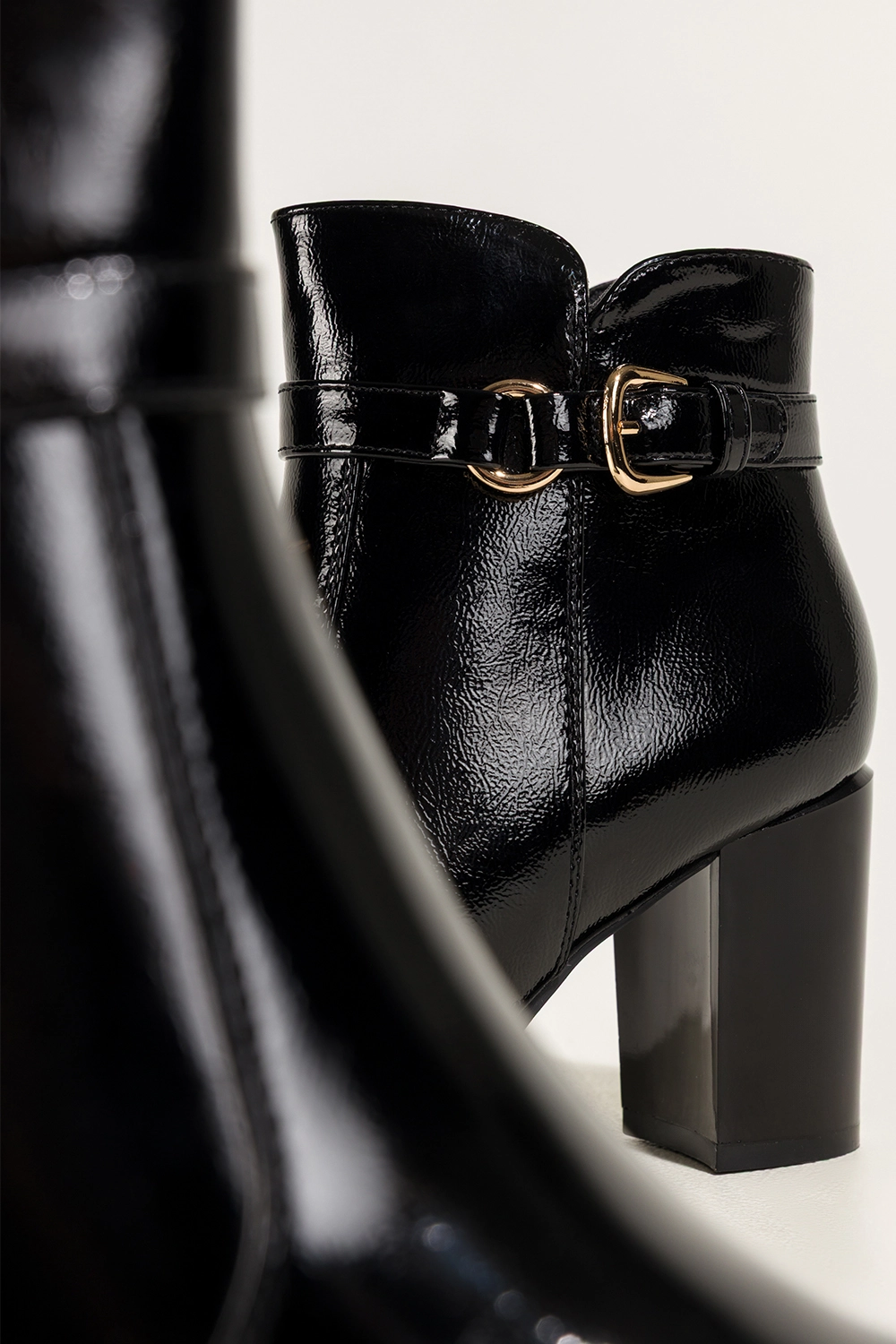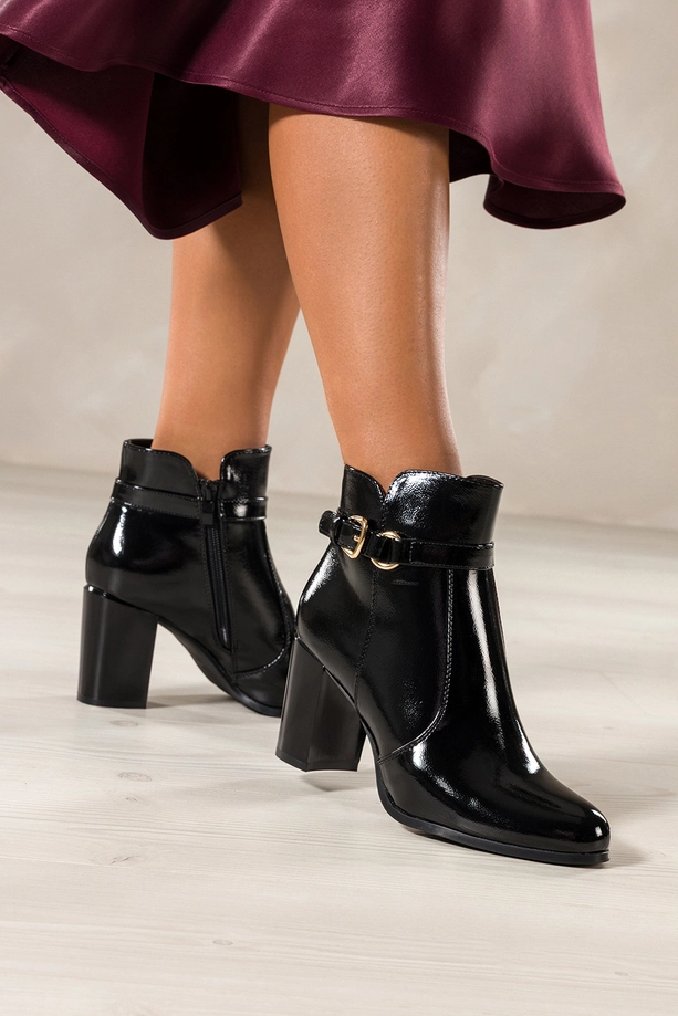 Zmysłowy połysk lakierowanej cholewki w połączeniu z ozdobnym paskiem i efektowną złotą klamrą tworzy unikalną kompozycję, która przyciąga wzrok i dodaje szyku każdej stylizacji. Te botki doskonale odnajdą się zarówno w codziennych miejskich outfitach, jak i wieczorowych zestawieniach. Świetnie komponują się z eleganckimi płaszczami, sukienkami czy klasycznymi jeansami. Ich uniwersalny, czarny kolor ułatwia dopasowanie do różnych palet barw, czyniąc je obowiązkowym elementem jesienno-zimowej garderoby każdej kobiety.