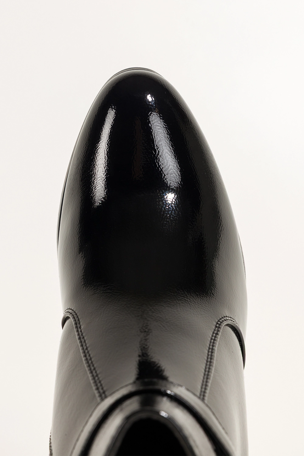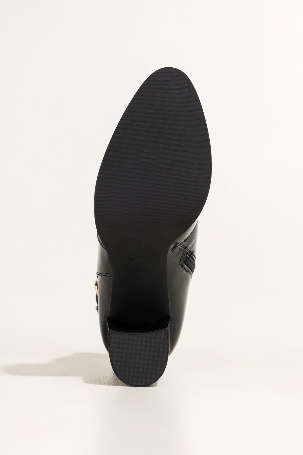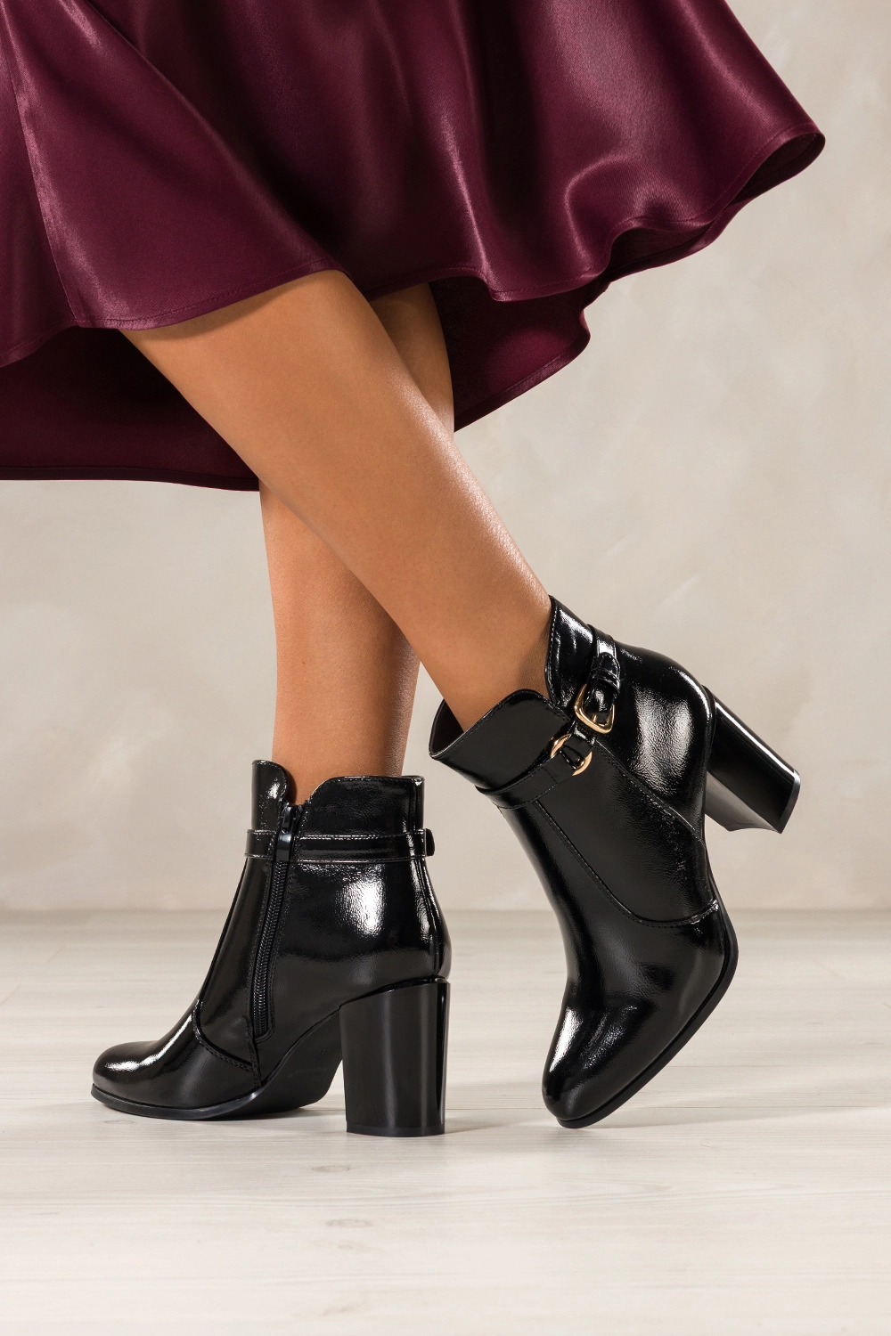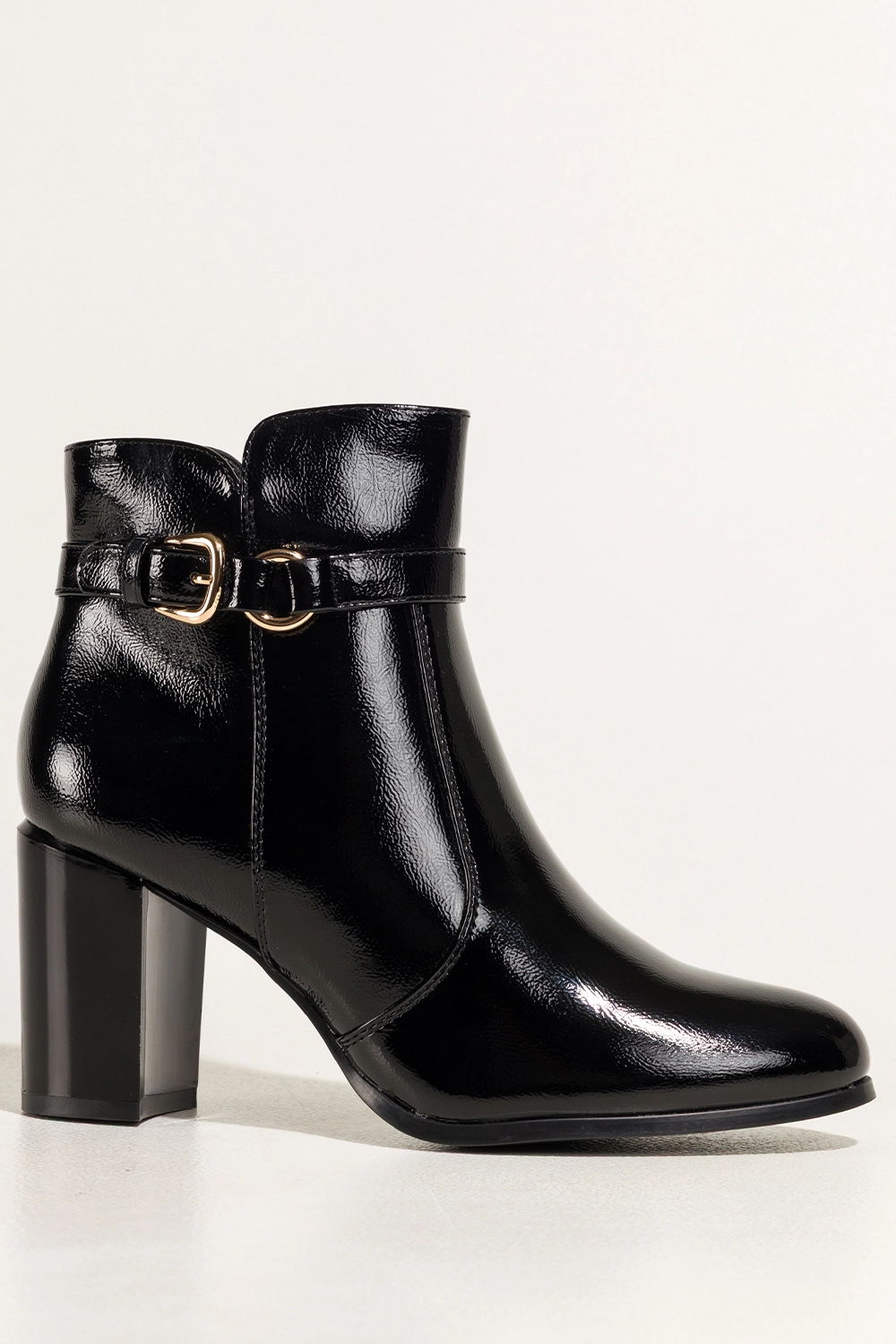 Zmysłowy połysk lakierowanej cholewki w połączeniu z ozdobnym paskiem i efektowną złotą klamrą tworzy unikalną kompozycję, która przyciąga wzrok i dodaje szyku każdej stylizacji. Te botki doskonale odnajdą się zarówno w codziennych miejskich outfitach, jak i wieczorowych zestawieniach. Świetnie komponują się z eleganckimi płaszczami, sukienkami czy klasycznymi jeansami. Ich uniwersalny, czarny kolor ułatwia dopasowanie do różnych palet barw, czyniąc je obowiązkowym elementem jesienno-zimowej garderoby każdej kobiety.