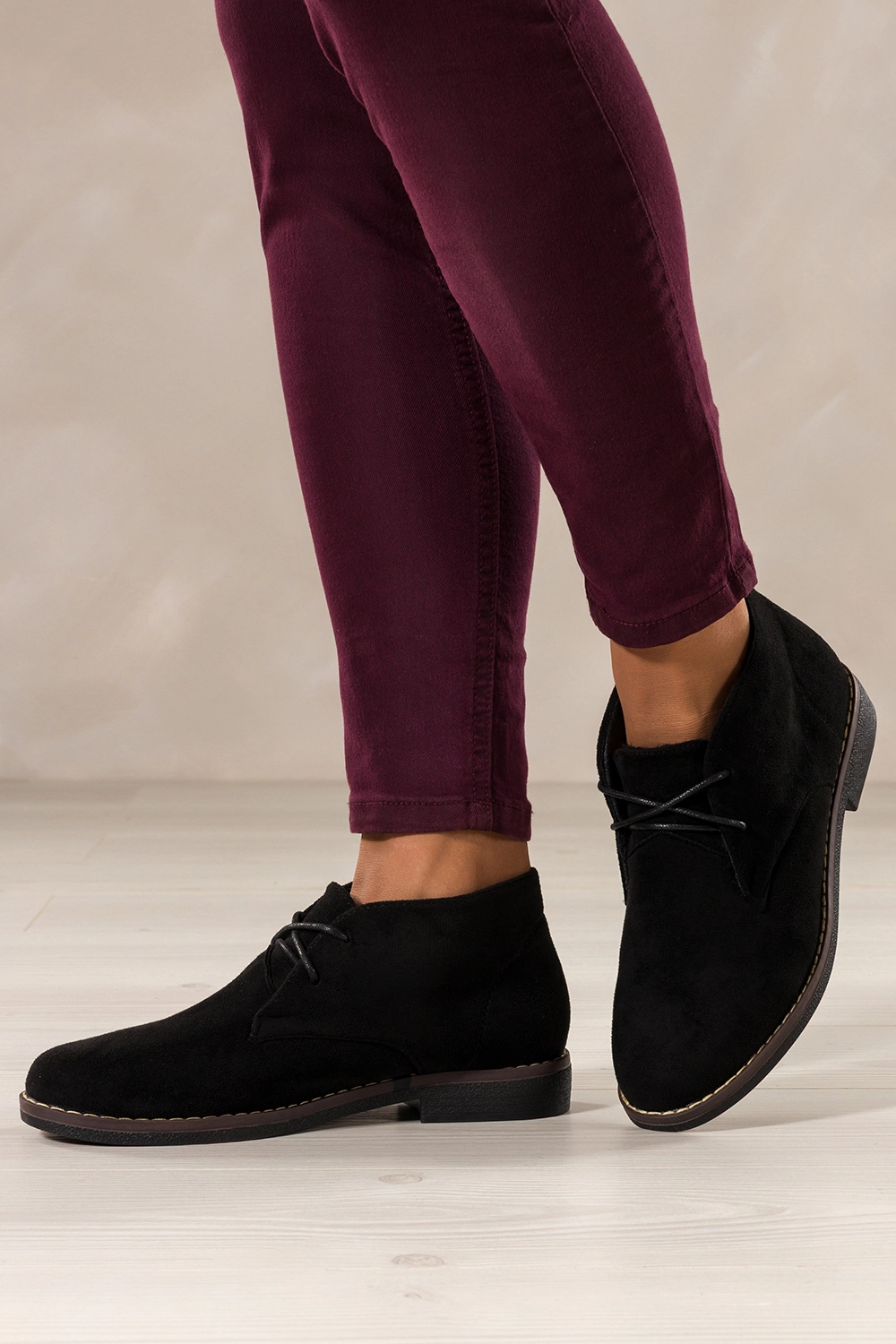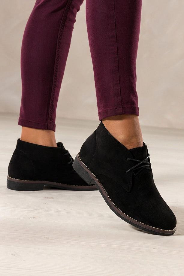 Czarne botki damskie na płaskiej podeszwie z przeszyciami sznurowane Casu model 8997-8 to doskonały wybór dla kobiet ceniących wygodę i styl w każdej sytuacji. Wykonane z wysokogatunkowego, miękkiego zamszu ekologicznego, gwarantują trwałość i odporność na codzienne użytkowanie. Wnętrze wyściełane ciepłym kocem obuwniczym zapewnia niezrównane poczucie ciepła nawet w chłodniejsze dni, a solidna płaska podeszwa z przeszyciem zwiększa stabilność i amortyzację podczas chodzenia.