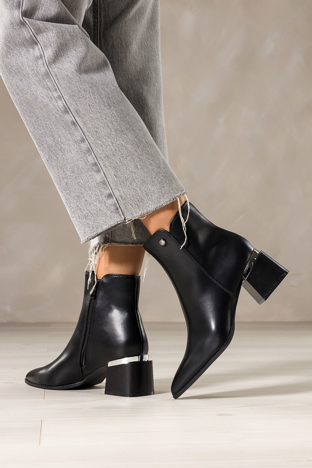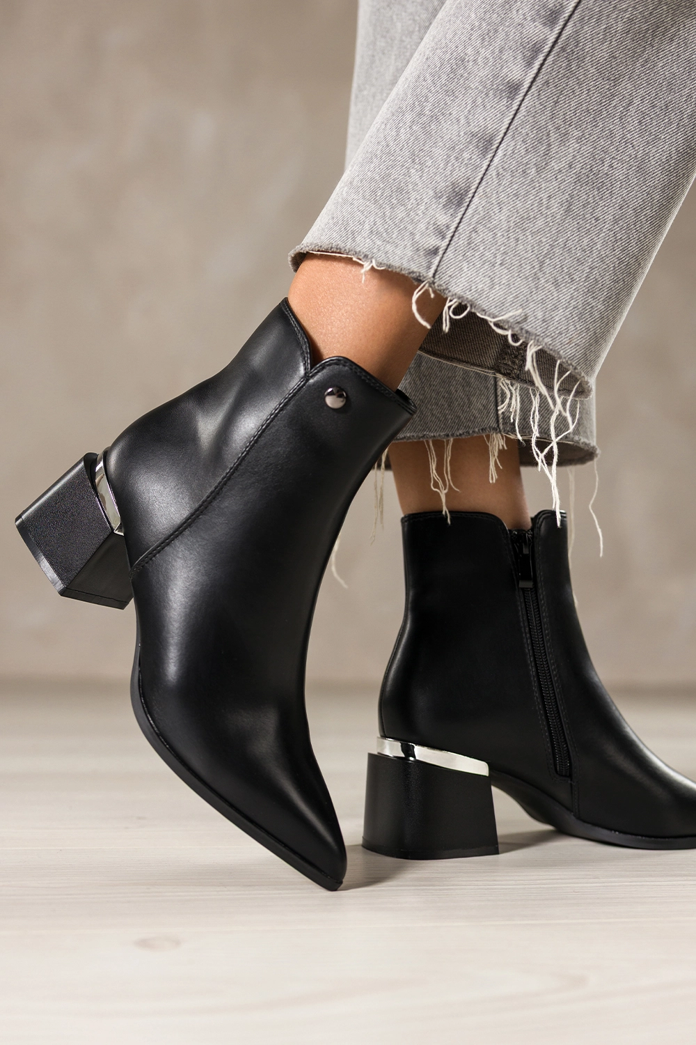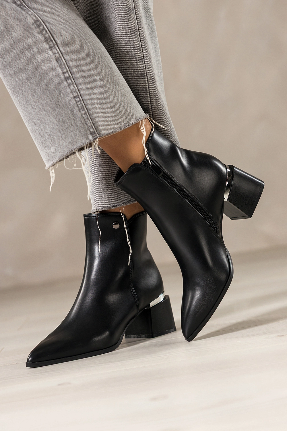 Dzięki smukłemu, szpiczastemu noskowi botki te dodają sylwetce lekkości i elegancji. Srebrna ozdoba w postaci stalowego kółeczka na wysokości kostki przyciąga spojrzenia, czyniąc ten model unikatowym wyborem dla kobiet ceniących detale. Zamek błyskawiczny ułatwia szybkie zakładanie, a dopracowane szwy podkreślają dbałość o każdy szczegół. Te botki bez trudu wpasują się zarówno w codzienne, jak i bardziej eleganckie stylizacje.
