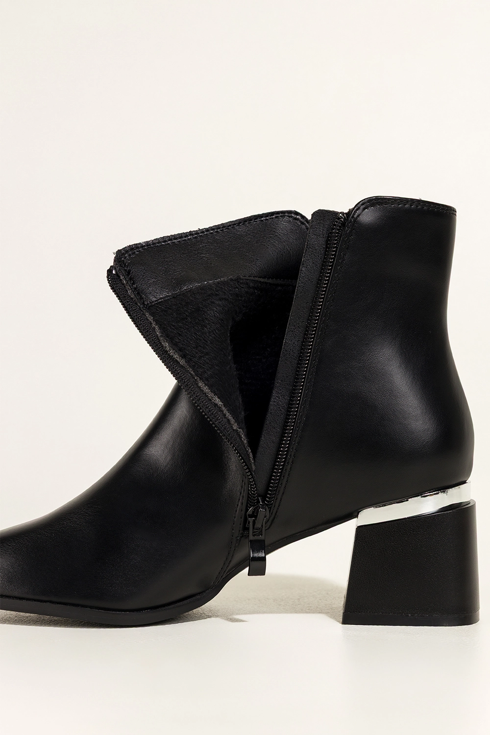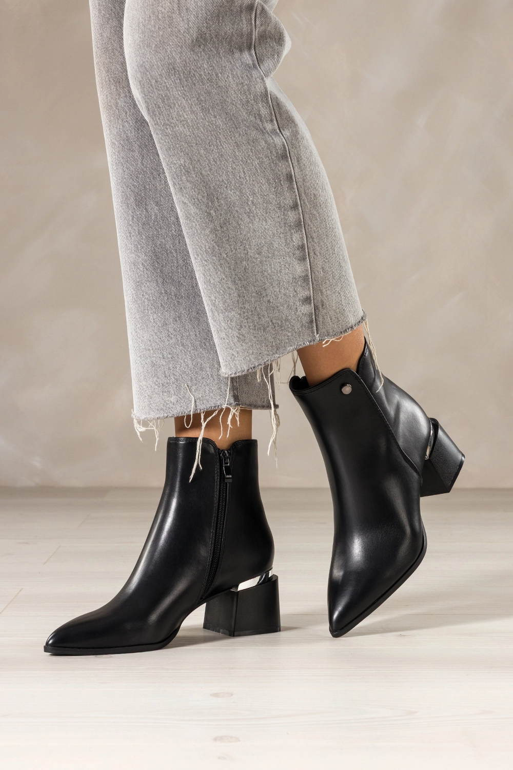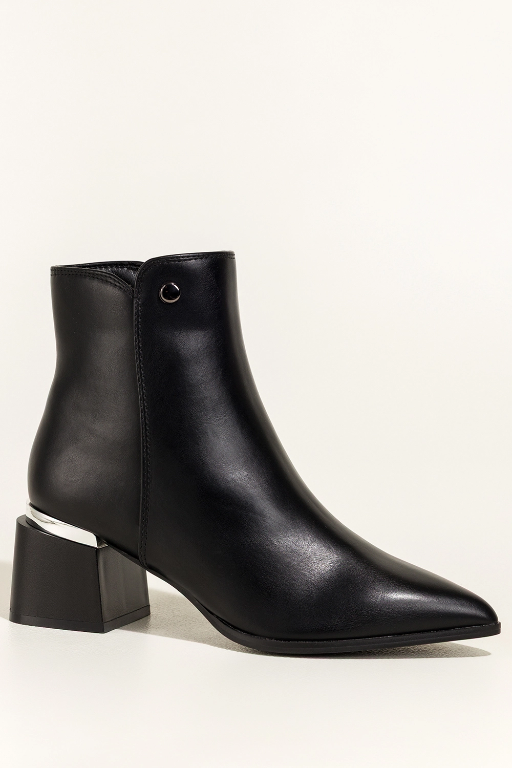 Dzięki smukłemu, szpiczastemu noskowi botki te dodają sylwetce lekkości i elegancji. Srebrna ozdoba w postaci stalowego kółeczka na wysokości kostki przyciąga spojrzenia, czyniąc ten model unikatowym wyborem dla kobiet ceniących detale. Zamek błyskawiczny ułatwia szybkie zakładanie, a dopracowane szwy podkreślają dbałość o każdy szczegół. Te botki bez trudu wpasują się zarówno w codzienne, jak i bardziej eleganckie stylizacje.