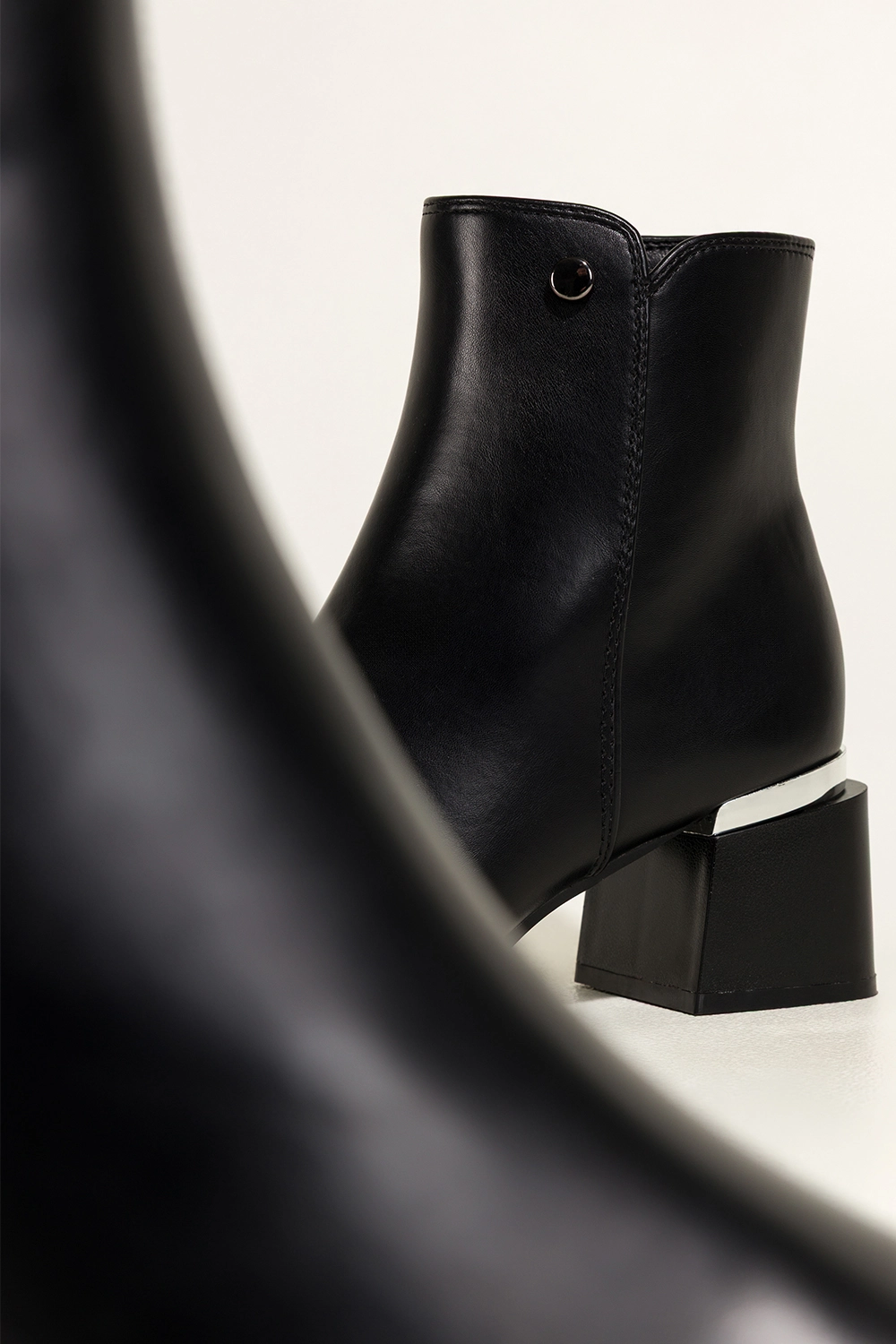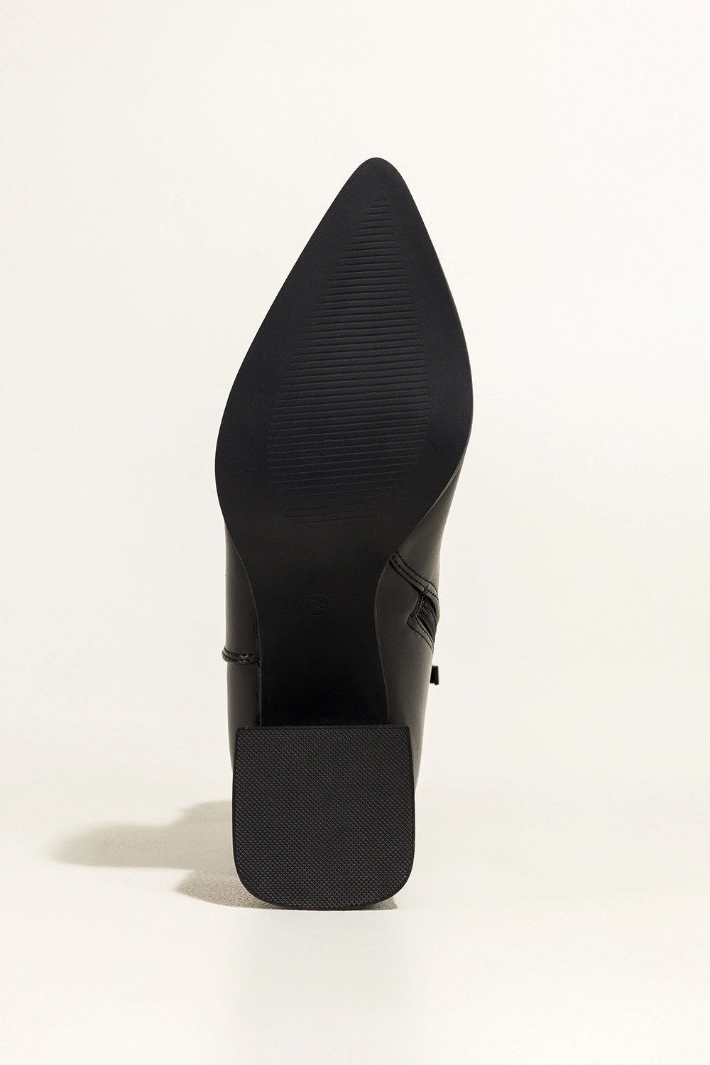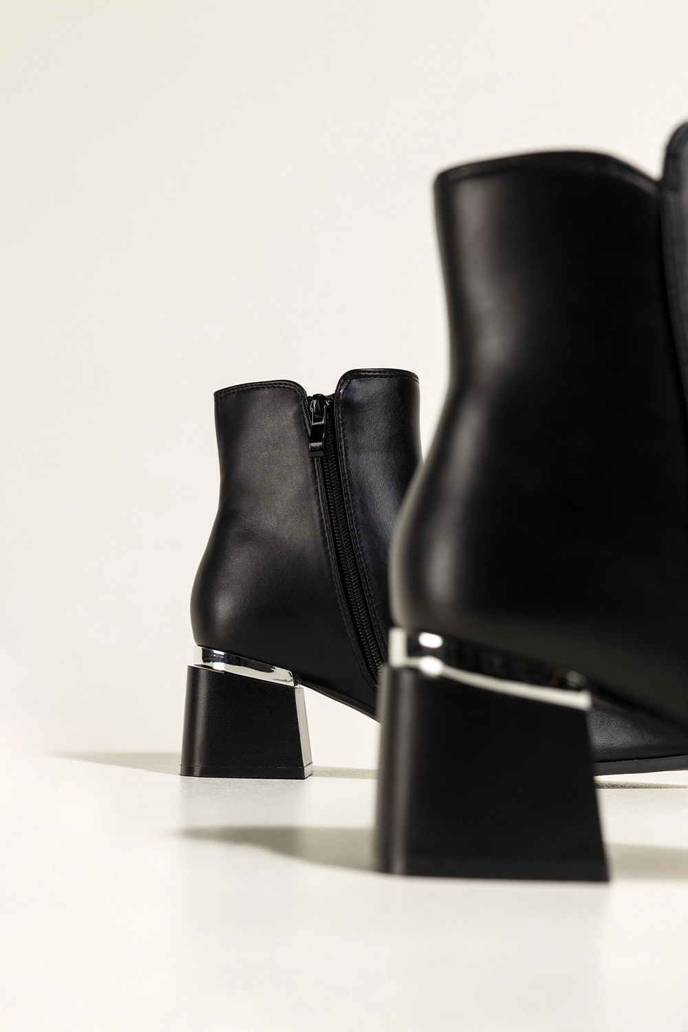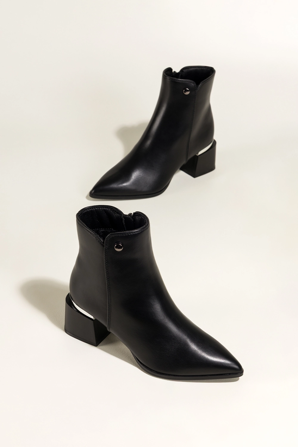 • Szpiczasty nosek i szeroki, stabilny obcas typu klocek