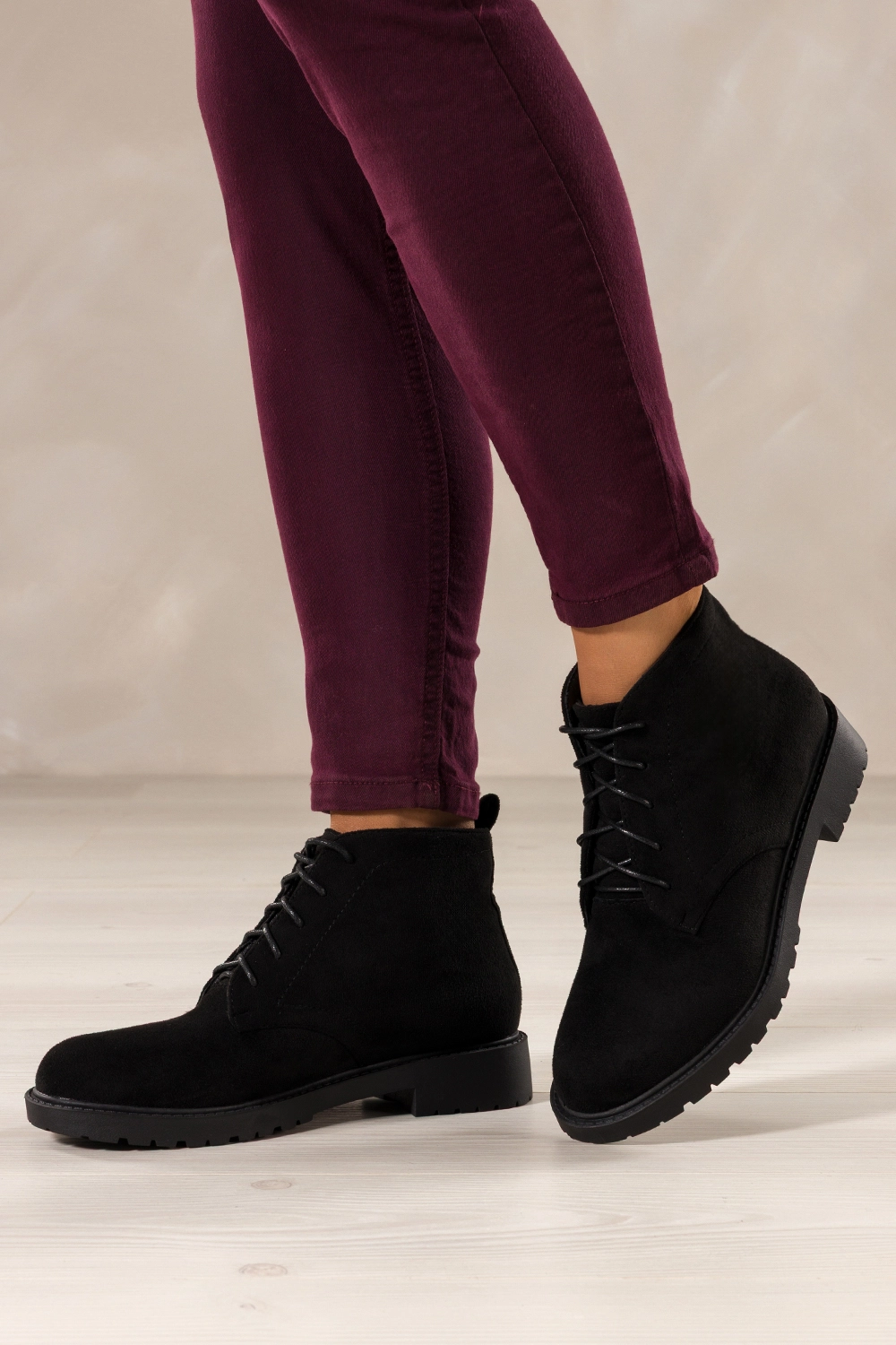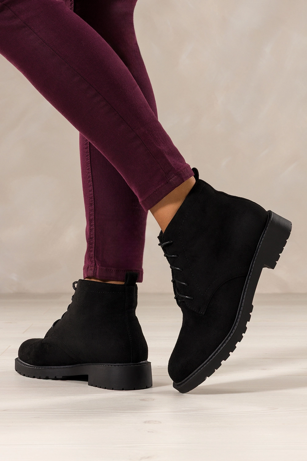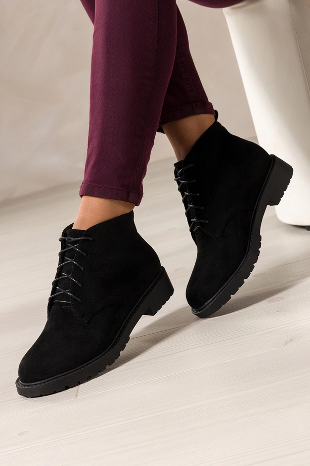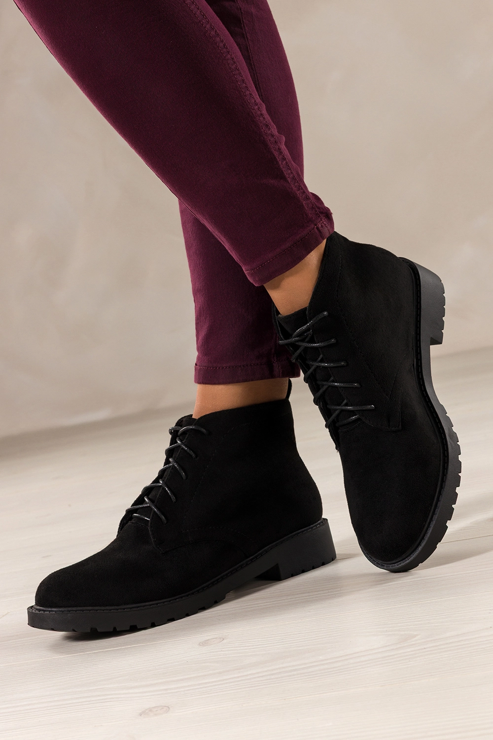 Czarne botki damskie na żłobionej podeszwie sznurowane Casu 8998-8, to perfekcyjne połączenie stylu i funkcjonalności. Wykonane z miękkiego, wysokogatunkowego zamszu ekologicznego, zapewniają wygodę użytkowania i trwałość nawet przy intensywnym użytkowaniu. Ocieplone przyjemnym w dotyku kocem obuwniczym, gwarantują ciepło w chłodne dni, jednocześnie pozostając lekkie i przewiewne. Solidna żłobiona platforma nadaje im charakteru i zwiększa przyczepność na śliskich nawierzchniach.