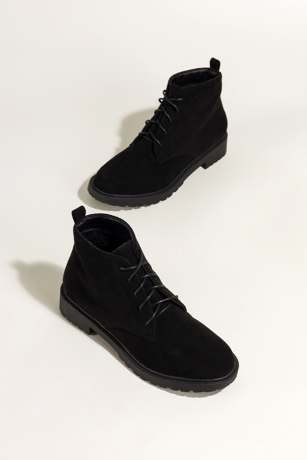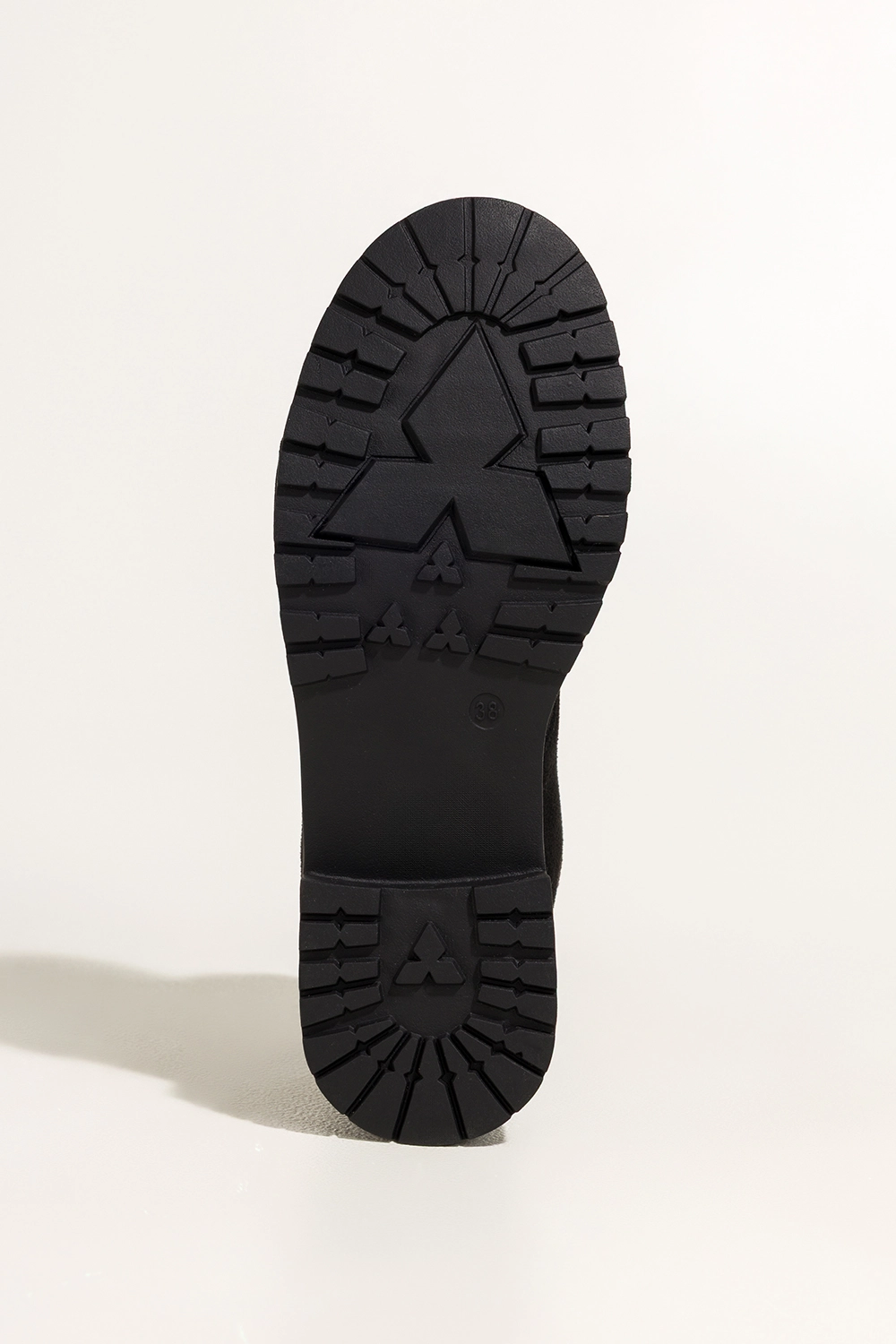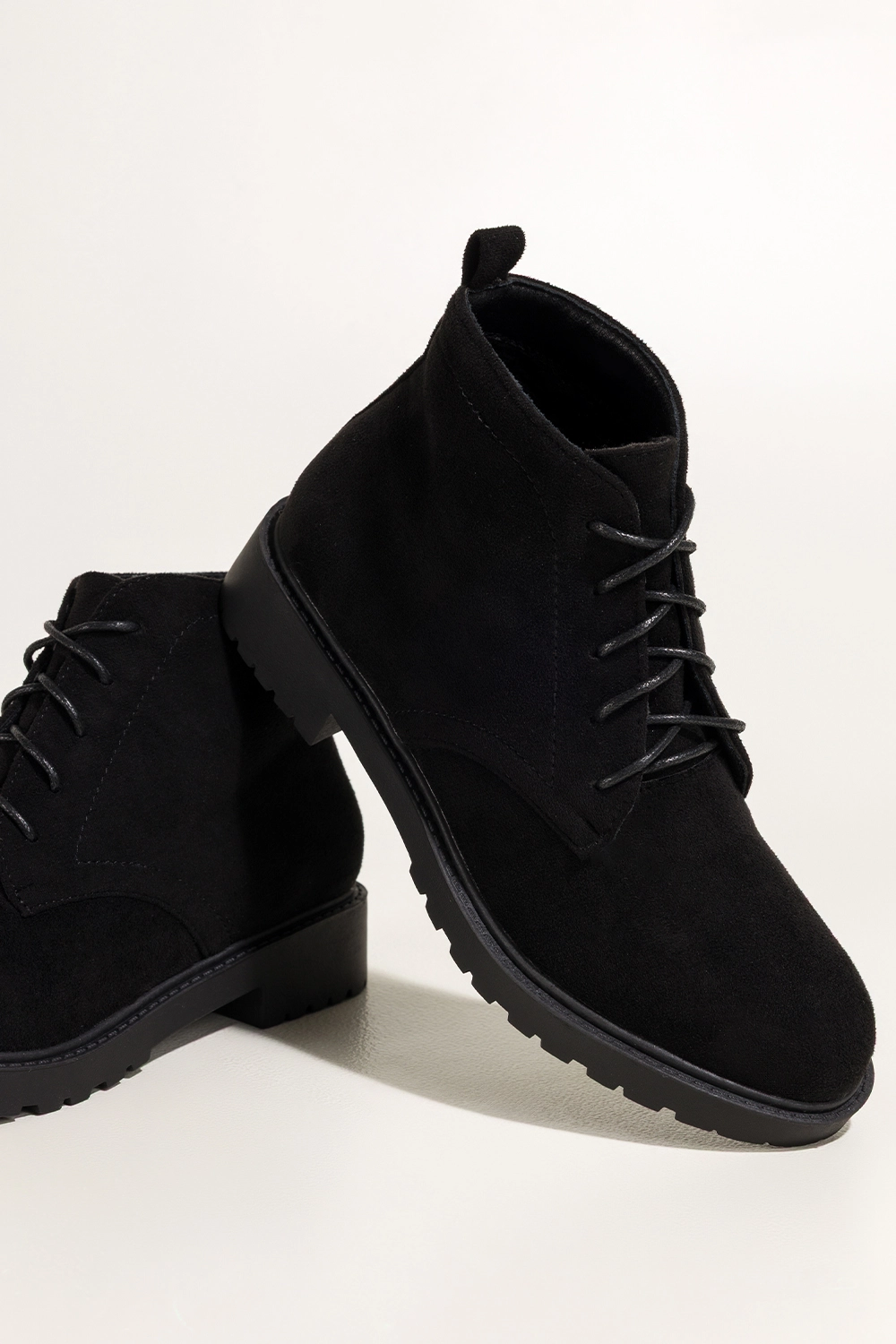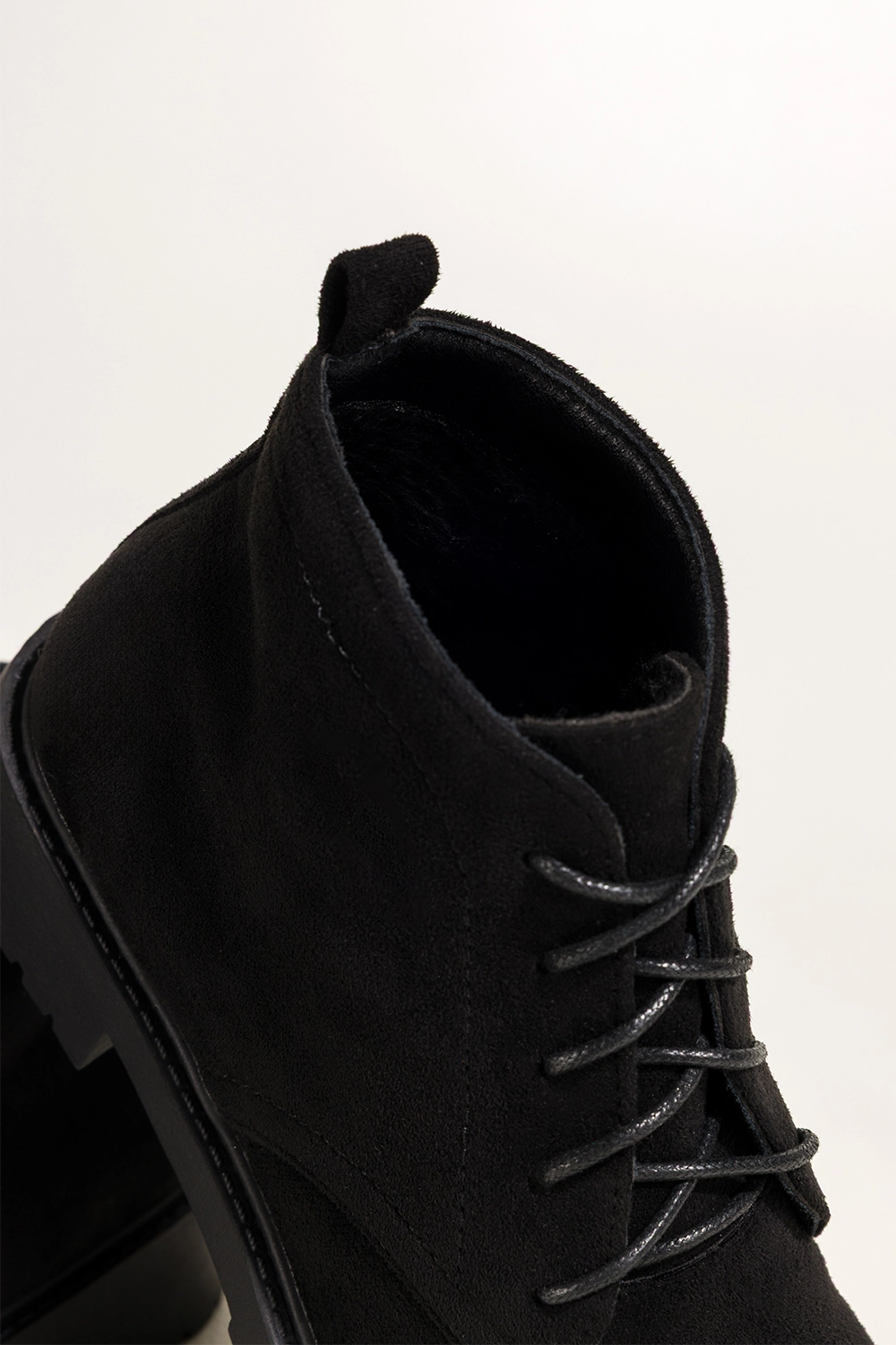 Czarne botki damskie na żłobionej podeszwie sznurowane Casu 8998-8, to perfekcyjne połączenie stylu i funkcjonalności. Wykonane z miękkiego, wysokogatunkowego zamszu ekologicznego, zapewniają wygodę użytkowania i trwałość nawet przy intensywnym użytkowaniu. Ocieplone przyjemnym w dotyku kocem obuwniczym, gwarantują ciepło w chłodne dni, jednocześnie pozostając lekkie i przewiewne. Solidna żłobiona platforma nadaje im charakteru i zwiększa przyczepność na śliskich nawierzchniach.