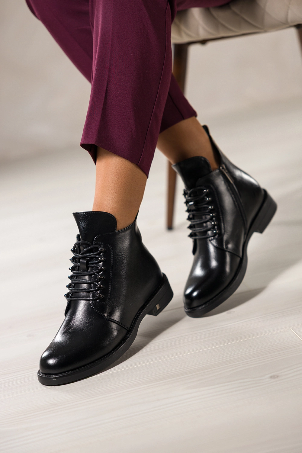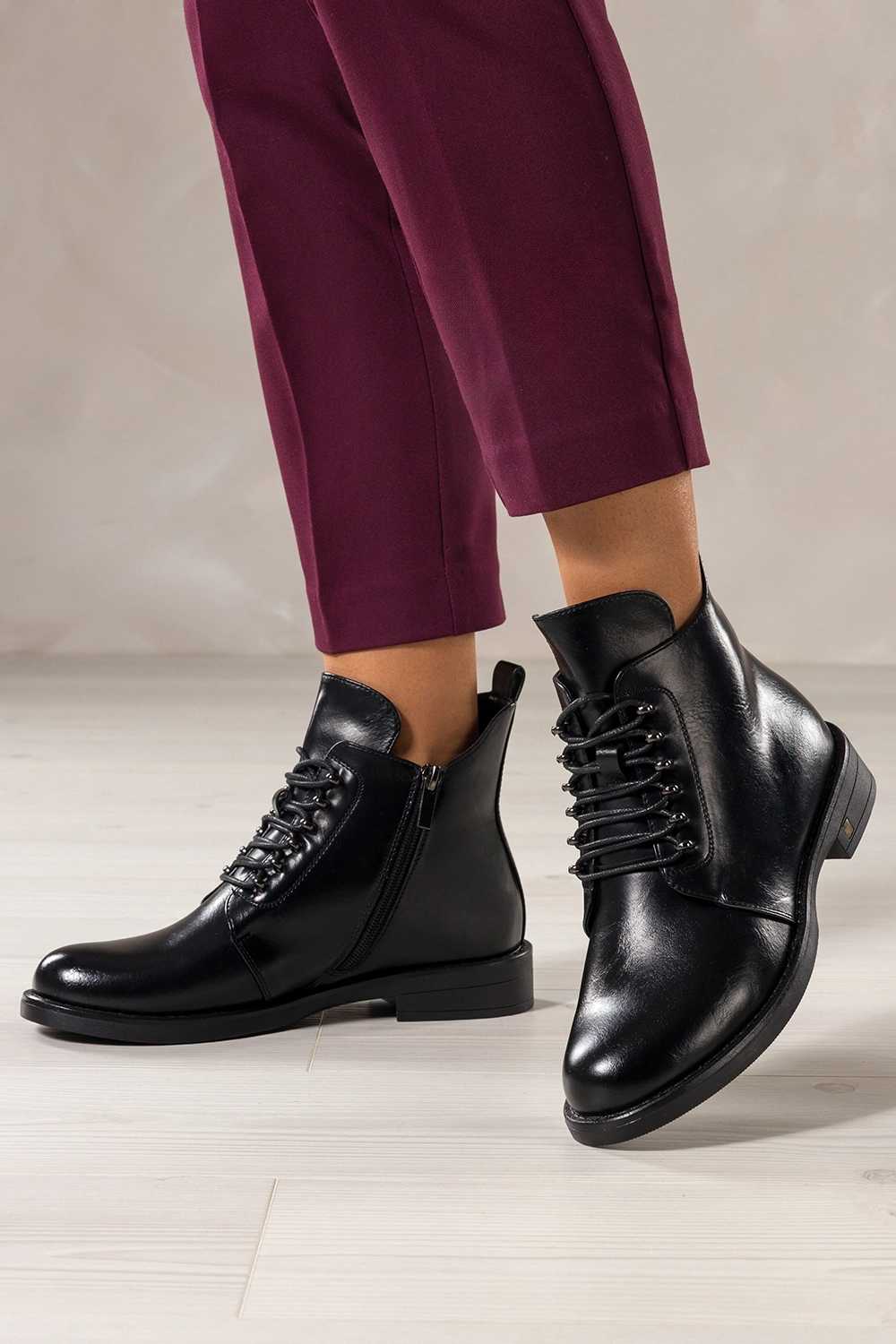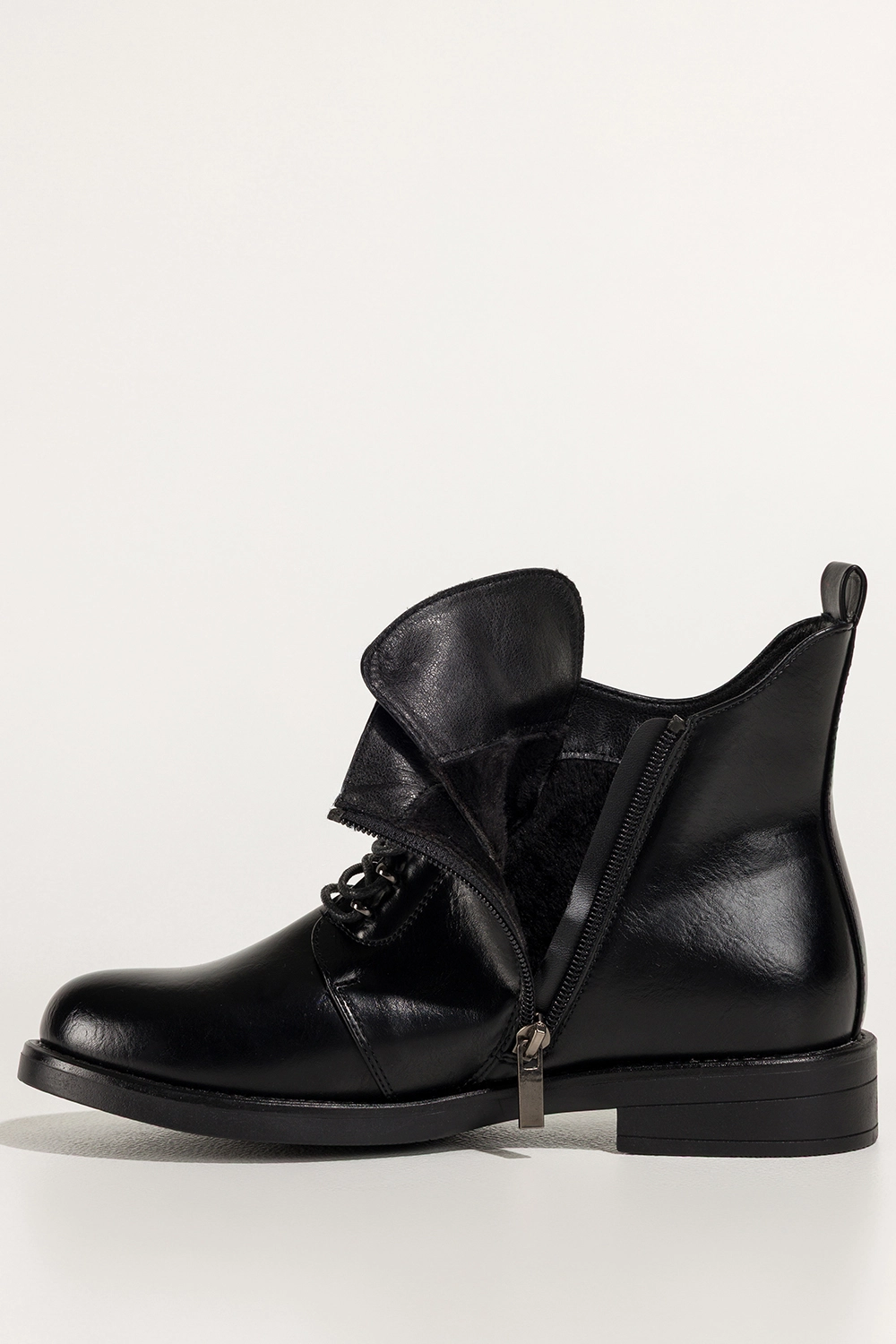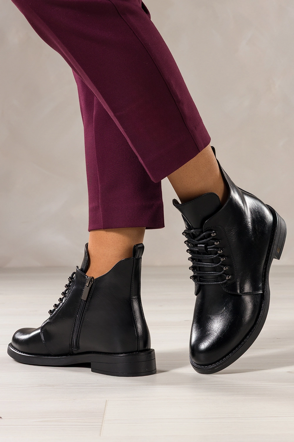 Jakość wykonania i komfort na najwyższym poziomie to jedna z głównych zalet tego modelu. Skóra ekologiczna użyta do produkcji botków charakteryzuje się wysoką jakością. Miękka wkładka z futerkiem oraz delikatne ocieplenie całego wnętrza gwarantują wygodę nawet podczas długich spacerów w chłodne dni. Płaska podeszwa oraz szeroki obcas o wysokości 3 cm zapewniają stabilność i komfort chodzenia, niezależnie od nawierzchni. Zaokrąglony nosek dodaje kobiecej subtelności, a jednocześnie pozwala na swobodny ruch palców, co zapobiega zmęczeniu stóp. Botki zapinane są na praktyczny zamek błyskawiczny, dzięki czemu ich zakładanie i zdejmowanie jest szybkie i bezproblemowe. Sznurowanie dodatkowo pozwala na dopasowanie cholewki do szerokości stopy, co zwiększa komfort użytkowania.