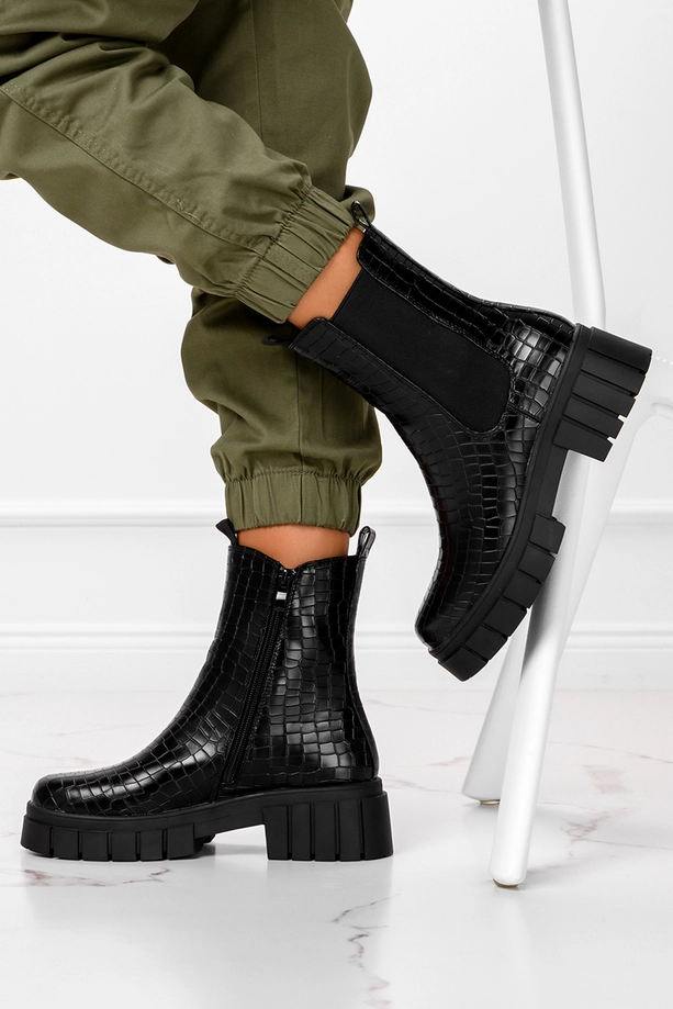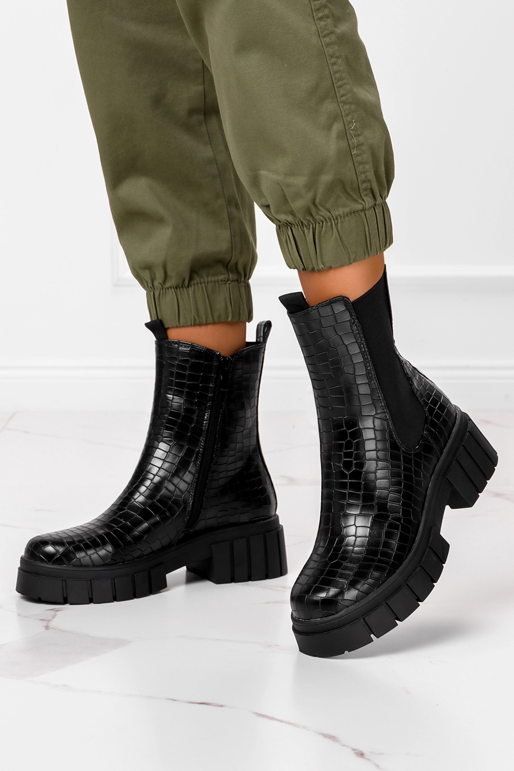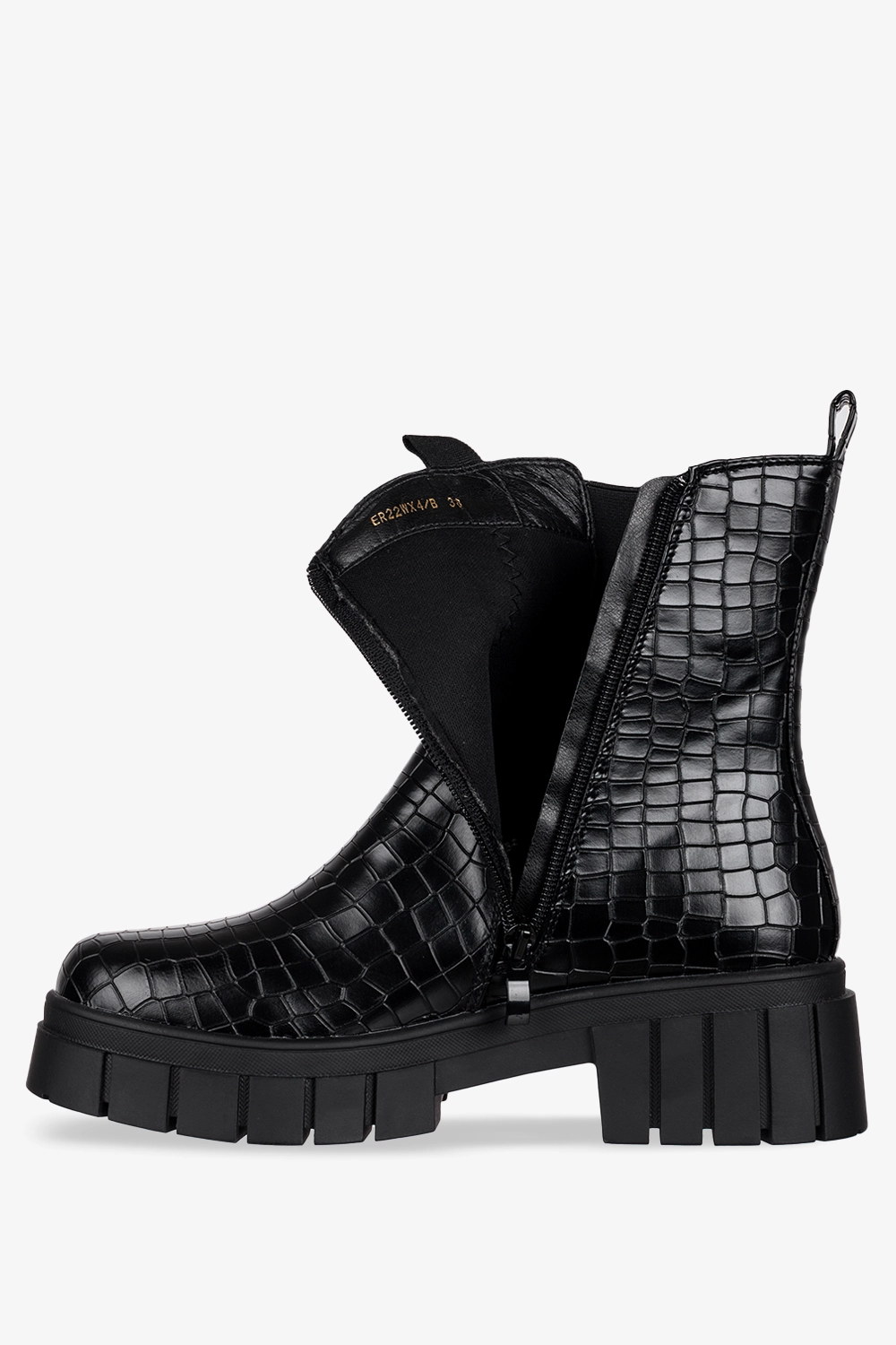 Czarne botki na platformie damskie z gumkami po bokach wzór wężowy Casu ER22WX4-B
