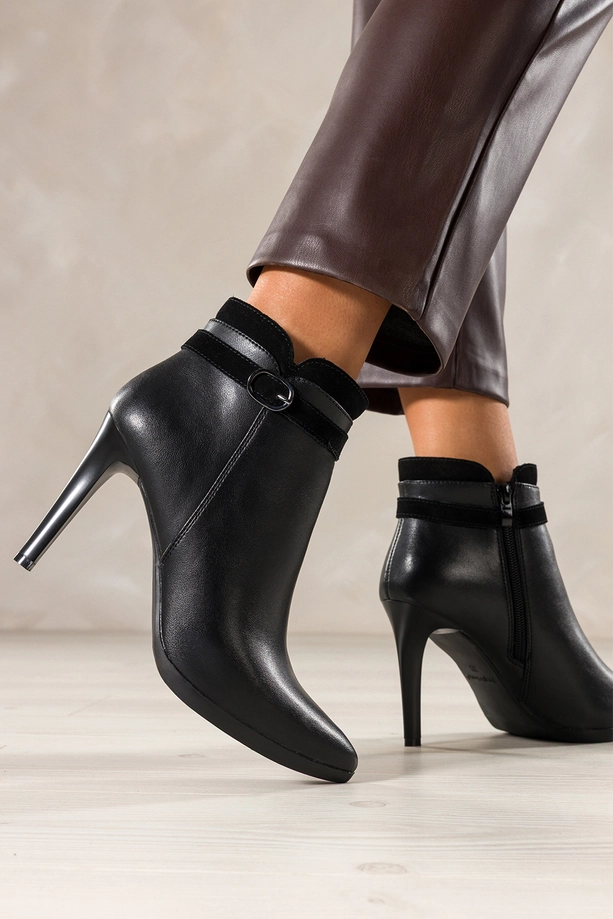 Czarne botki skórzane damskie Sergio Leone na szpilce ozdobny pasek ze stalową klamrą model YG74768-H. Wykonane z wysokogatunkowej, naturalnej skóry gwarantują trwałość i doskonałe dopasowanie do stopy. Ocieplane wnętrze z miękkiego koca obuwniczego zapewnia komfort termiczny w chłodniejsze dni, jednocześnie nie rezygnując z lekkości i wygody noszenia. Obcas w formie zgrabnej szpilki dodaje sylwetce smukłości, a szpiczasty nosek optycznie wydłuża nogę, podkreślając kobiecą elegancję.