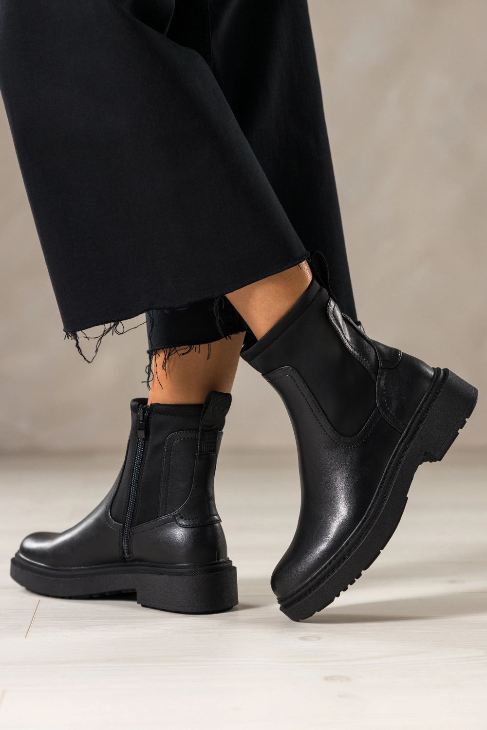 Czarne botki skórzane damskie Sergio Leone na żłobionej platformie elastyczna cholewka model YG74572-H, to wyjątkowa jakość. Wykonane z wysokogatunkowej, naturalnej skóry, gwarantują trwałość oraz idealne dopasowanie do kształtu stopy. Wnętrze wyściełane miękkim kocem obuwniczym zapewnia komfort cieplny nawet w najchłodniejsze dni. Starannie wyprofilowany zaokrąglony nosek dodaje subtelnej elegancji, a zamek błyskawiczny ułatwia szybkie zakładanie i zdejmowanie obuwia. To obuwie, które pokocha każda kobieta ceniąca wygodę bez kompromisów.