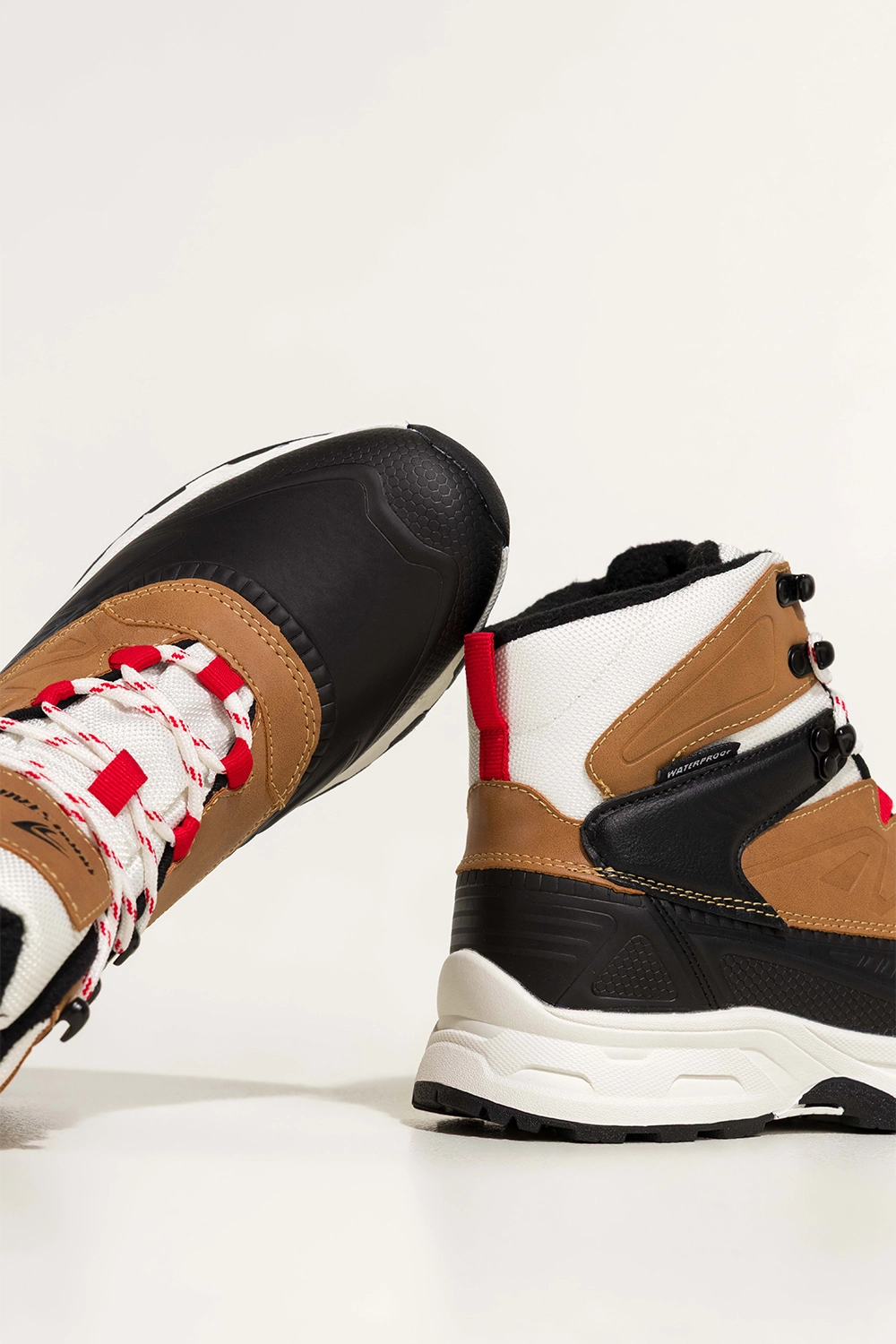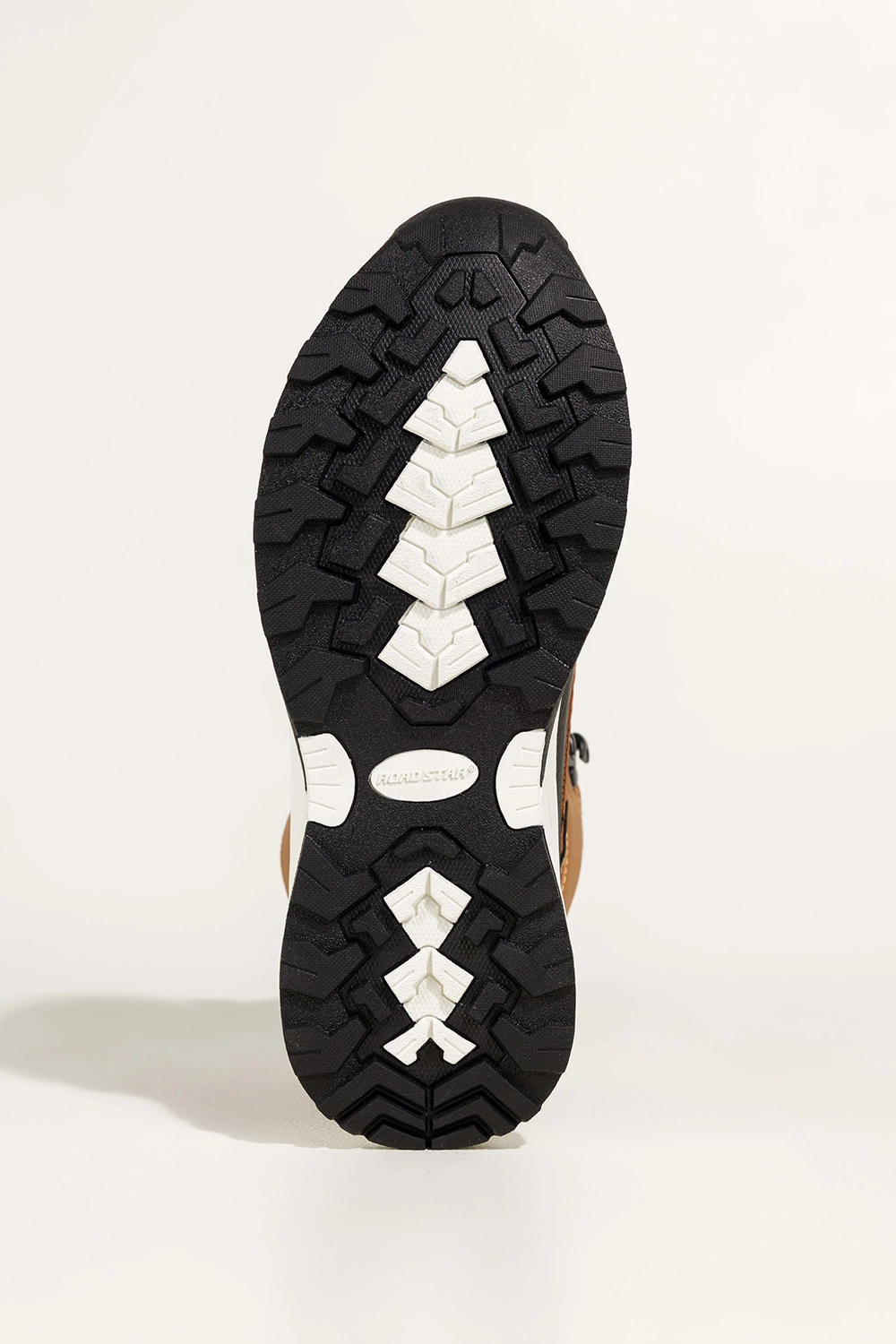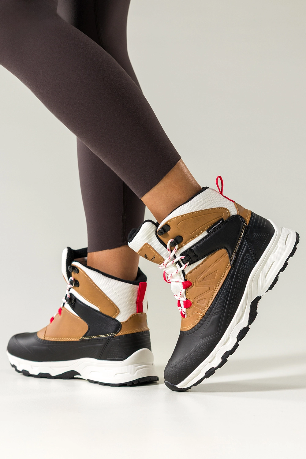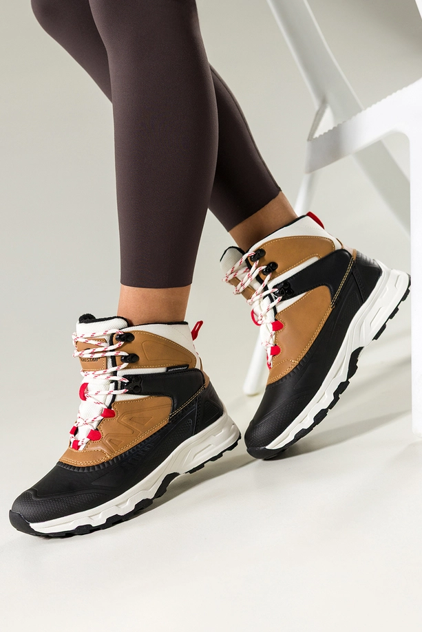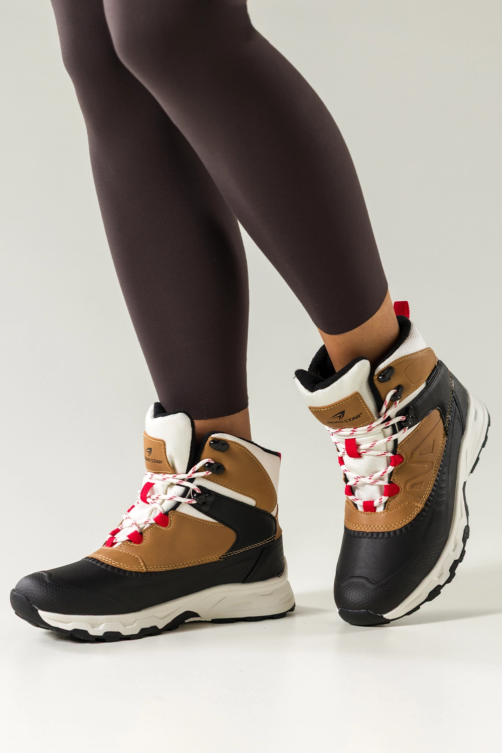Białe i camelowe wstawki na czarnej cholewce dodają mu charakteru i nowoczesnego wyrazu. Dzięki zaokrąglonemu noskowi oraz wysokiej cholewce, buty doskonale dopasowują się do kształtu stopy, gwarantując wygodę przez cały dzień. To idealny wybór zarówno do miejskich stylizacji, jak i na piesze wyprawy, gdy liczy się komfort, przyczepność i styl.