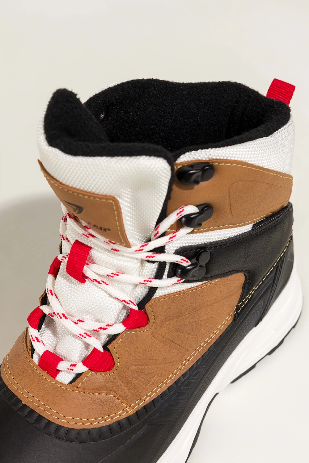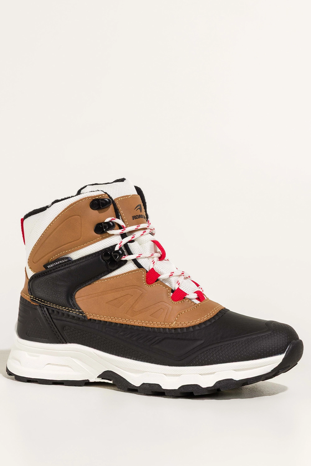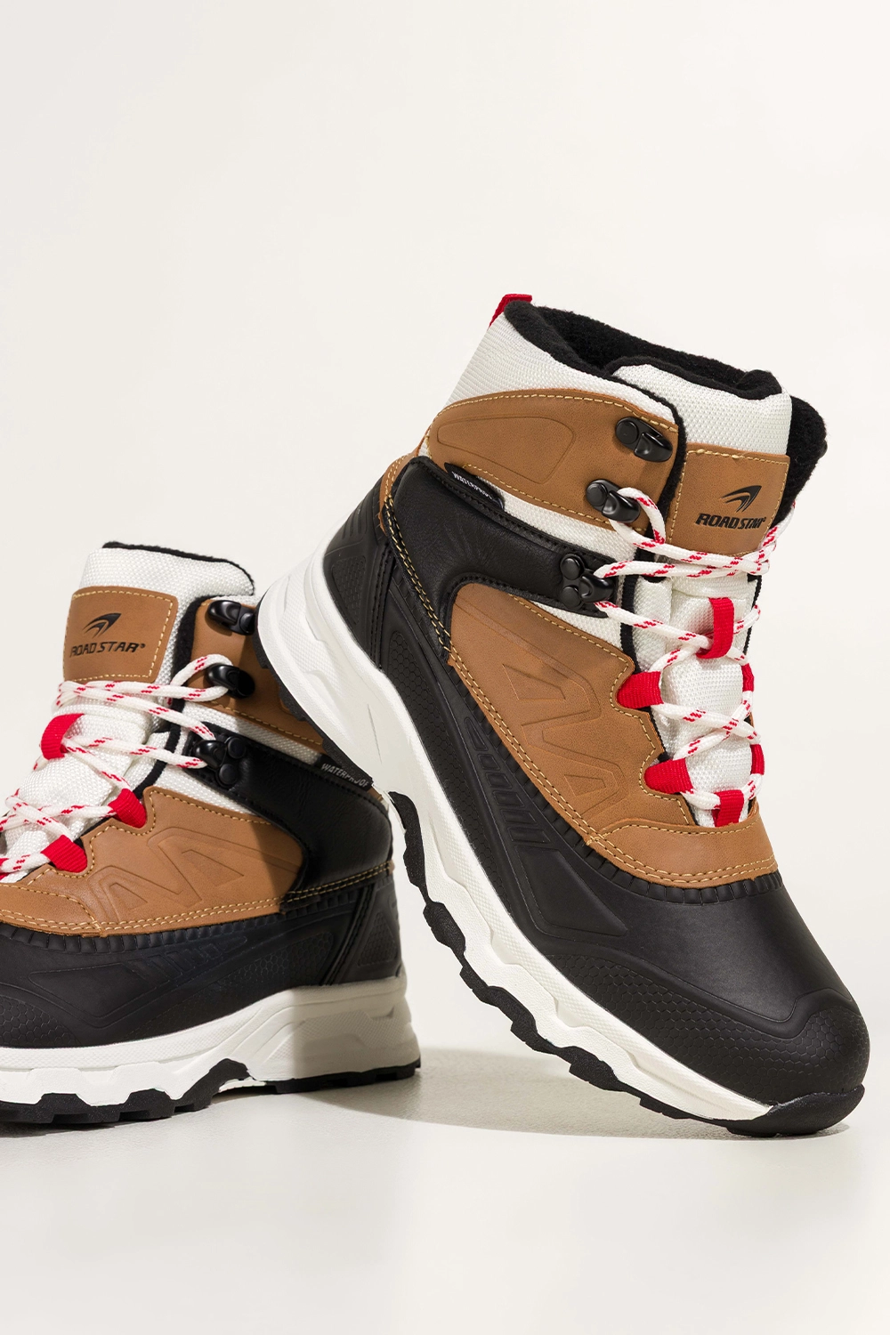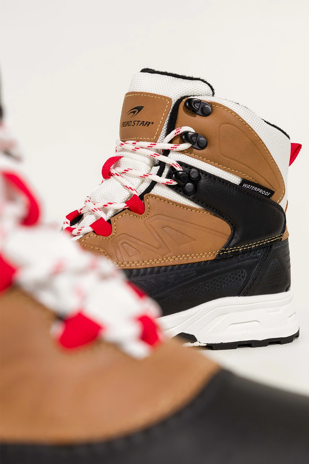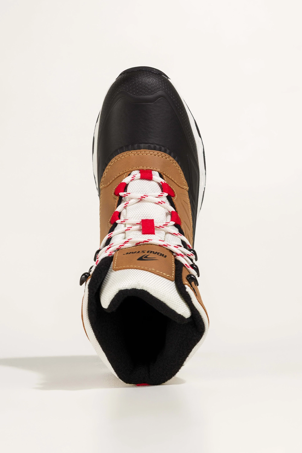 Białe i camelowe wstawki na czarnej cholewce dodają mu charakteru i nowoczesnego wyrazu. Dzięki zaokrąglonemu noskowi oraz wysokiej cholewce, buty doskonale dopasowują się do kształtu stopy, gwarantując wygodę przez cały dzień. To idealny wybór zarówno do miejskich stylizacji, jak i na piesze wyprawy, gdy liczy się komfort, przyczepność i styl.