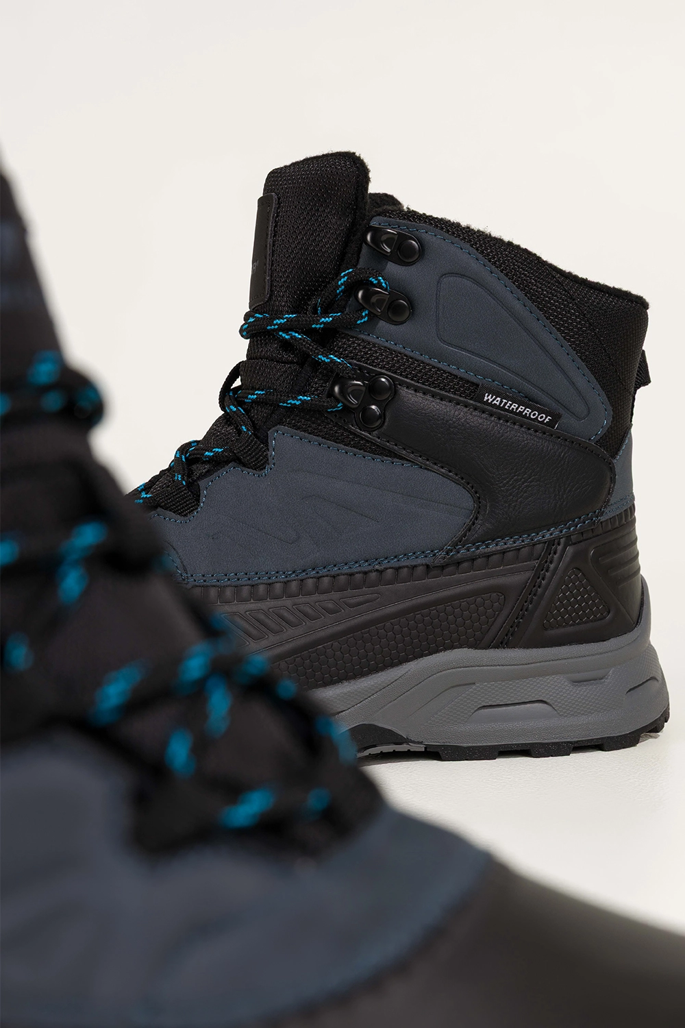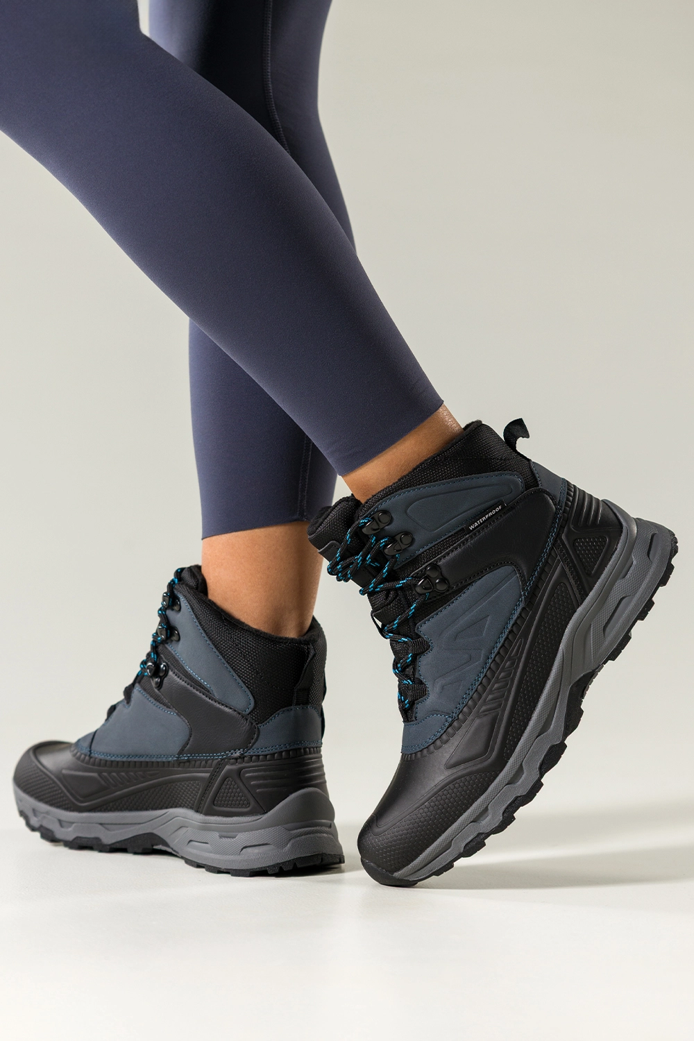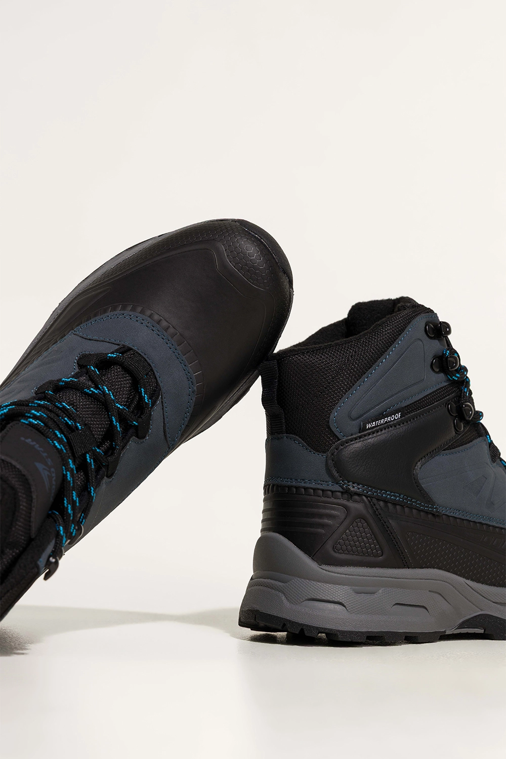 Bieżnikowana podeszwa zapewnia doskonałą przyczepność na śliskich i nierównych powierzchniach, co czyni je niezastąpionym wyborem na trekking, spacery po lesie, górskie wycieczki czy codzienne jesienno-zimowe stylizacje. Wysoka cholewka chroni kostkę, zapobiegając urazom, a klasyczna czerń z akcentami w granacie sprawia, że z łatwością dopasujesz je do każdej outdoorowej garderoby.